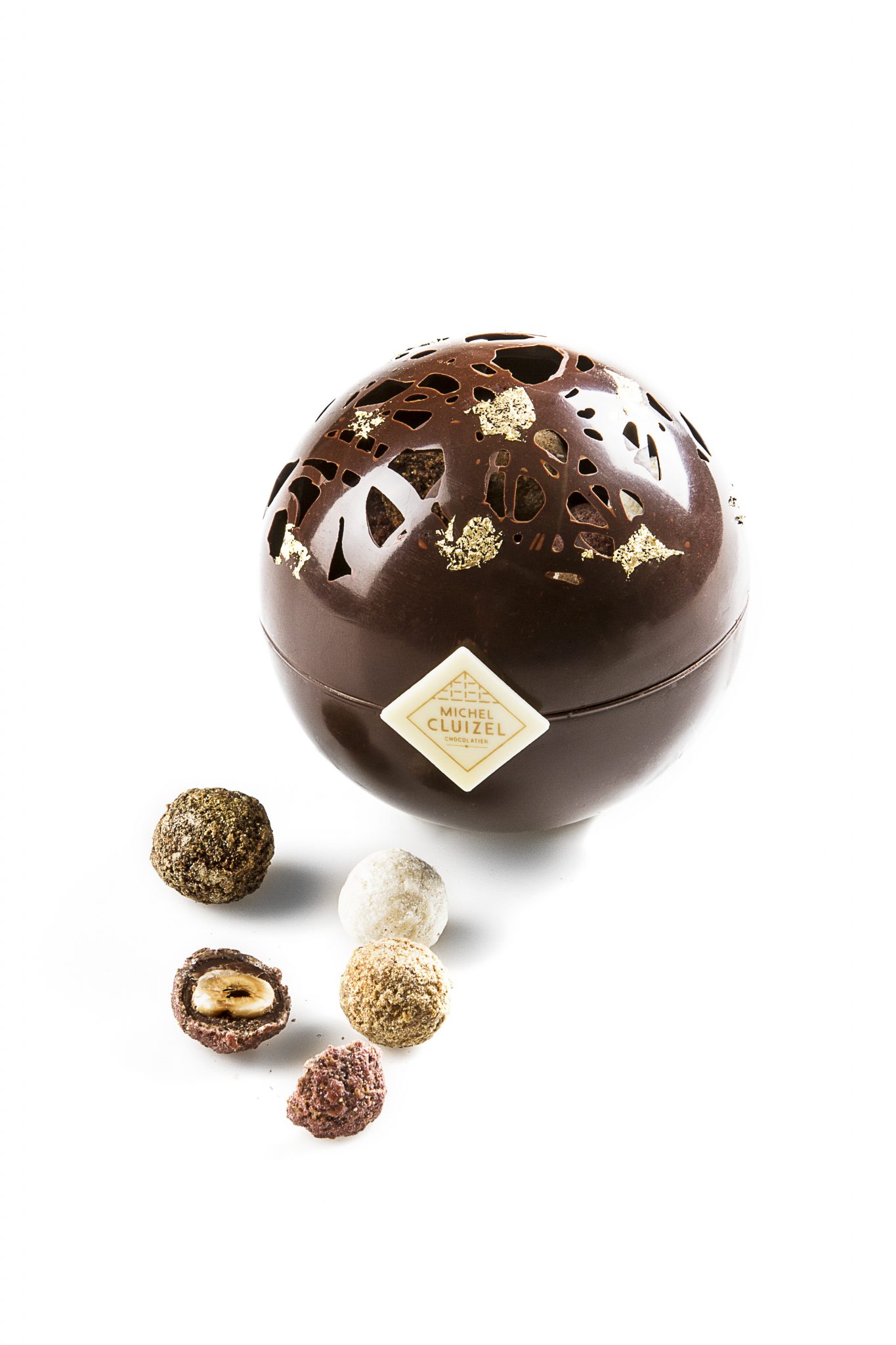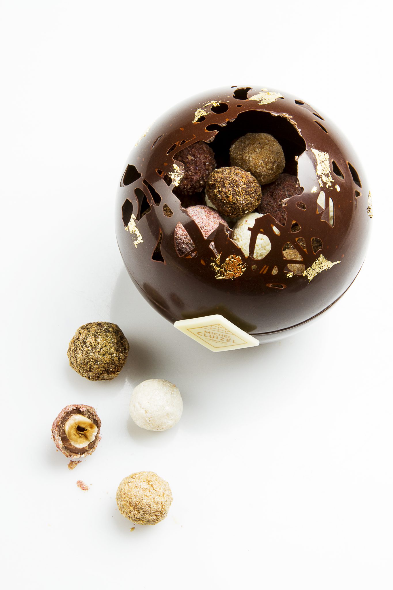 Cluizel a réalisé un véritable travail d’orfèvre pour créer cette boule Scintillante. De l’envie d’innover, alliée à la maitrise du travail du chocolat et à la minutie des équipes de Damville, est née cette pièce artistique de précision, après plusieurs mois de recherche. Composée d’une sphère en chocolat noir 72% délicatement ajourée et décorée à l’or fin, la Boule Scintillante est garnie de noisettes torréffiées enrobées de gianduja et chocolat aux savoureux parfums : fleur de sel, framboise, citron feuilleté et noix de coco.