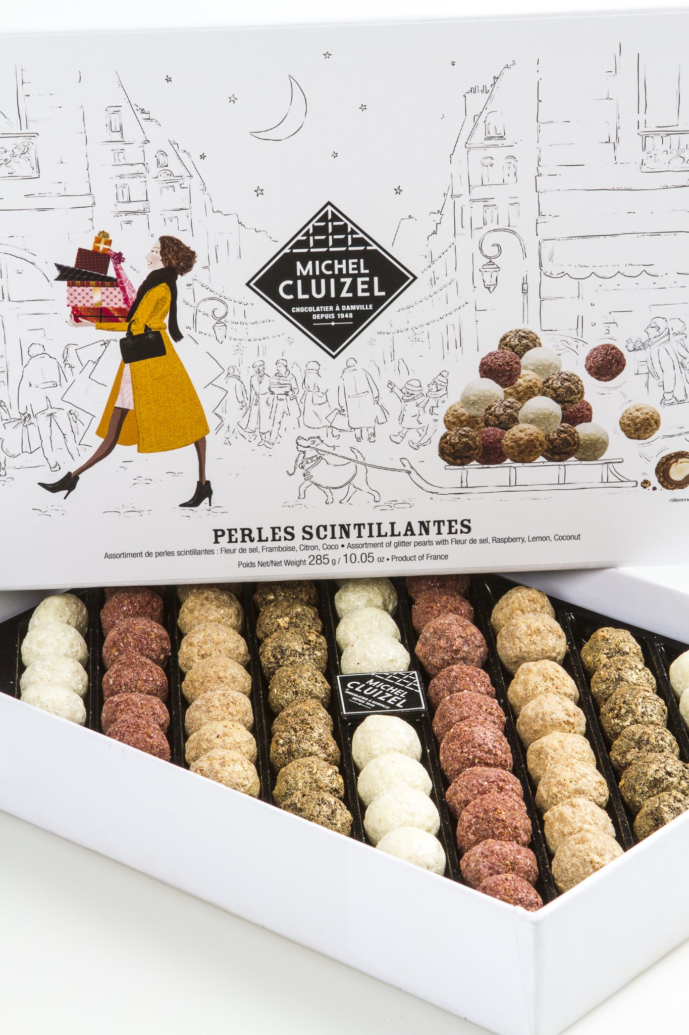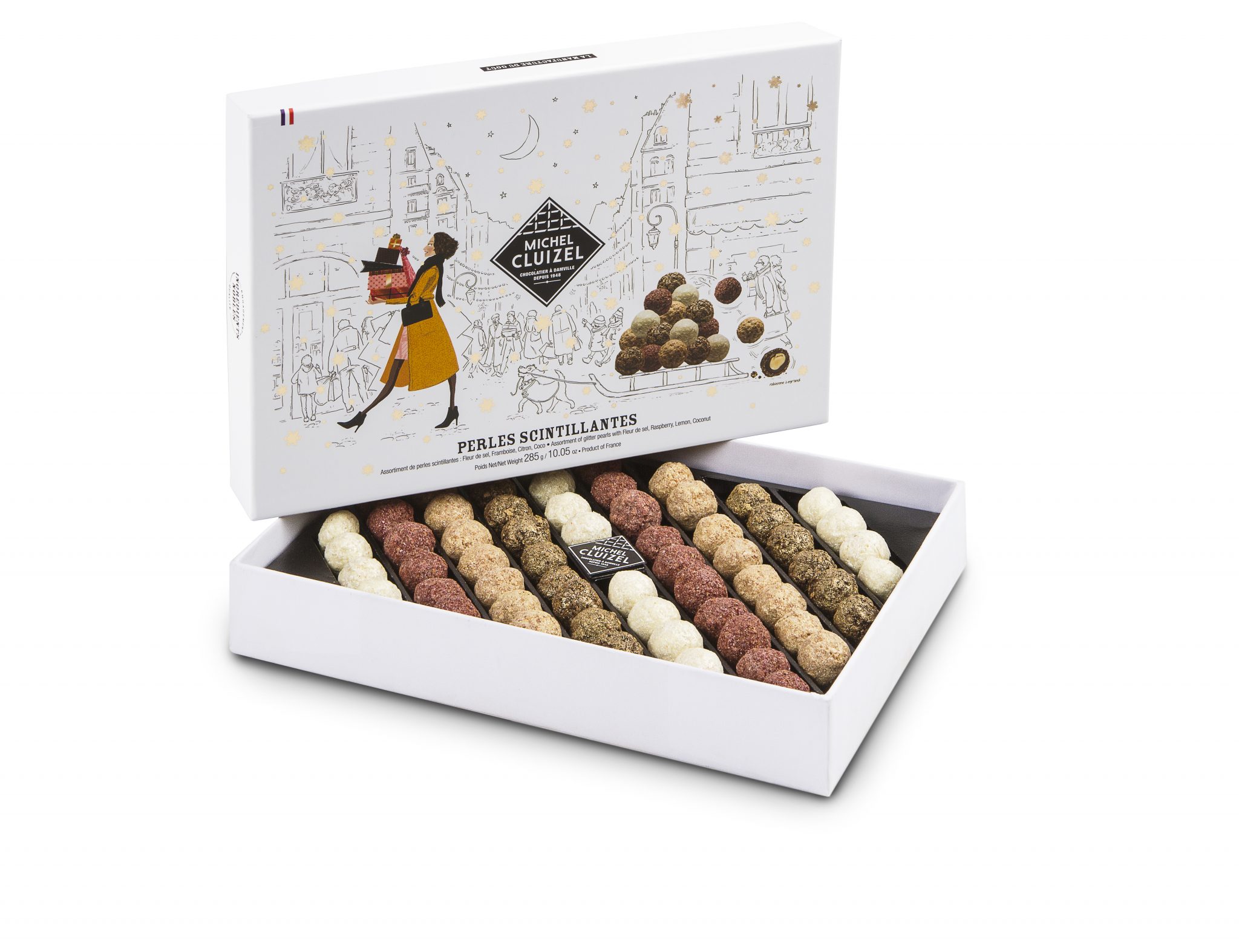 L’ouverture de cet élégant coffret, illustré des inspirations parisiennes de Fabienne Legrand, révèle de délicates perles en habits de fêtes. CLUIZEL innove une nouvelle fois en sublimant la noisette torreffiée recouverte de gianduja, puis de chocolat pour obtenir un goût équilibré, clin d’œil au praliné. Côté saveurs, les Perles Scintillantes se déclinent à la fleur de sel, à la framboise, au citron feuilleté ou à la noix de coco, pour une dégustation riche en goûts ! A déposer au pied du sapin, ou à partager en famille en attendant Noël, ce coffret en édition limitée est l’incontournable des Fêtes de fin d’année chic et chocolatées.