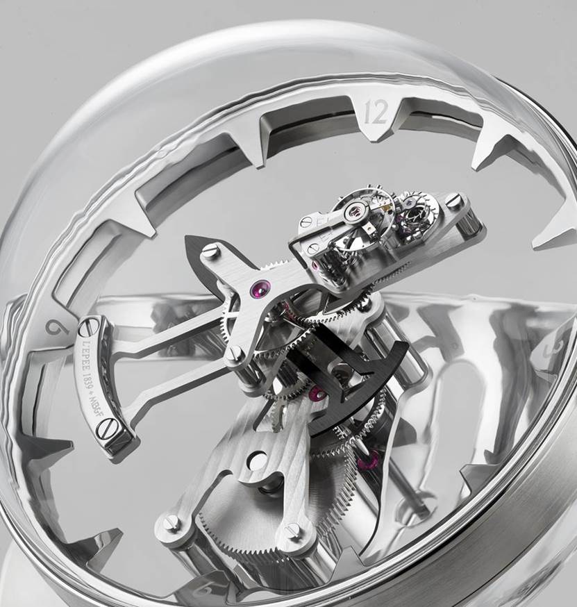Conçu par MB&F et manufacturé par L’Epée 1839, Octopod se dresse ou s’accroupit grâce à ses huit pattes articulées. Dans sa tête complètement transparente, articulée comme un chronomètre de marine traditionnel à cardan, le cerveau de la créature est mystérieusement suspendu à l’intérieur de la sphère – la base du mouvement est virtuellement invisible, grâce à une plaque de verre traité antireflets. L’Epée a développé pour Octopod un mouvement entièrement nouveau, avec un échappement tournant placé sur l’aiguille des minutes.