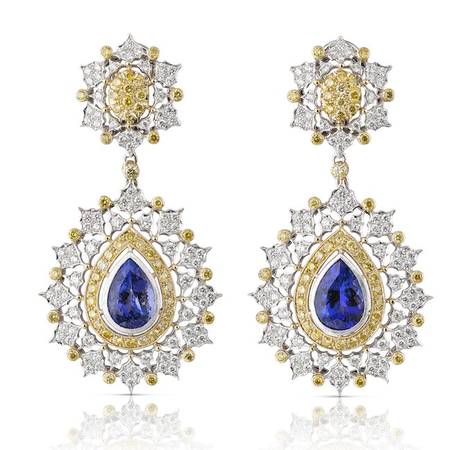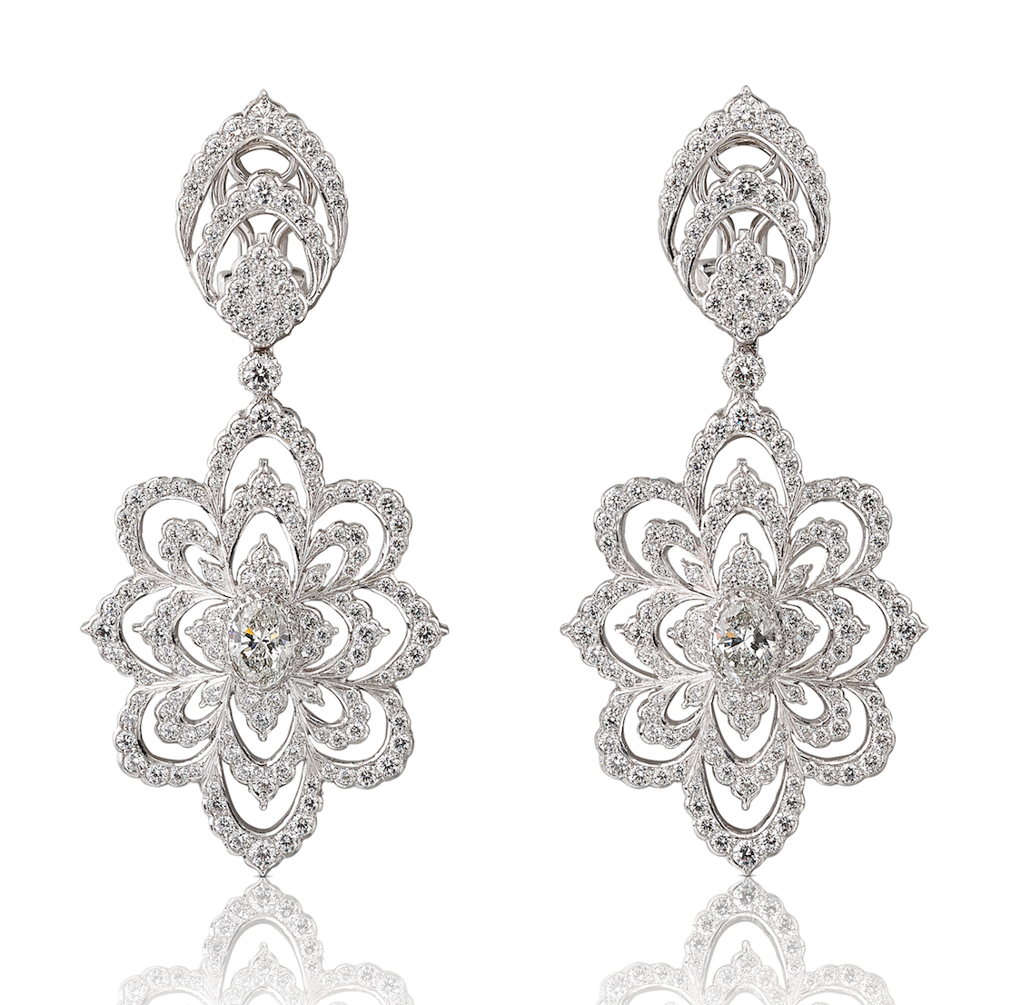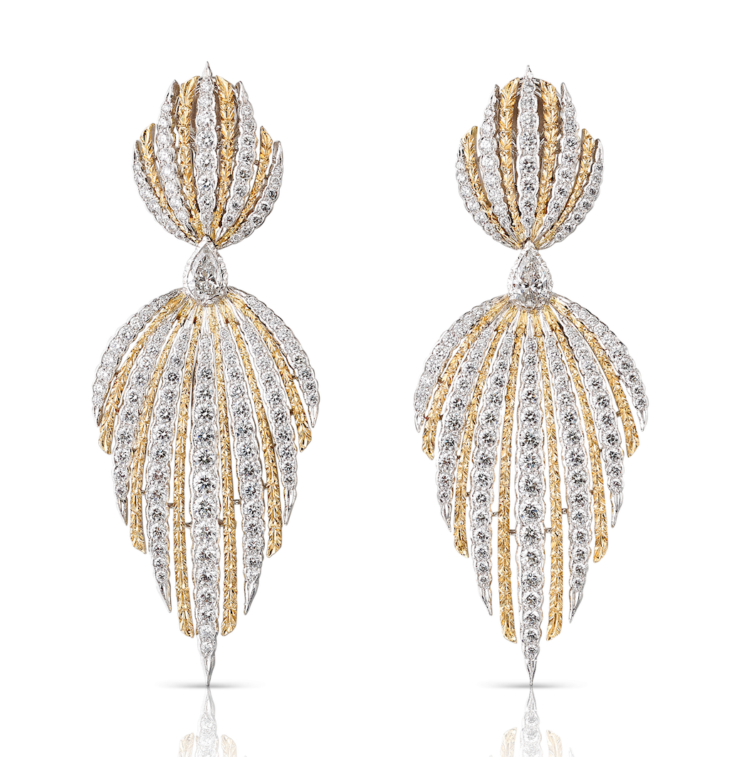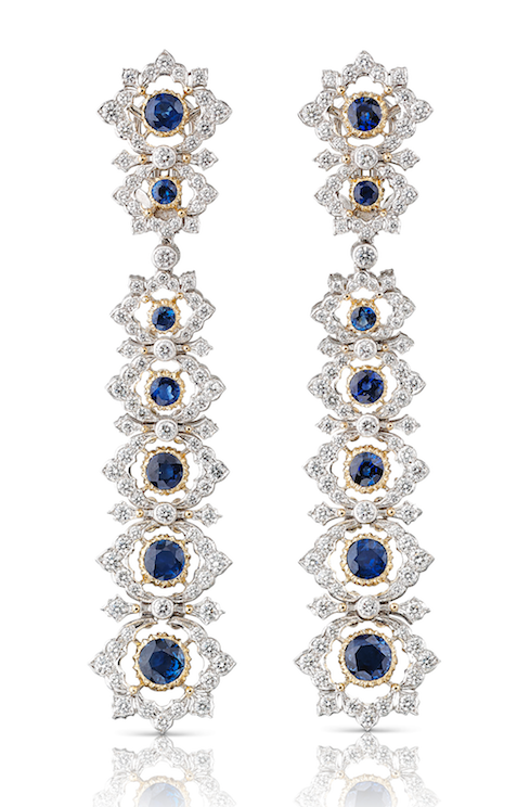 Frappé lors de ses derniers voyages par l’engouement des femmes du monde entier pour les boucles d’oreilles pendantes, le créateur signe ici une collection construite sur des partis pris esthétiques qui sortent de la norme. Superbement assorties, les pierres précieuses concrétisent la force émotionnelle du dessin. Avec ces boucles d’oreilles pendantes, Andrea Buccellati magnifie le style initié par son père Gianmaria, il enrichit cette collection et revisite les codes centenaires de la haute joaillerie pour dévoiler les formes les plus audacieuses. Soit un étourdissant ballet de , tanzanites, saphirs, émeraudes, jade, diamants blancs taille brillant et taille rose.