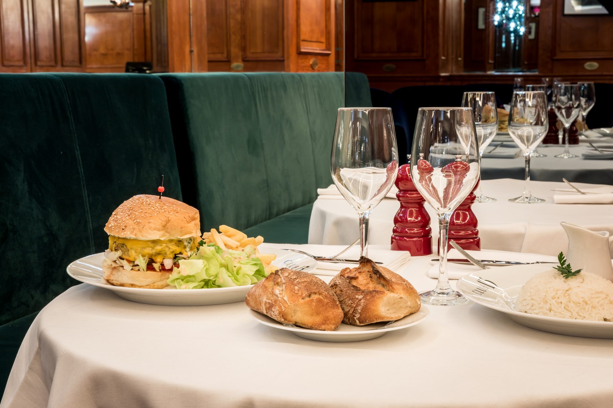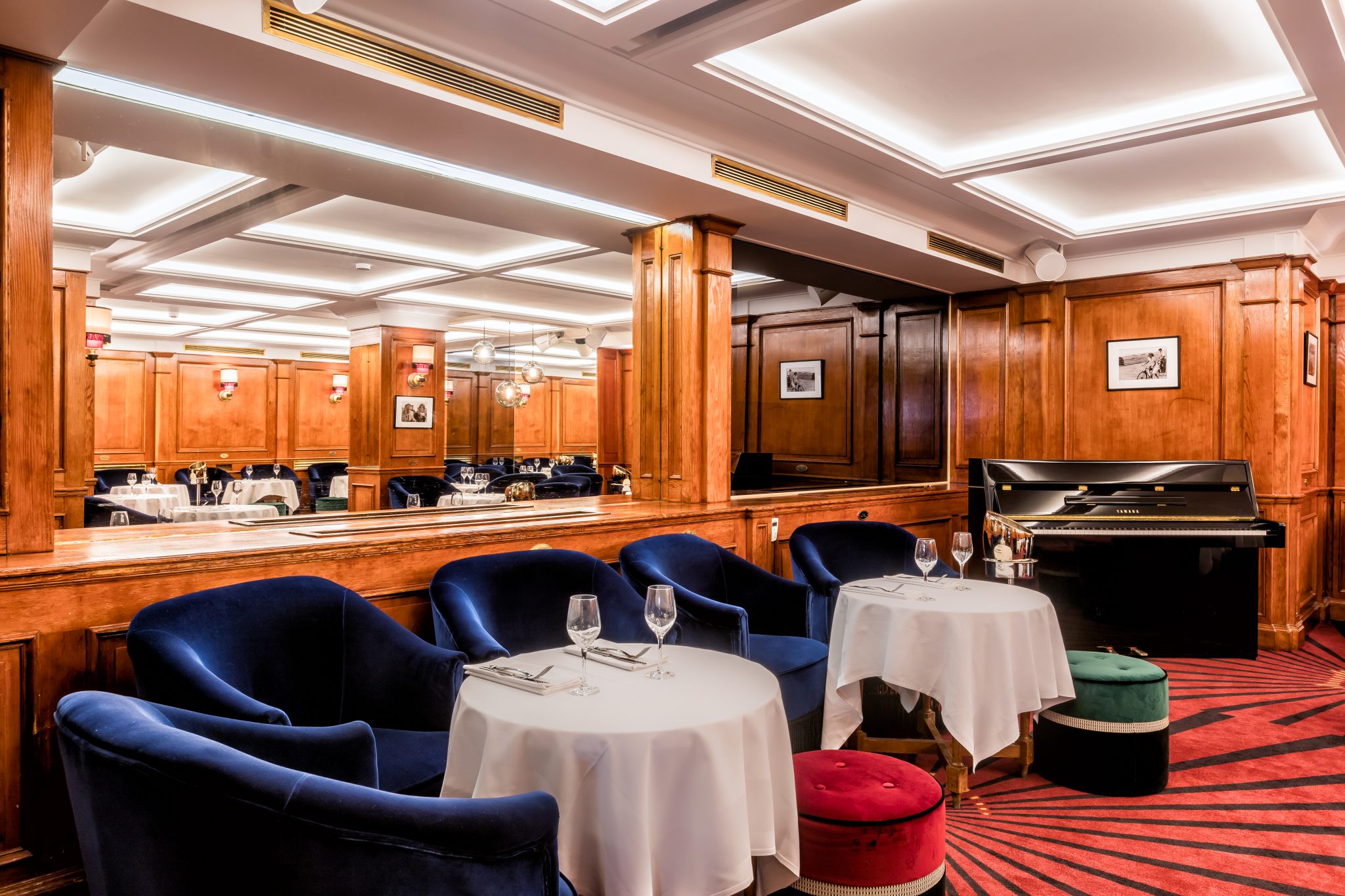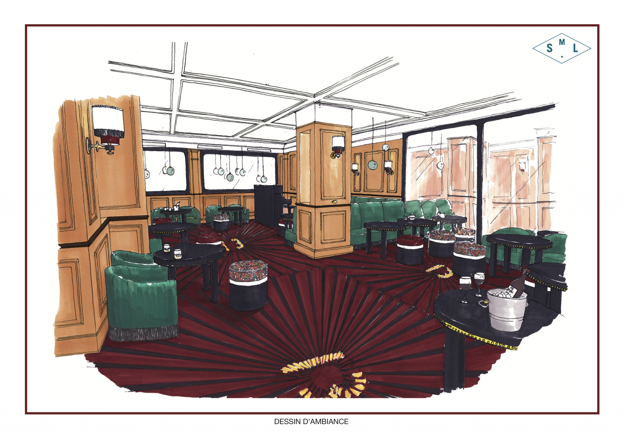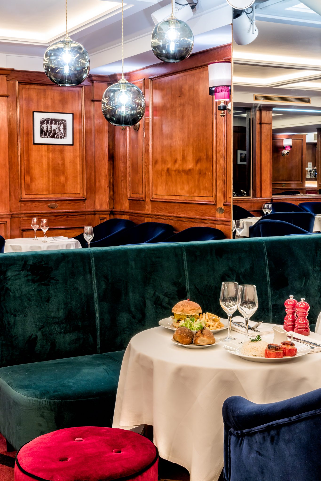 Elle a souhaité conserver l’âme des lieux, les boiseries, elle a travaillé à tamiser les lumières, parfaitement jouée avec les tons d’ocre, de verts et de rouge, pour créer une ambiance feutrée et cosy grâce au velours.