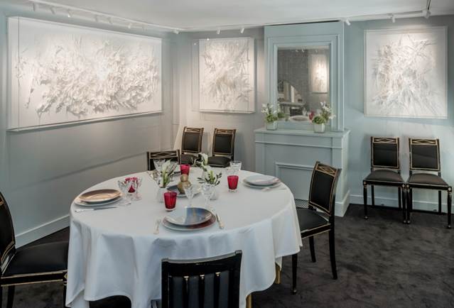 La traversée des Jardins du Palais Royal invite à la contemplation, la beauté, l’harmonie. En poussant la porte du Grand Véfour, le visiteur est sous le charme poétique de la nature, sous l’emprise de sa force et de sa vie. Composée de plusieurs fragments de papier de soie sur toiles, de formats différents, l’œuvre de Claudine Drai est une ode à la nature.
