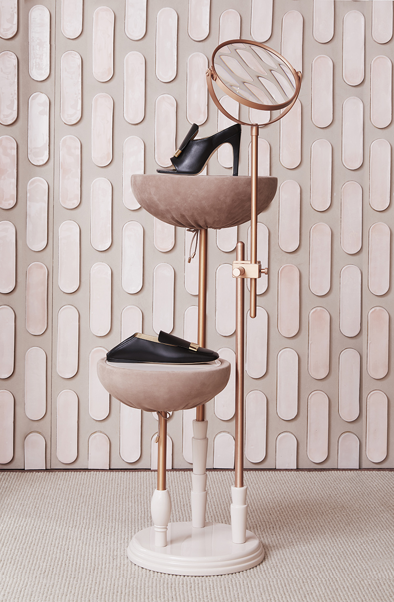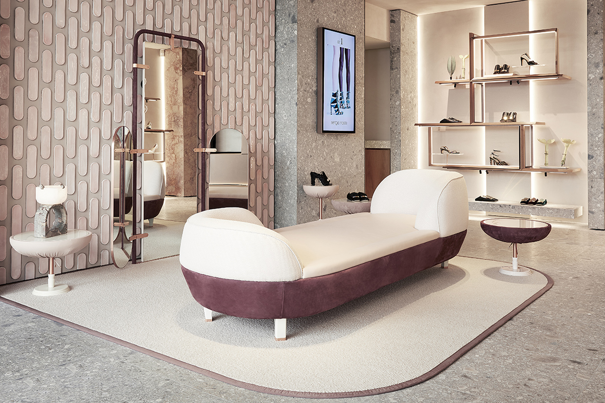 Au sein du concept mis au point par l’architecte Costanzi, Cristina Celestino a créé pour Sergio Rossi la décoration intérieure et une collection de mobilier inspirée par une recherche profonde sur les racines de la marque historique ainsi que sur sa nouvelle orientation sr1.