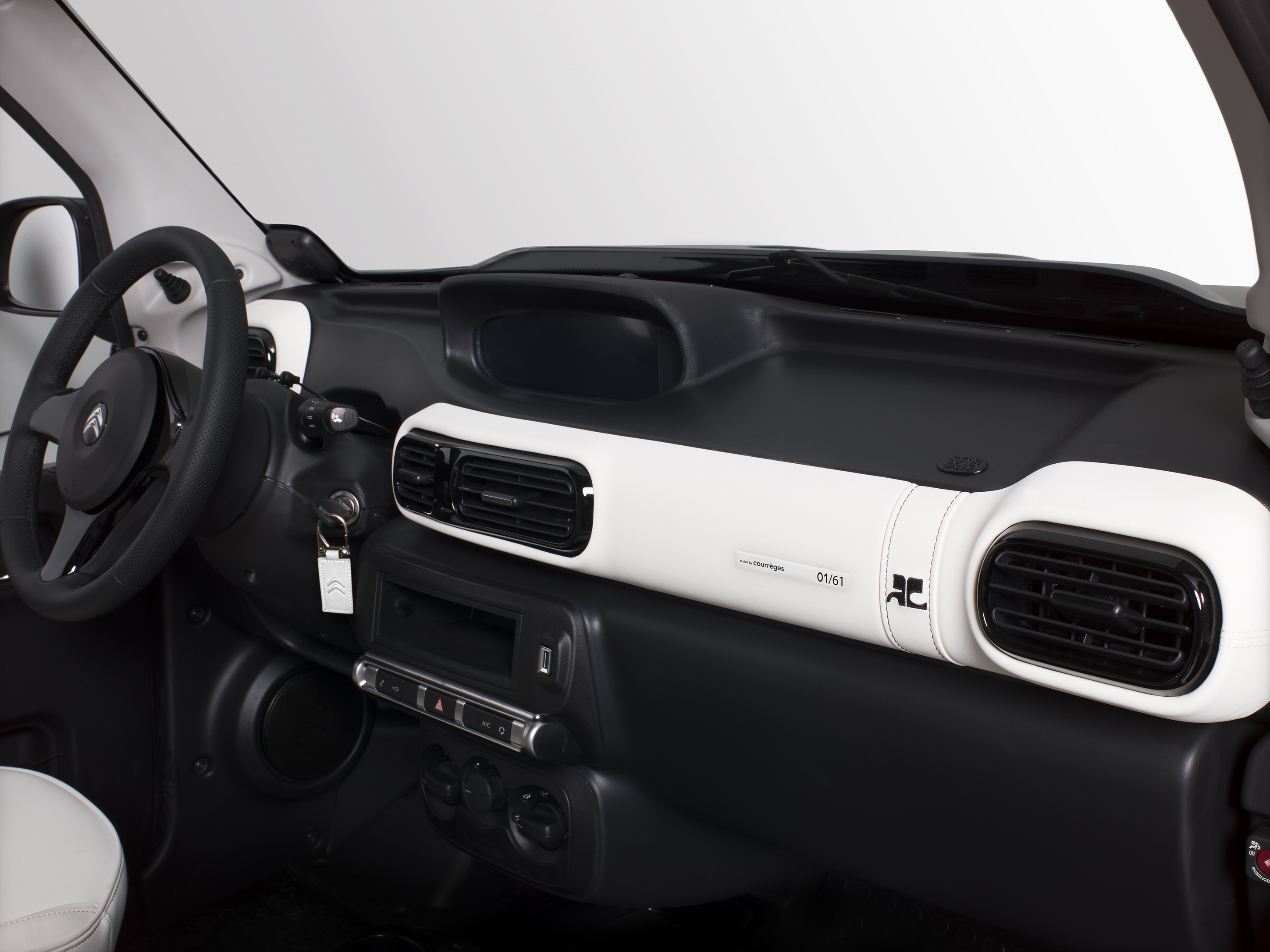 – Un nouveau style intérieur avec des décors de planche de bord gainés et une sangle brodée Courrèges, des sièges en TEP blanc, une plaque numérotée et un bagage bicolore sur-mesure signé Courrèges,