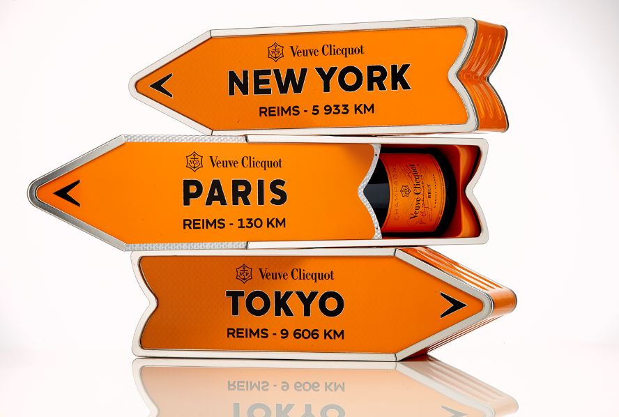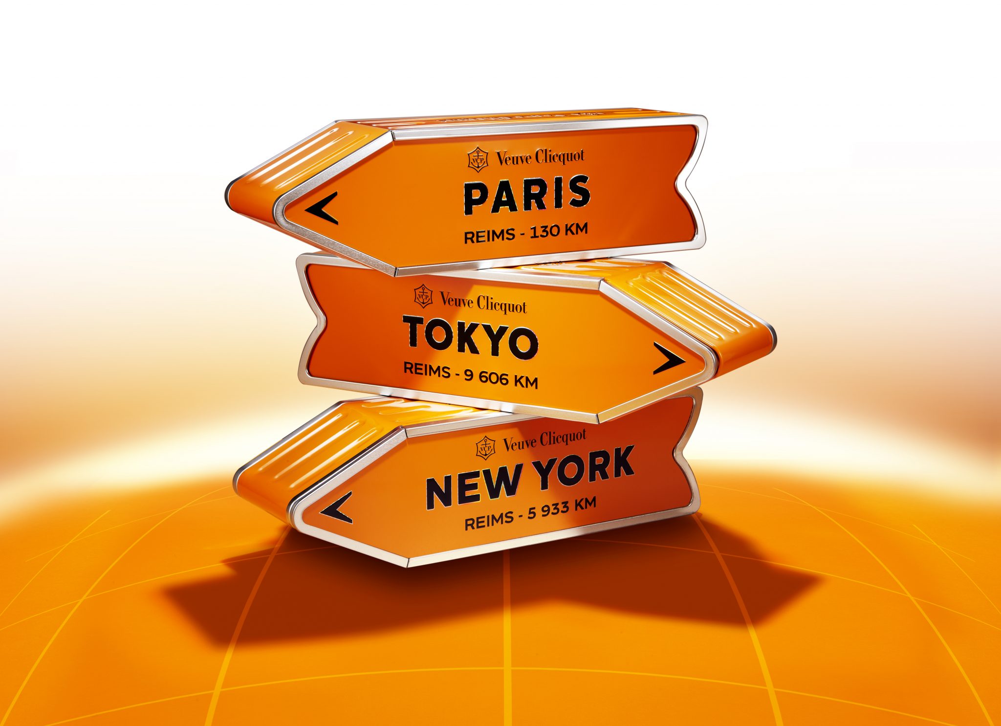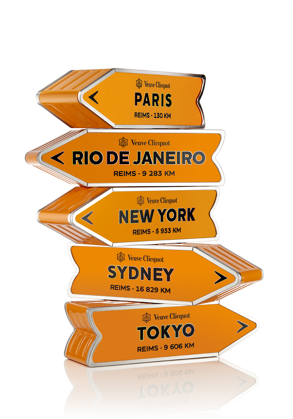 La collection Clicquot Arrow vous propose 29 destinations, de Cape Town à Kyoto en passant par Buenos Aires et Berlin, qui retracent quelques-unes des grandes épopées commerciales de la Maison Veuve Clicquot, indiquant la distance séparant chaque lieu de son siège à Reims.