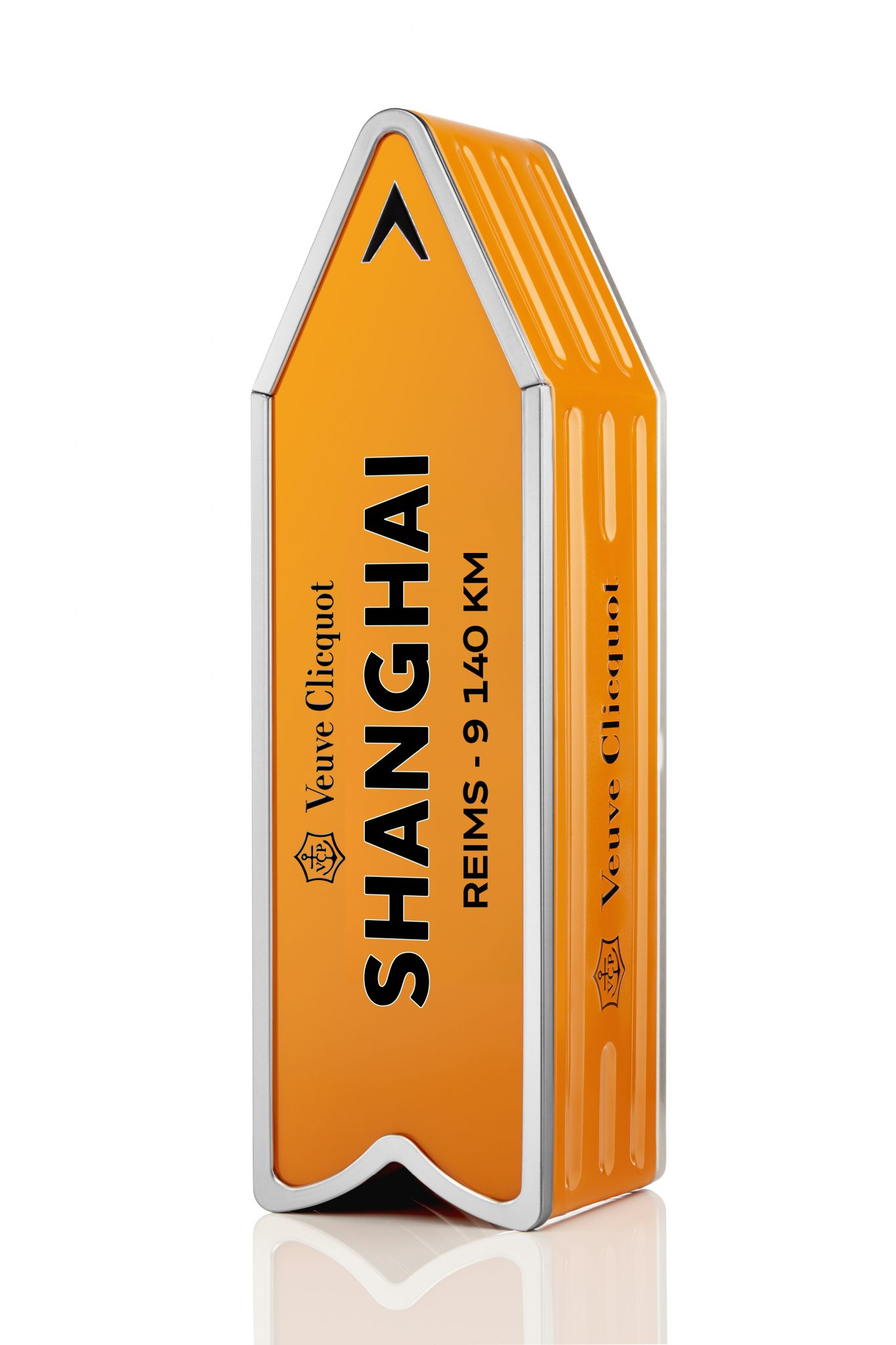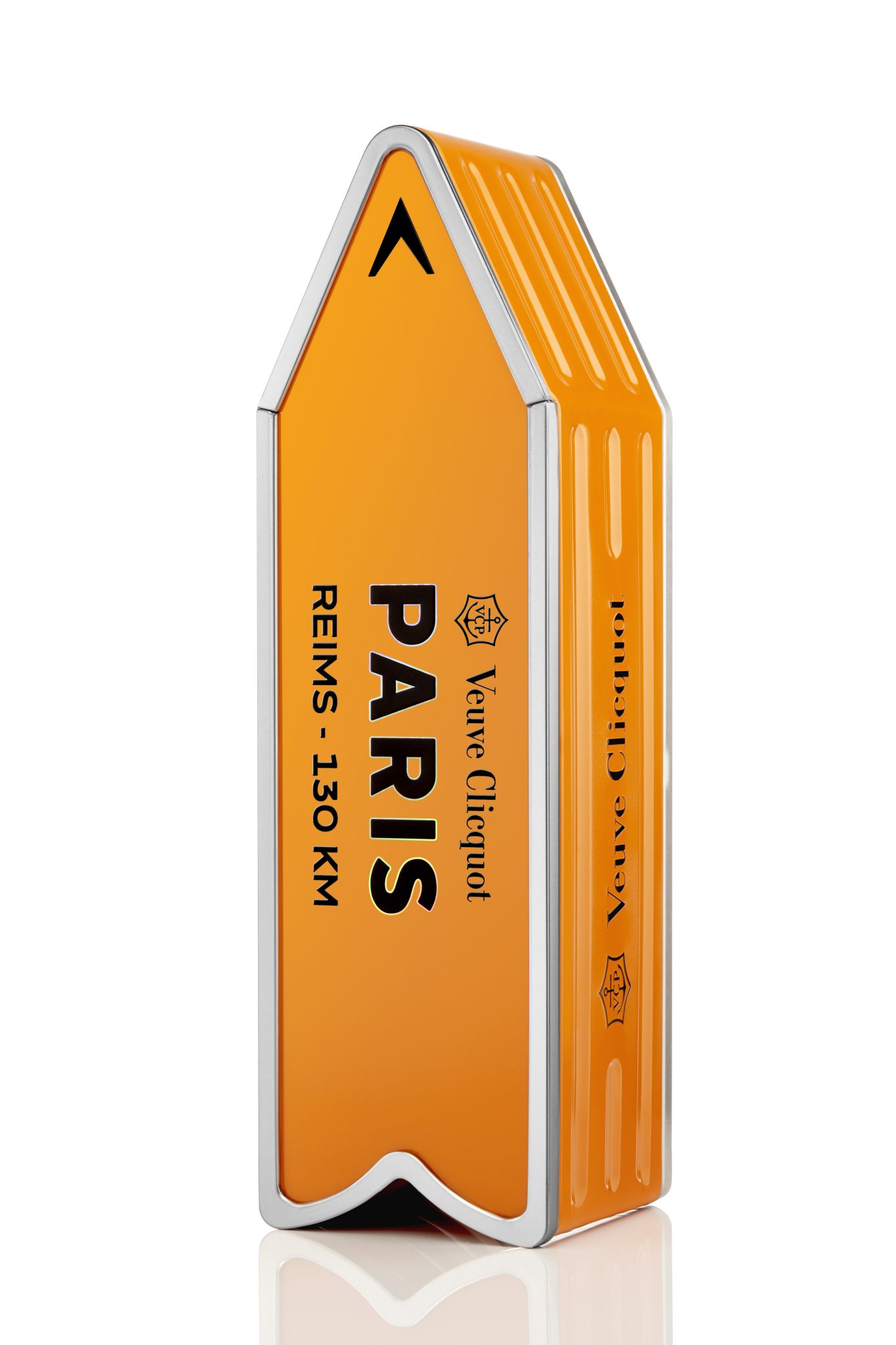 Réinterprétation moderne des panneaux de signalisation, Clicquot Arrow est un étui métallique Jaune Clicquot en forme de flèche, destiné à accueillir une bouteille de Veuve Clicquot Brut Carte Jaune.
