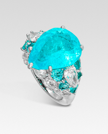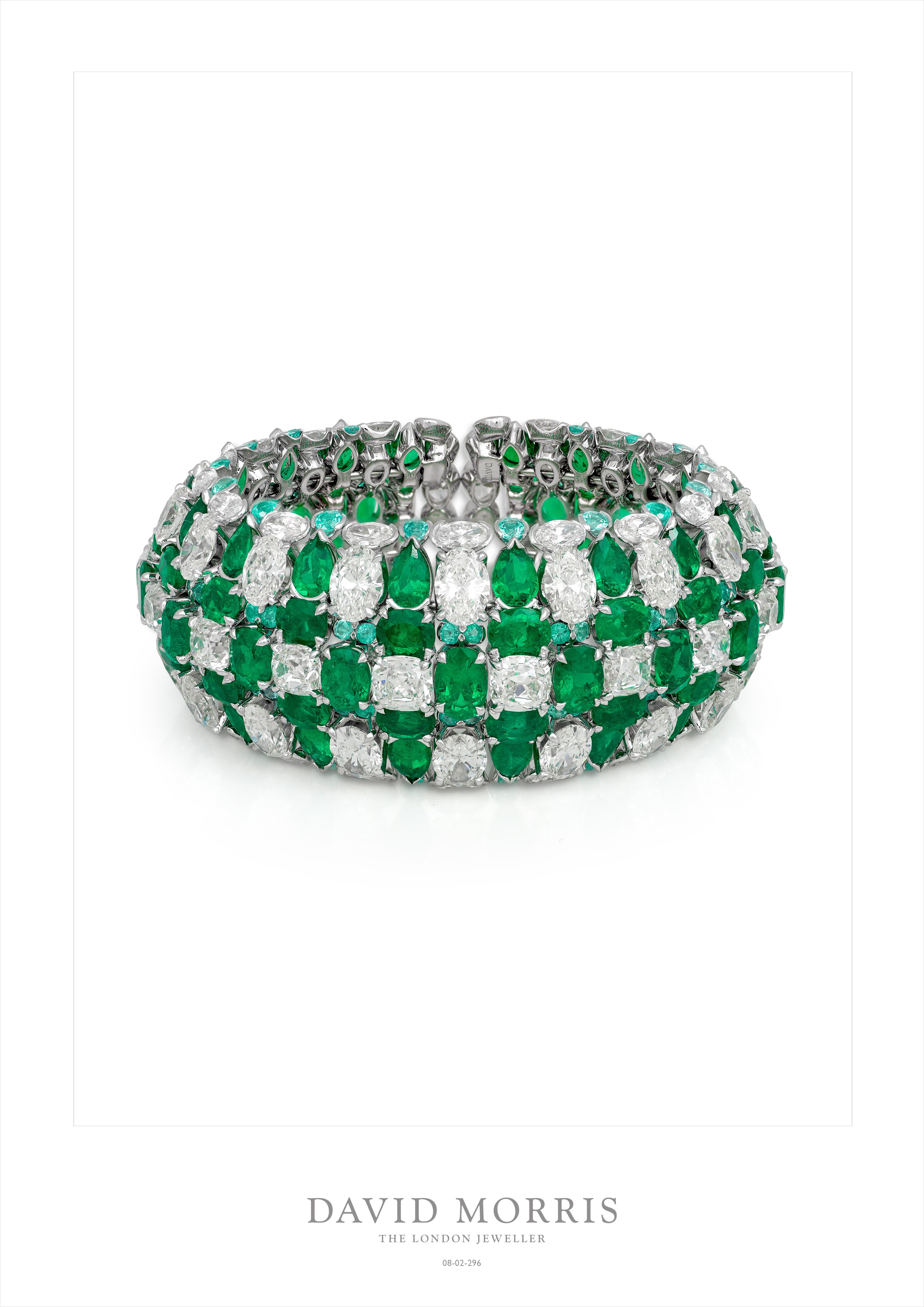 Il associe de façon très british la créativité et la légèreté, réunissant les plus rares des pierres : saphirs du Cachemire, rubis birmans couleur sang de pigeon, émeraudes colombiennes, perles roses de conch ainsi que des tourmalines Paraíba brésiliennes à l’éclat bleu-piscine.
