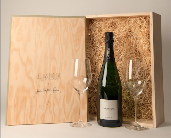 Ce coffret exclusif dessiné par le designer Jean-Baptiste Fastrez (Galerie Kréo) sert d’écrin à la cuvée spécialement créée par la Maison Geoffroy pour les Vins d’Hélène.