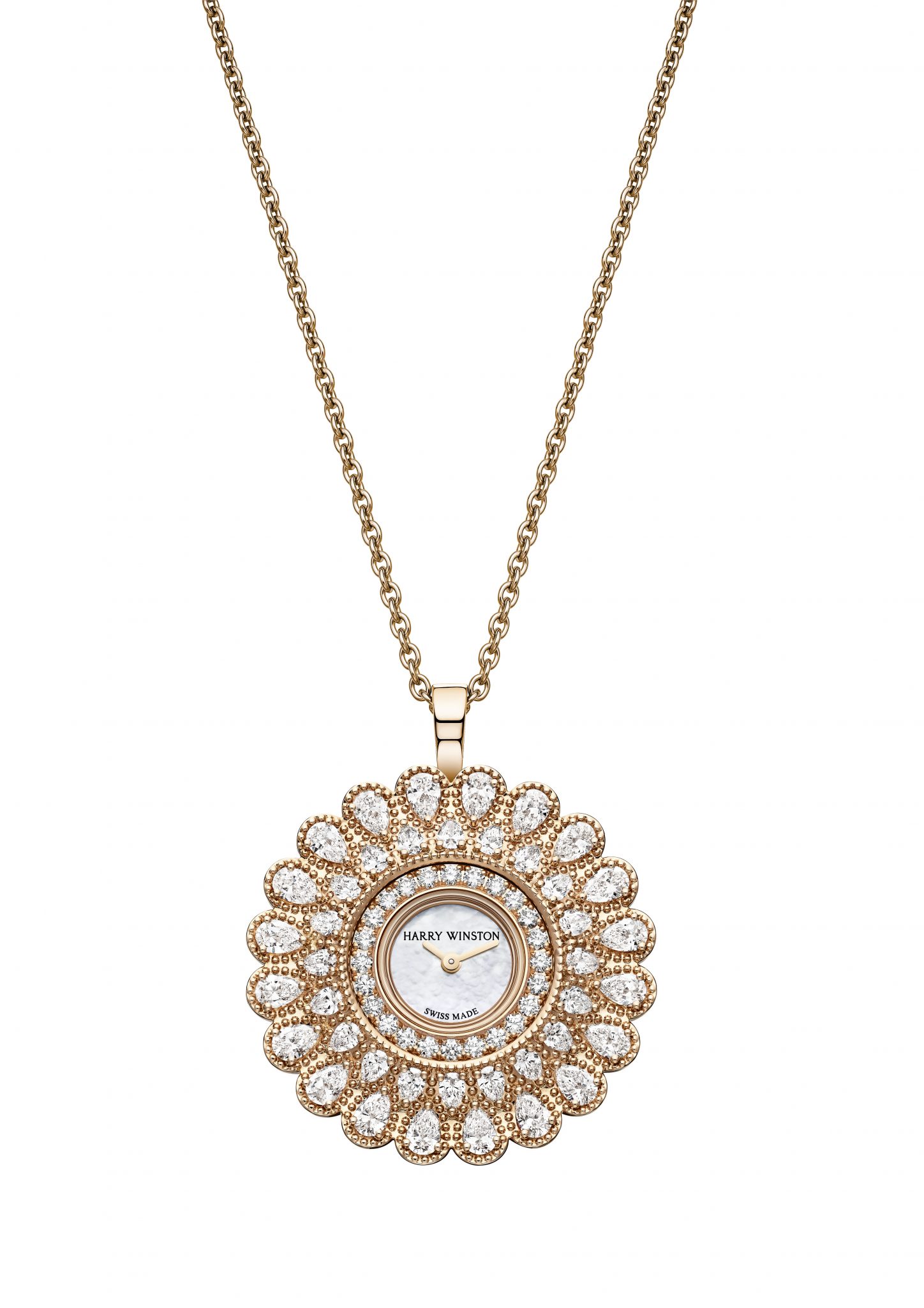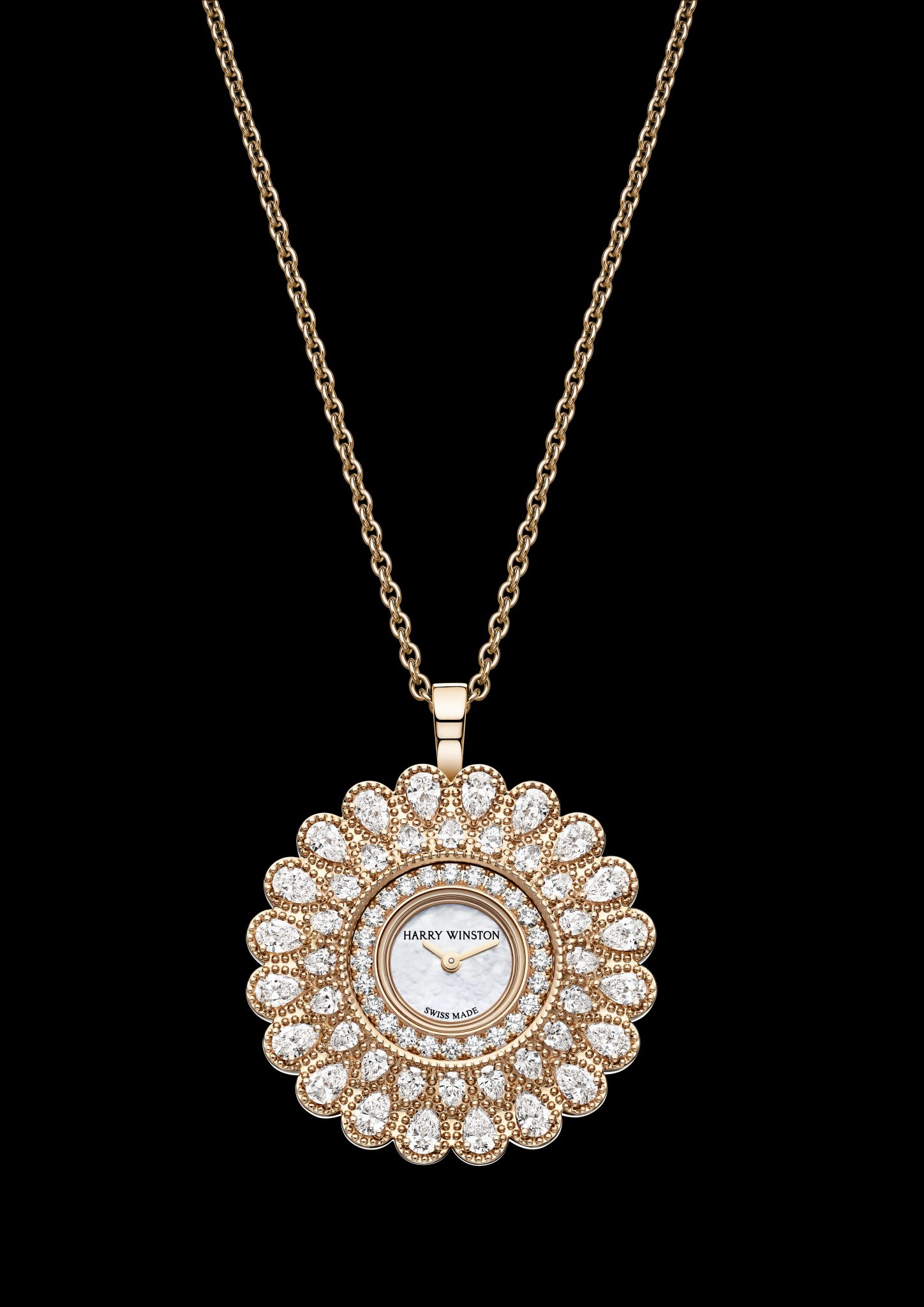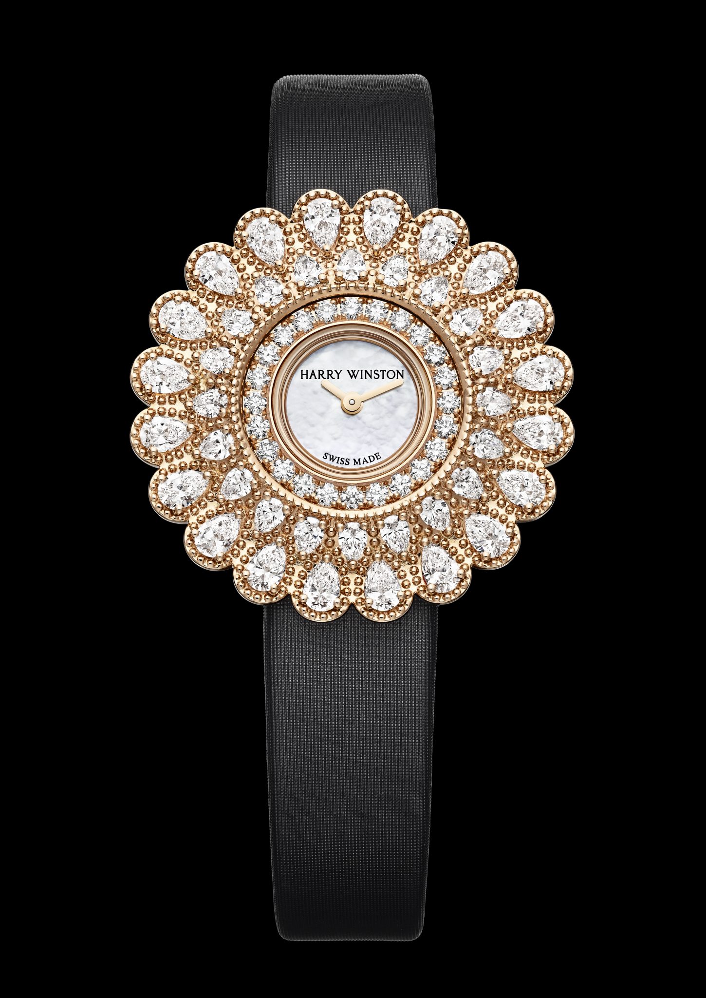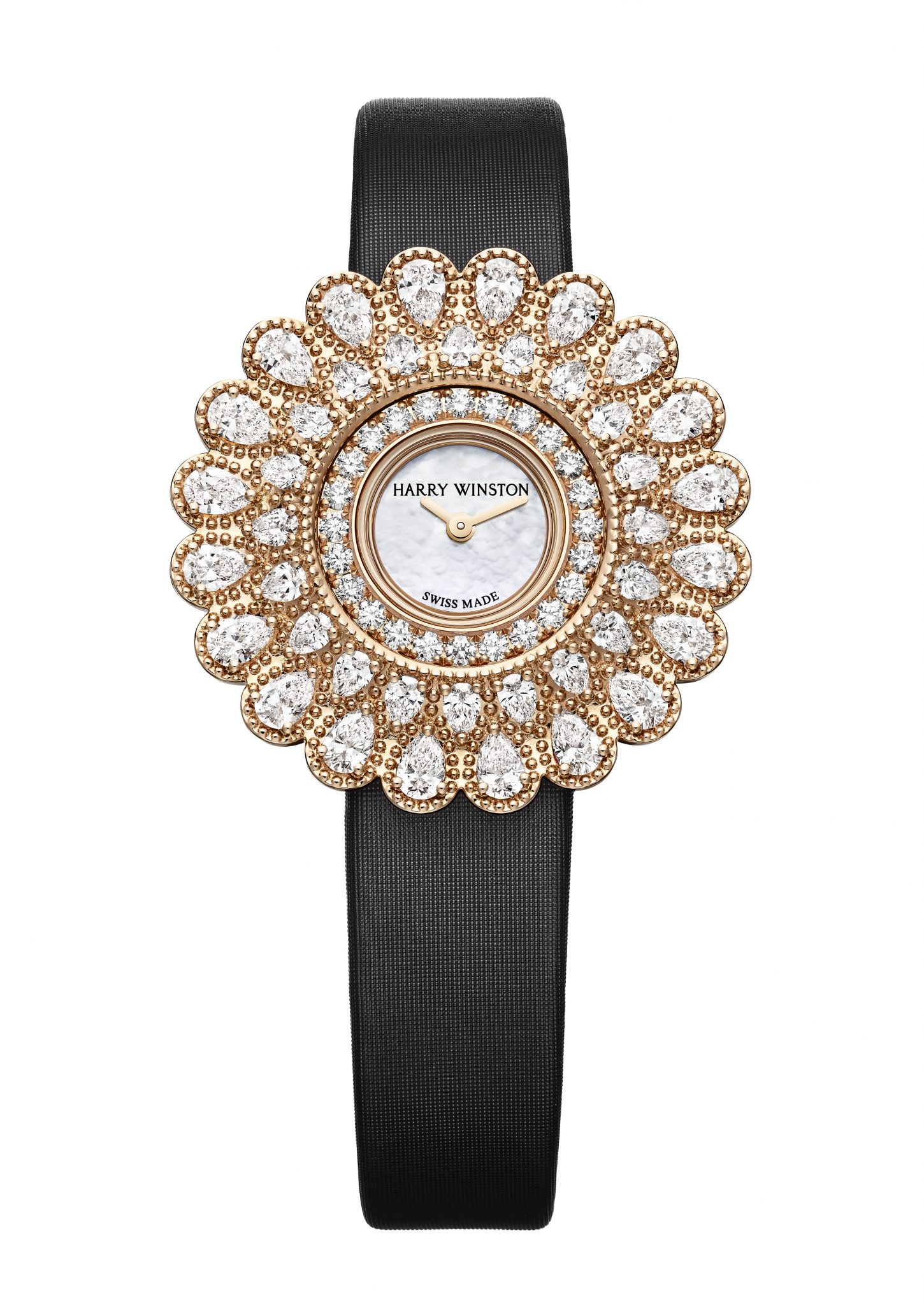 Avec son design polyvalent, la montre Marquise Time peut être portée de façon traditionnelle au poignet, sur un bracelet en satin bleu ou noir, ou bien en pendentif au bout d’une chaîne en or rose ou blanc 18 carats. Facilement amovible, la boîte sedétache de la structure d’un simple geste. L’éclat des diamants Harry Winston se reflète dans chaque détail de cette montre. On retrouve un diamant taille brillant sur le fermoir des chaînes en or rose et blanc, et 29 autres sur la boucle du bracelet. Les deux versions sont équipées d’un mouvement à quartz suisse offrant une facilité extrême d’utilisation et une précision exceptionnelle.
