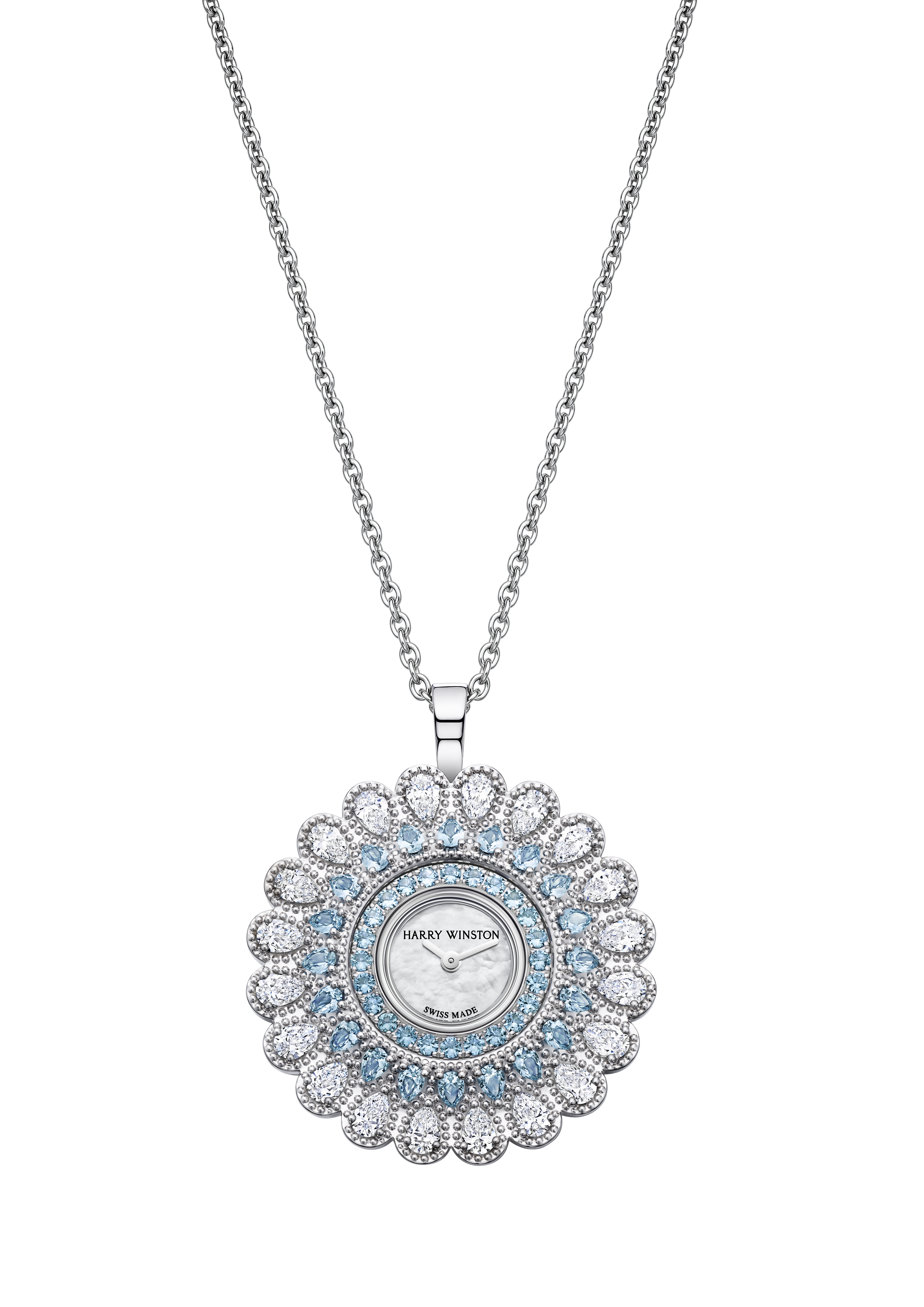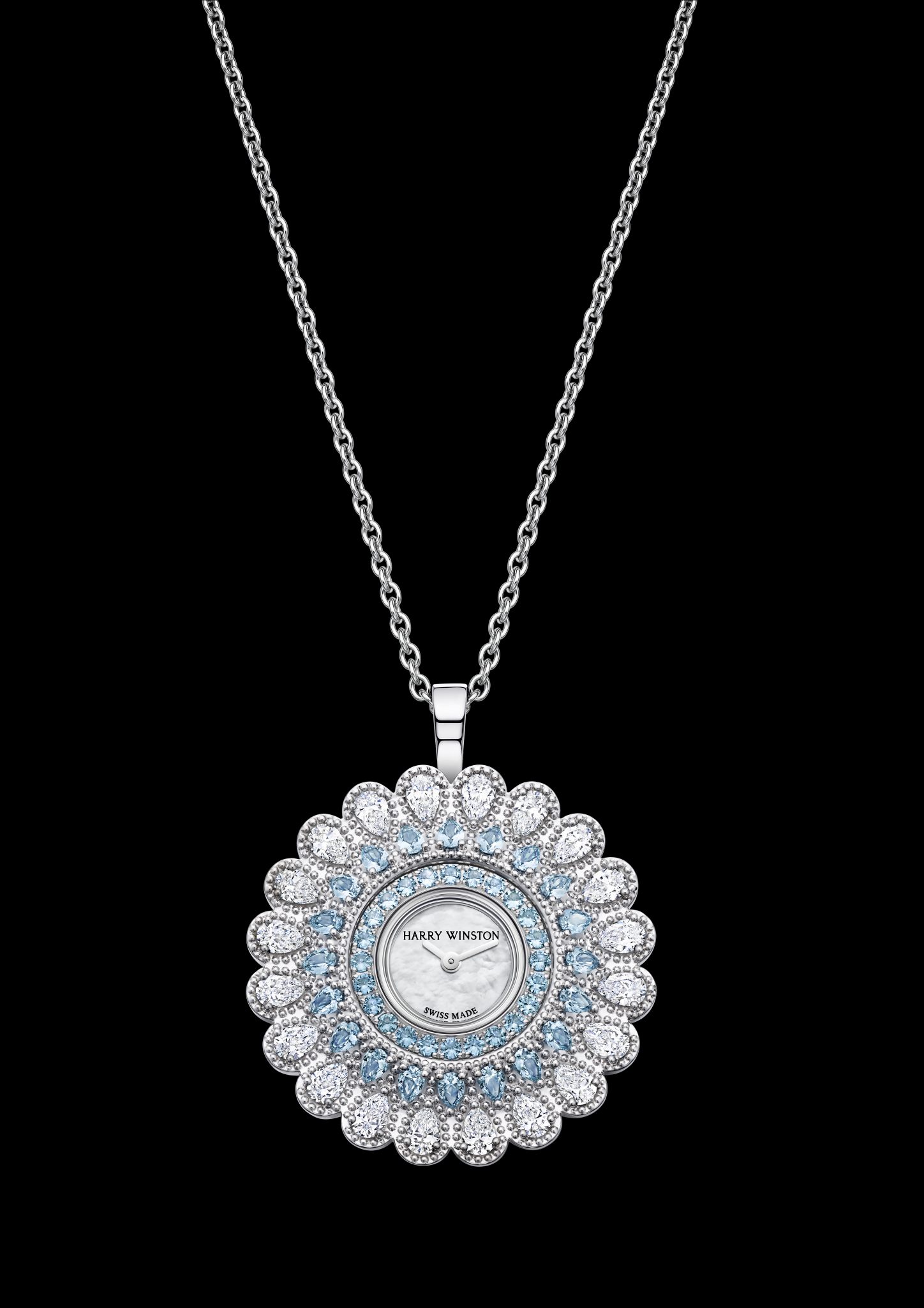 La Maison Harry Winston présente Marquise Time, un garde-temps de Haute Joaillerie aux multiples facettes, qui vous éblouira tout autant en montre bracelet qu’en pendentif. Inspirée de la fraise, ce large col à volants typique de la Renaissance, la montre Marquise Time séduit par ses volutes serties d’aigues-marines et de diamants.