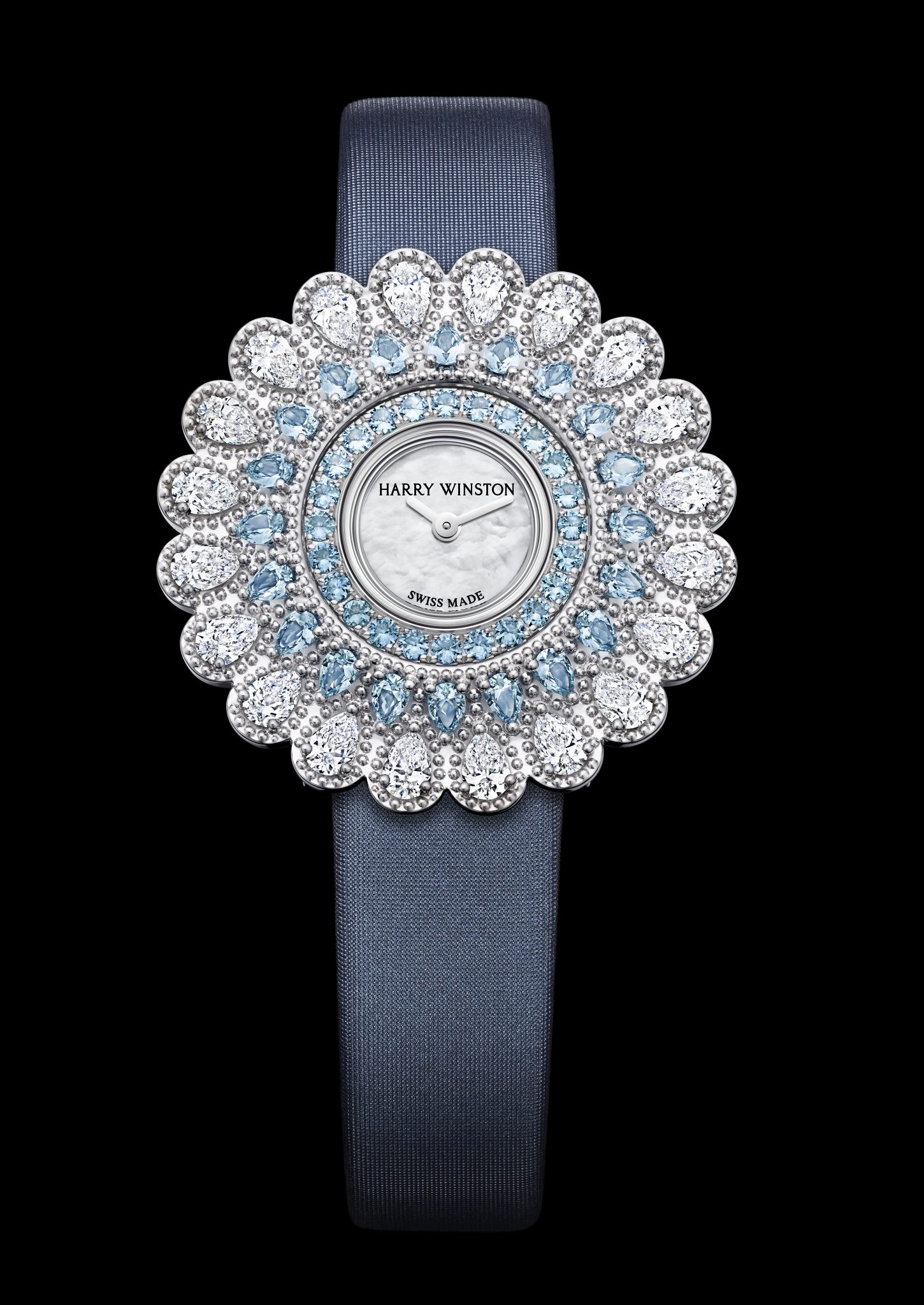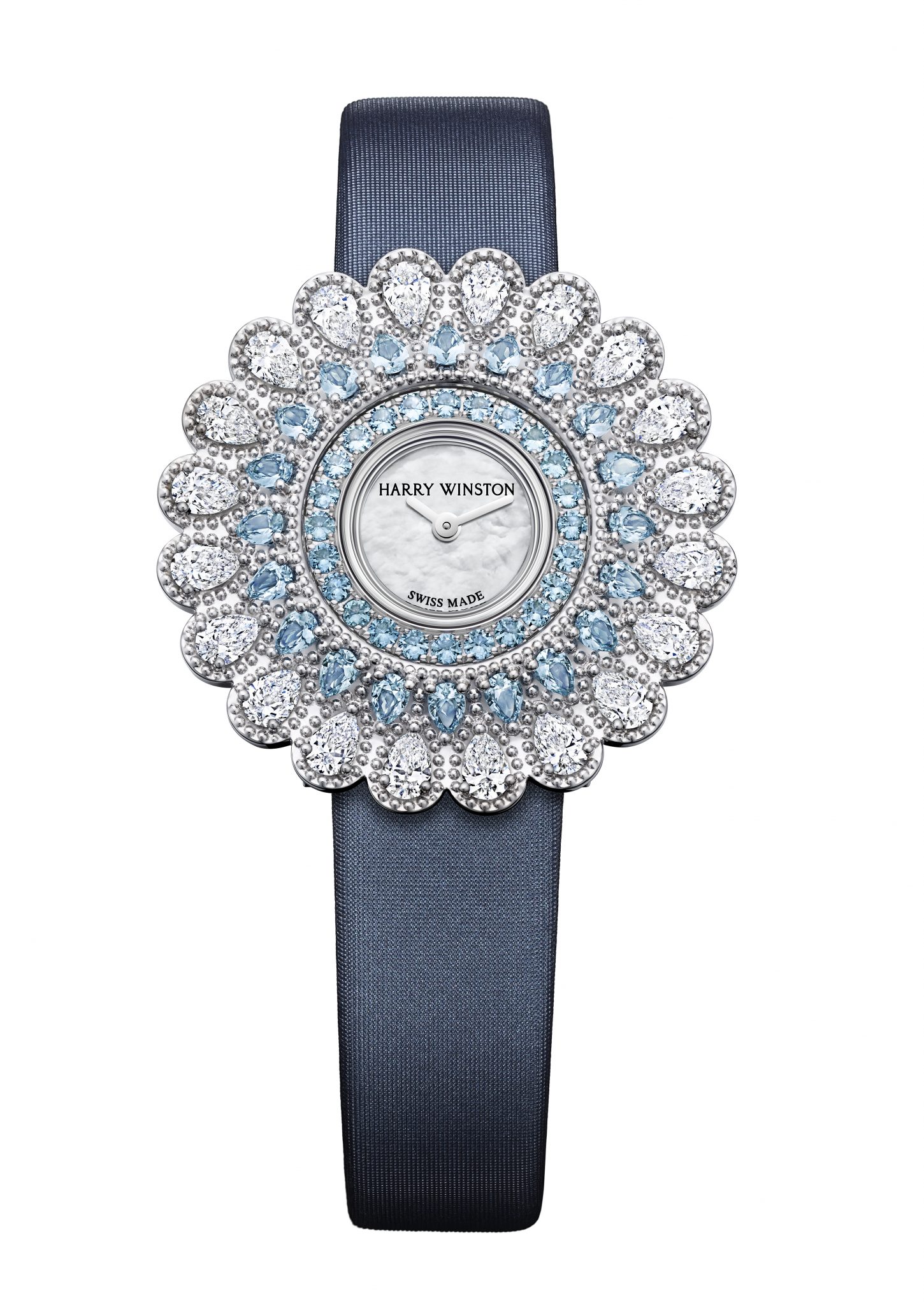 Les pétales pavés de pierres précieuses confèrent une dimension florale à la boîte de 36 mm en or blanc de la Marquise Time. Sertis de 20 diamants taille poire, ils entourent 20 aigues-marines taille poire aux nuances bleues captivantes. Au centre, 24 aigues-marines taille brillant mettent parfaitement en valeur le cadran en nacre. Des perles d’or rehaussent les courbes et les contours de chaque pierre et révèlent