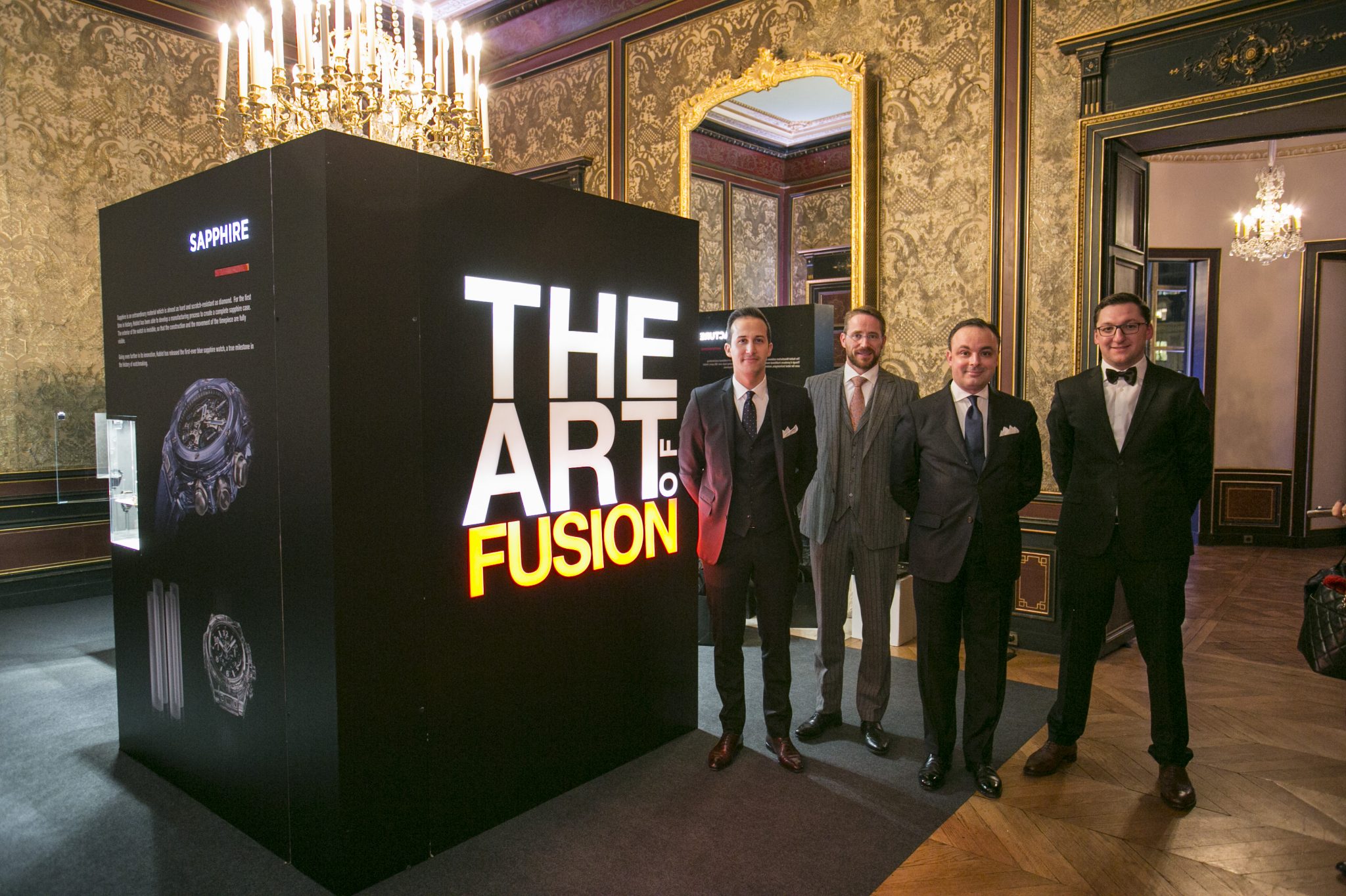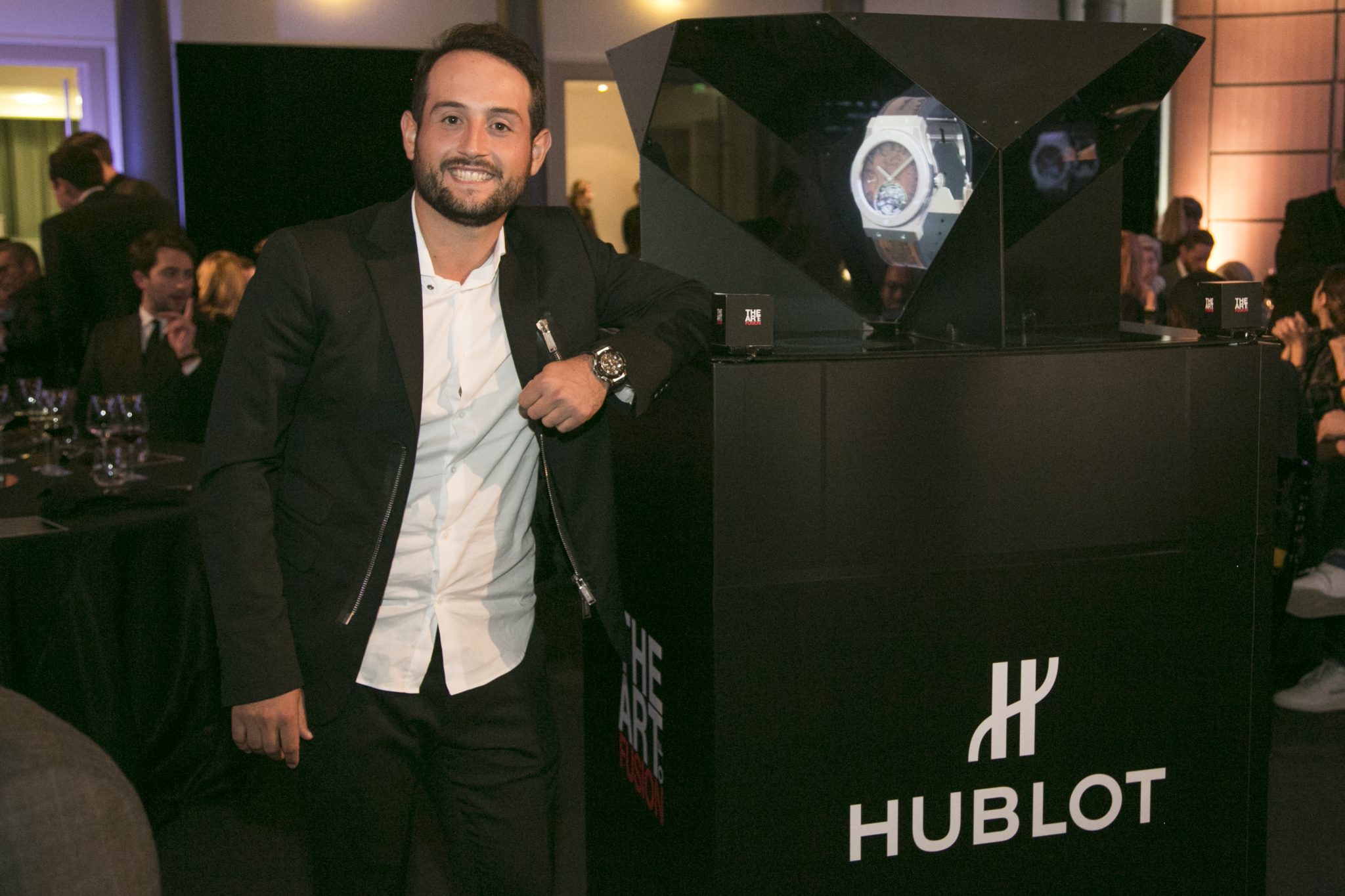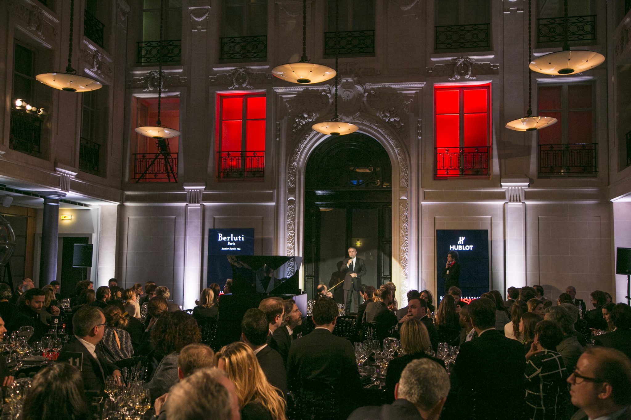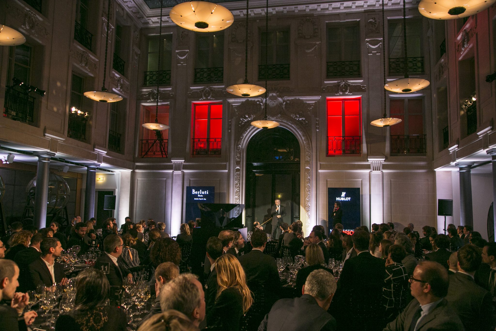 Au son d’un thème musical prenant, véritable fil rouge de la soirée, les invités ont fait leur entrée dans la majestueuse Salle des Tirages de l’Hôtel d’Évreux. Dans cet écrin doté d’un élégant plafond de verre, et sous les hautes fenêtres ornées de frises, s’est dévoilé un décor futuriste dans un dégradé de noirs rehaussant la majesté du lieu. Accueillis par Ariel Wizman, journaliste et comédien français, Maître de Cérémonie de la soirée, les invités ont pris place à table. Goûtant à des mets raffinés, enchantés par un tour de magie en l’honneur de l’Art de la Fusion réalisé par Fred Razon, illusionniste français, tous attendaient le dénouement de cette soirée, la présentation des deux nouveaux garde-temps Hublot et Berluti.