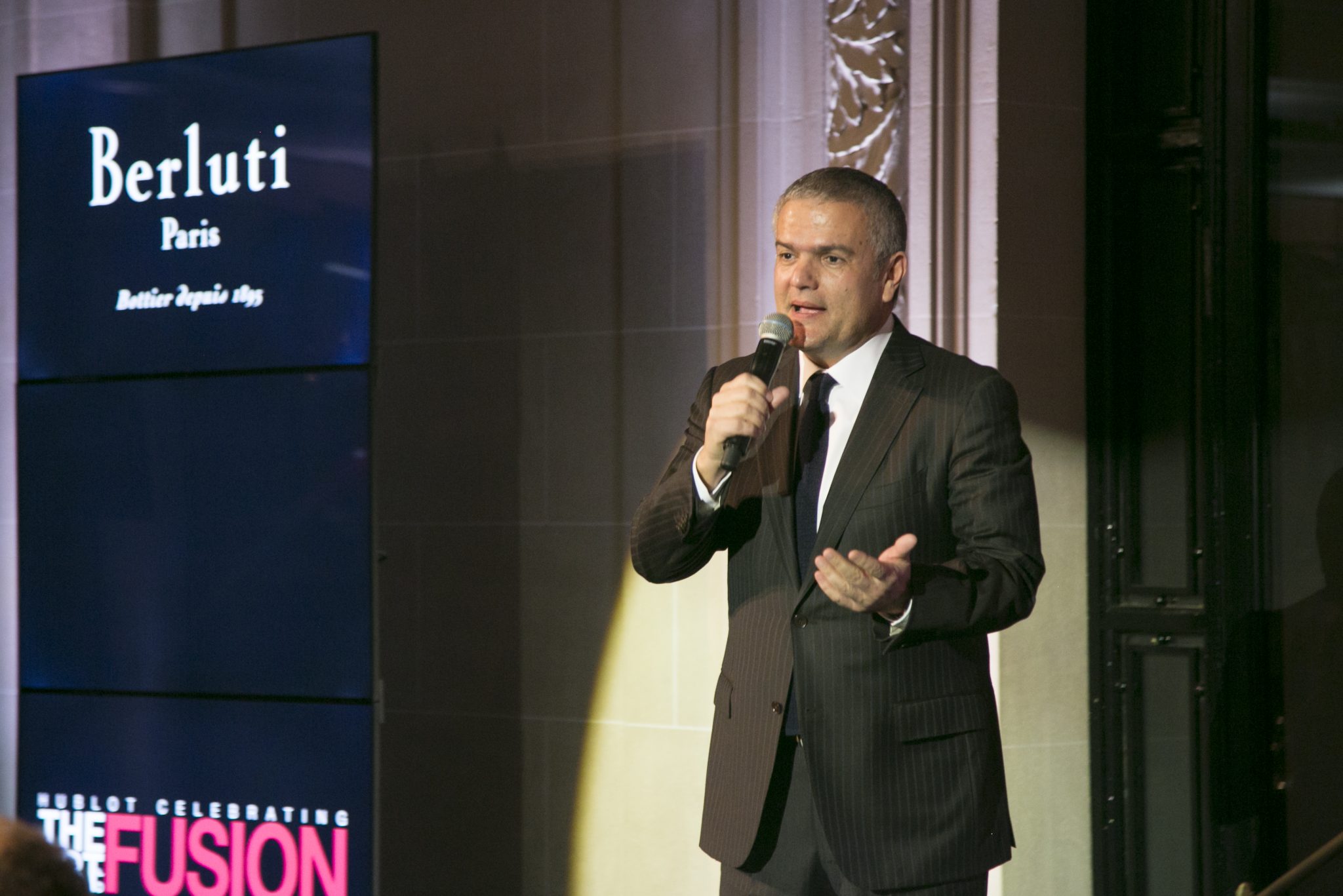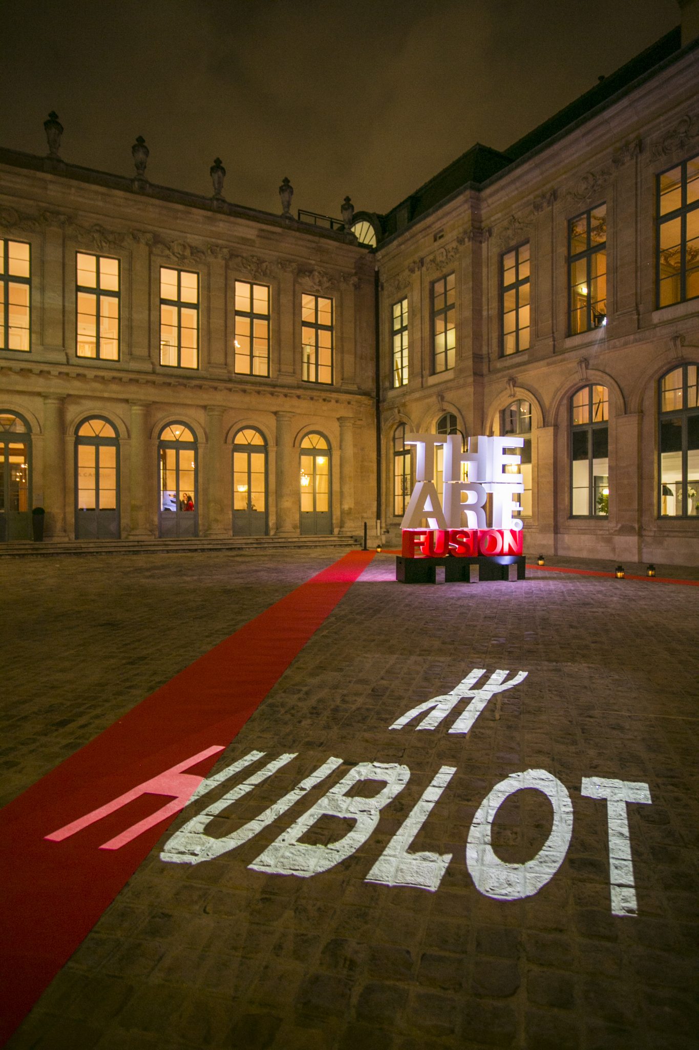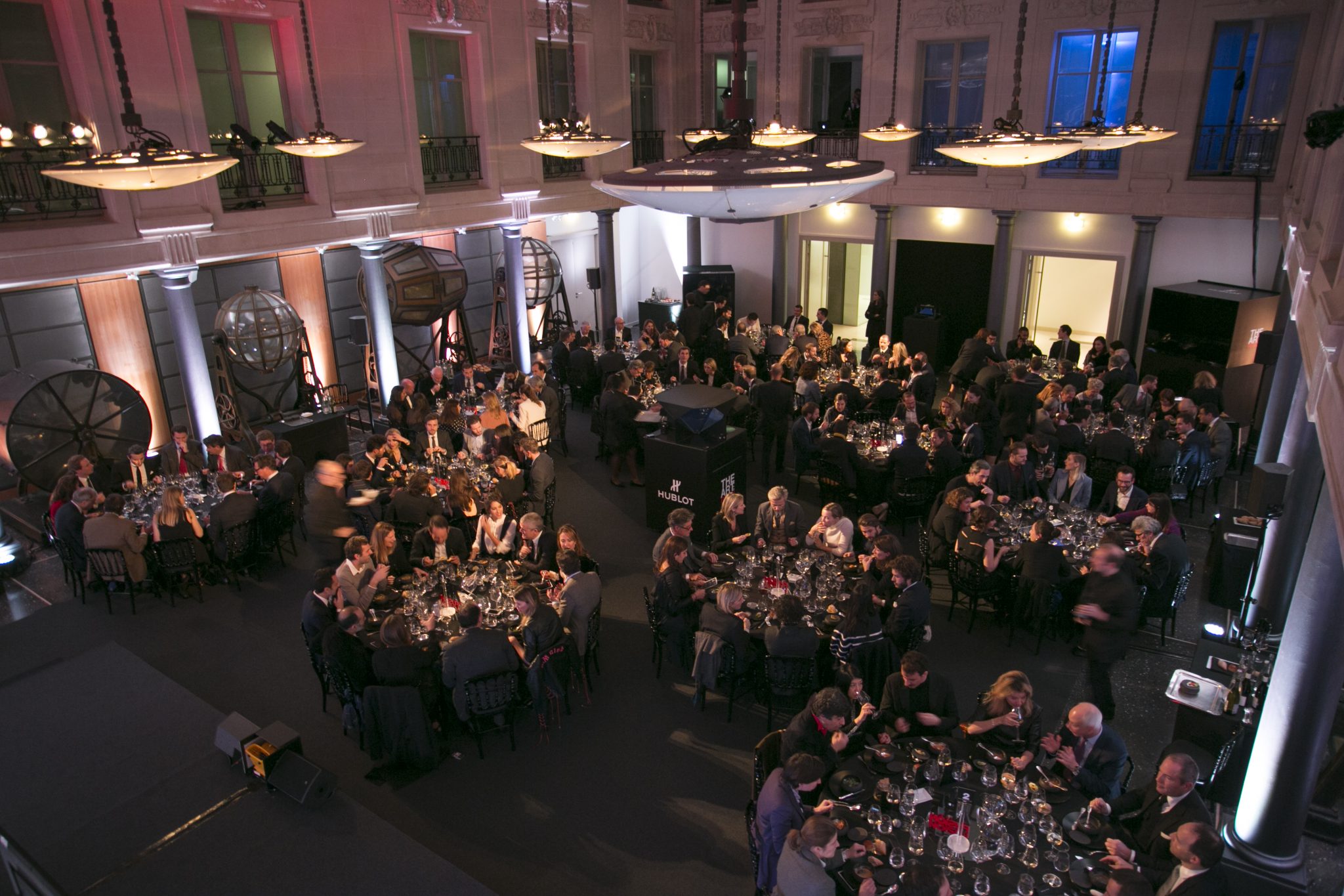 Au son d’un thème musical prenant, véritable fil rouge de la soirée, les invités ont fait leur entrée dans la majestueuse Salle des Tirages de l’Hôtel d’Évreux. Dans cet écrin doté d’un élégant plafond de verre, et sous les hautes fenêtres ornées de frises, s’est dévoilé un décor futuriste dans un dégradé de noirs rehaussant la majesté du lieu. Accueillis par Ariel Wizman, journaliste et comédien français, Maître de Cérémonie de la soirée, les invités ont pris place à table. Goûtant à des mets raffinés, enchantés par un tour de magie en l’honneur de l’Art de la Fusion réalisé par Fred Razon, illusionniste français, tous attendaient le dénouement de cette soirée, la présentation des deux nouveaux garde-temps Hublot et Berluti.