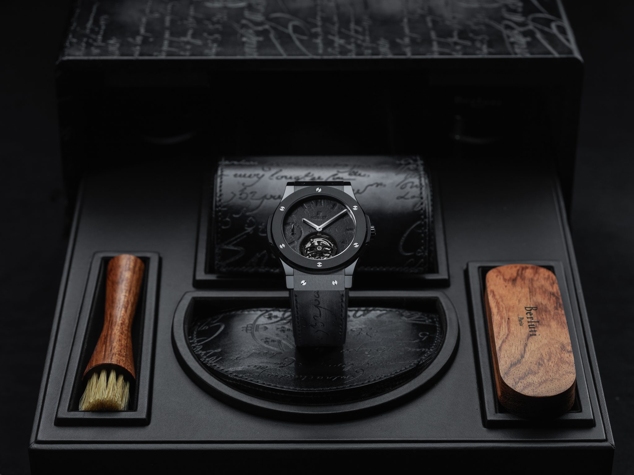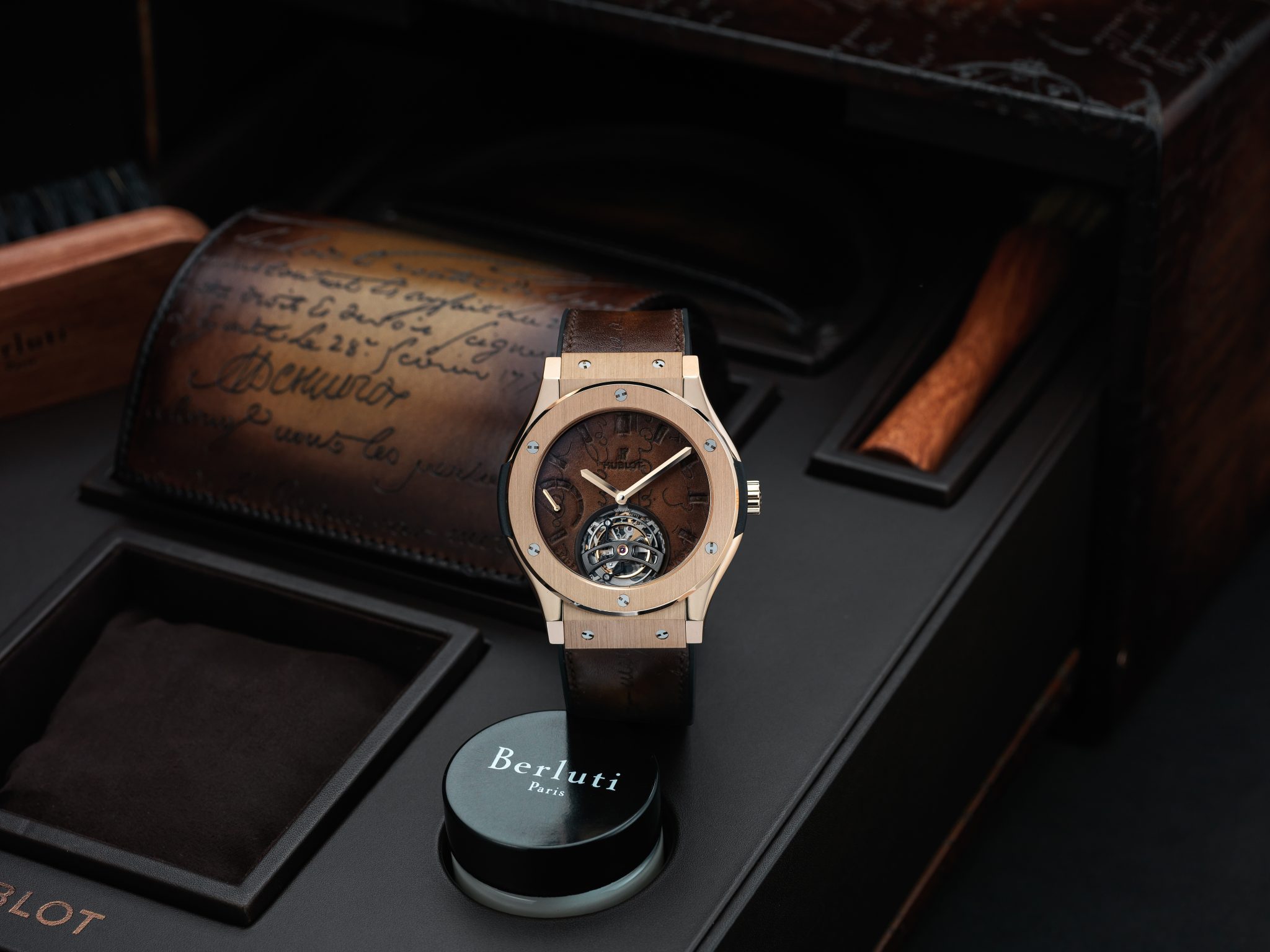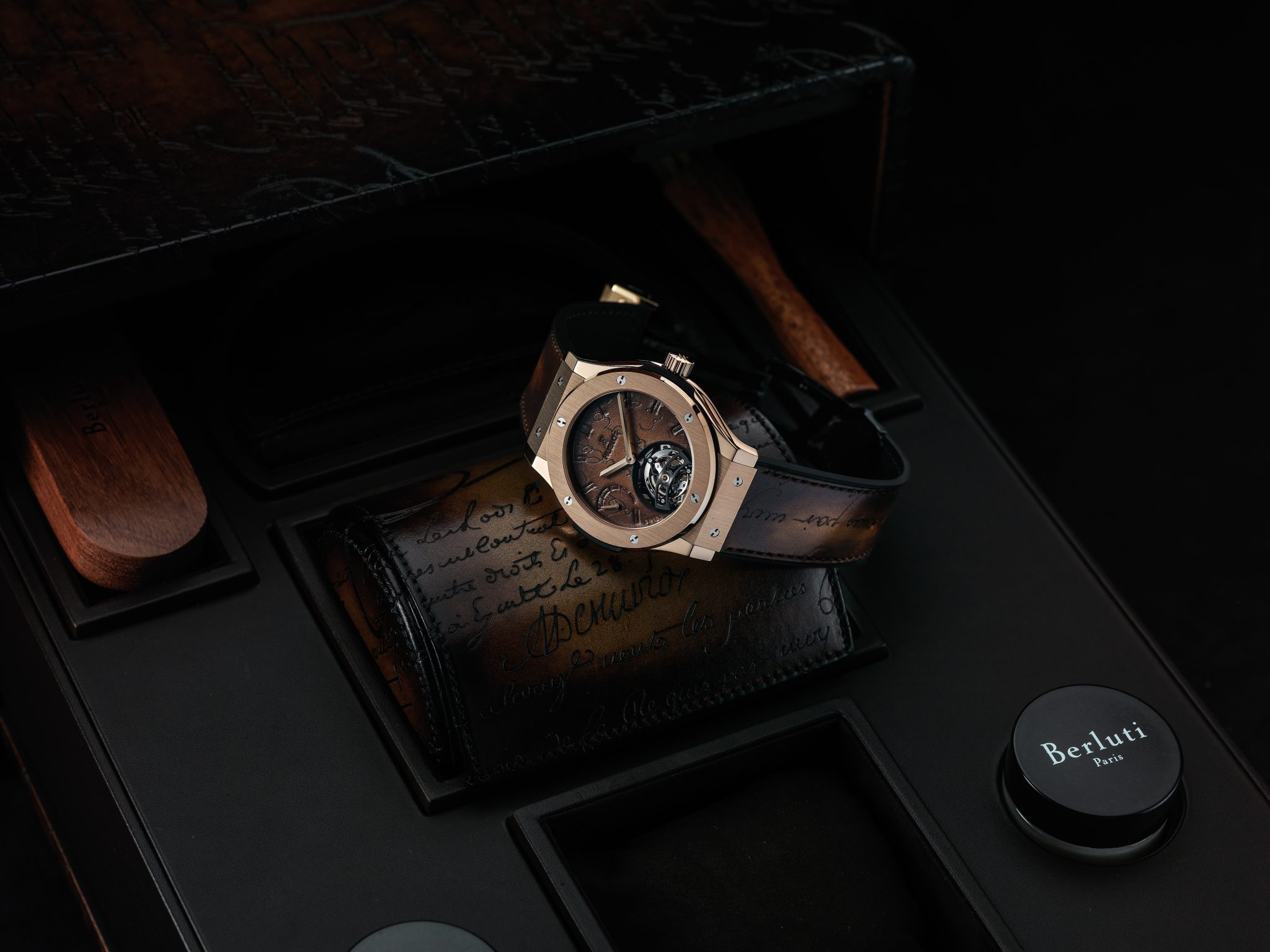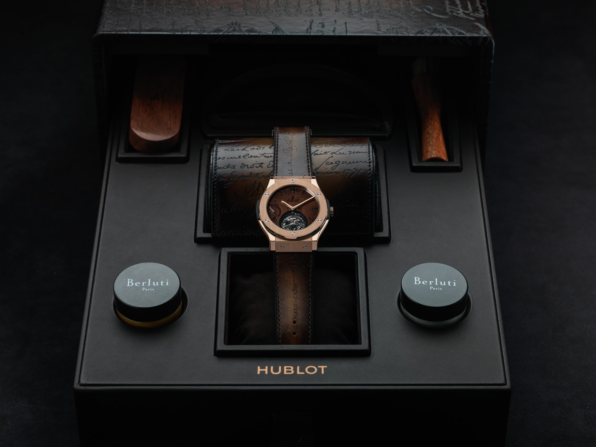 Hublot et Berluti, Berluti et Hublot : l’alliance de ces deux grands noms de l’horlogerie et du soulier sonne comme une évidence. Fondé à Paris en 1895 et développé par quatre générations d’artisans bottiers, Berluti chausse les hommes ne jurant que par son cuir Venezia emblématique dont la patine est le fruit de recherches sans cesse renouvelées. Parfaisant la panoplie de l’homme moderne, s’appuyant sur une tradition horlogère suisse séculaire, Hublot poursuit depuis plus de trente ans sa quête d’innovation continue en inventant des designs iconiques, en investissant dans la recherche de nouveaux matériaux et en battant des records mécaniques.