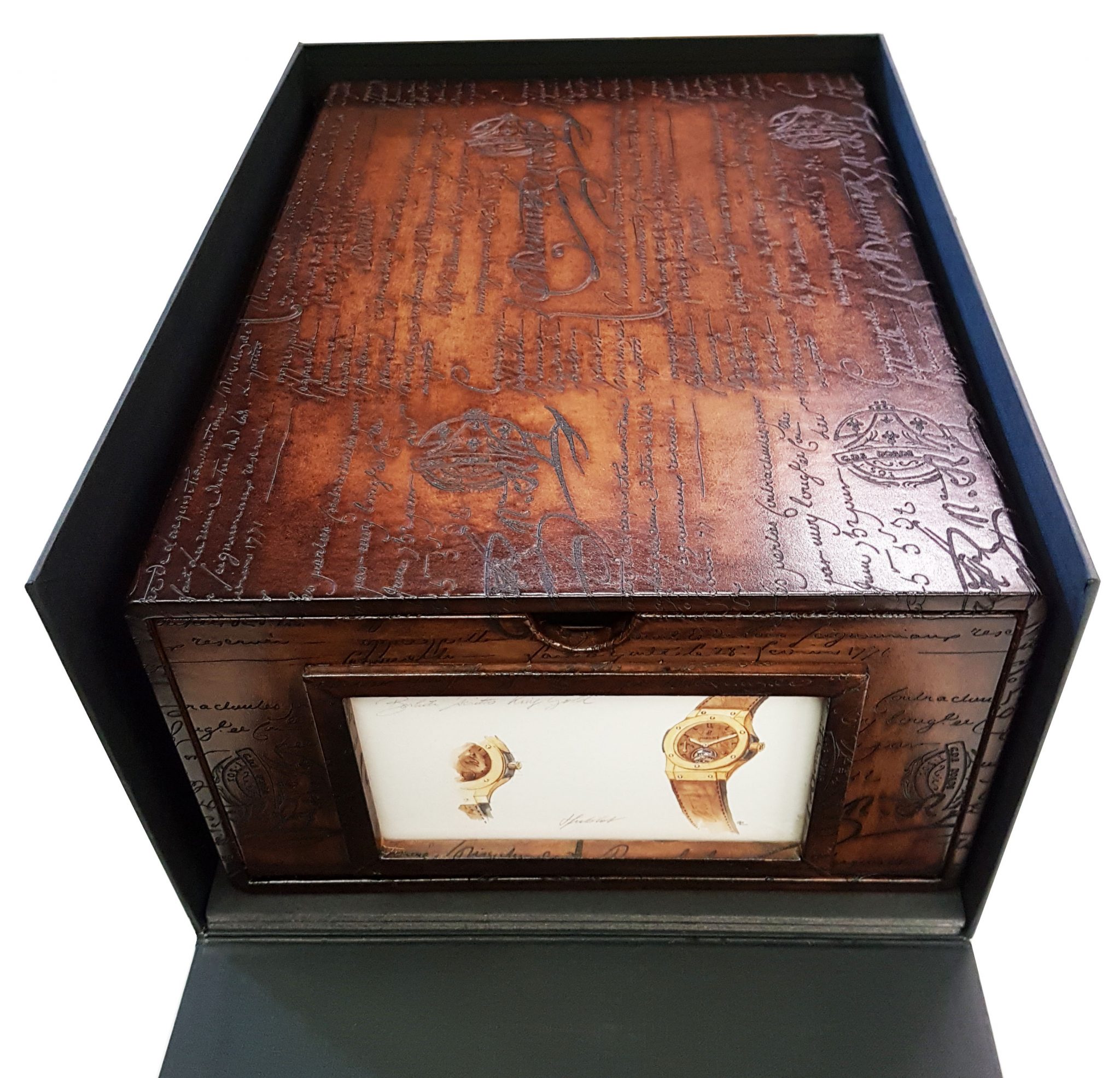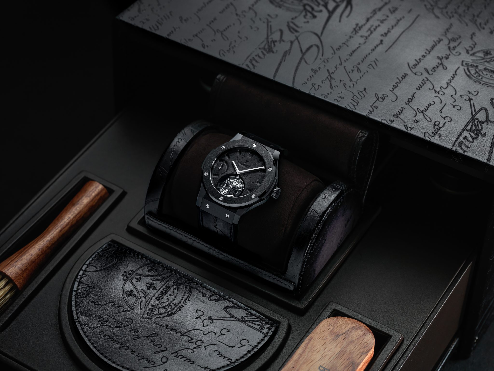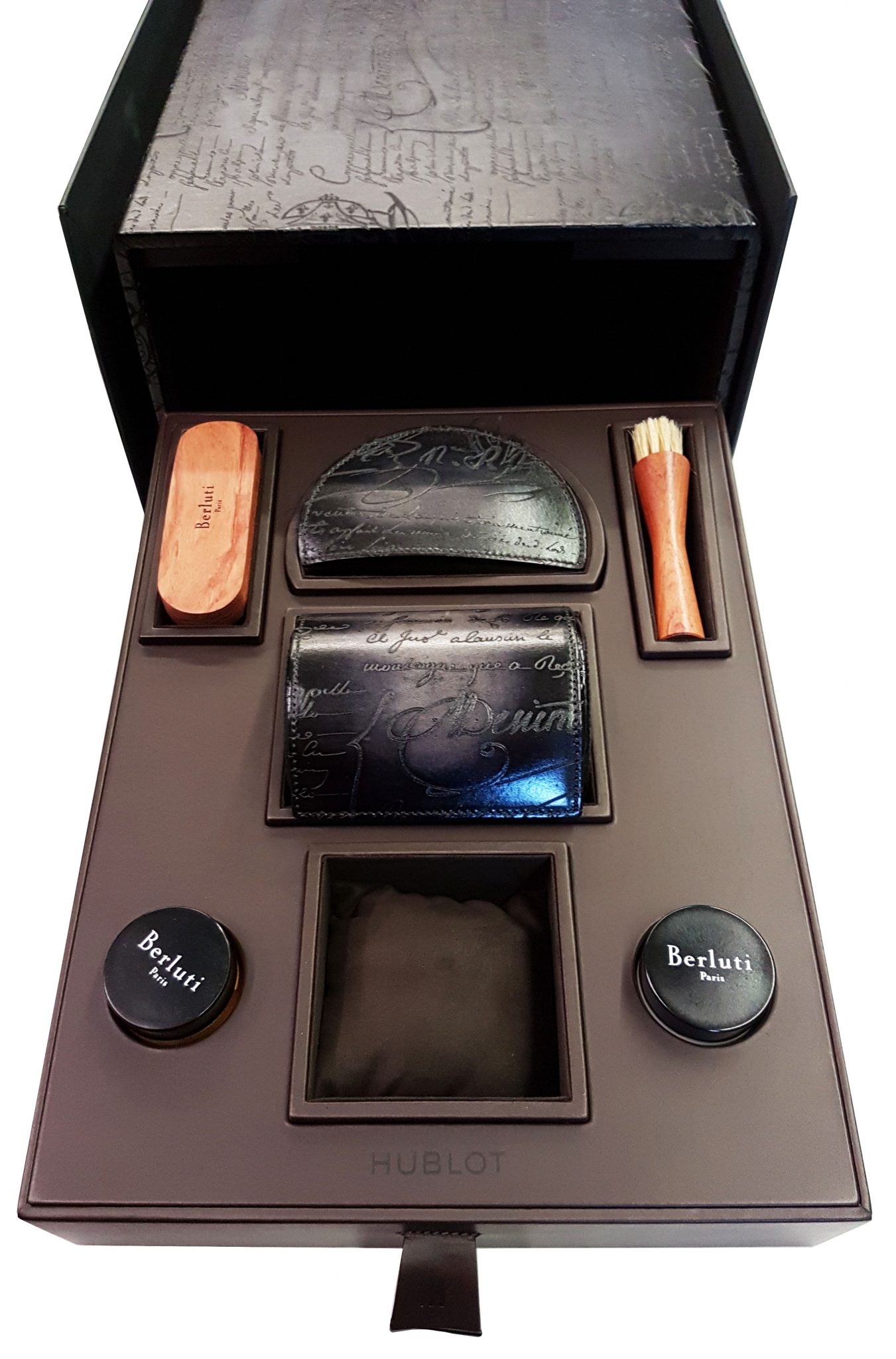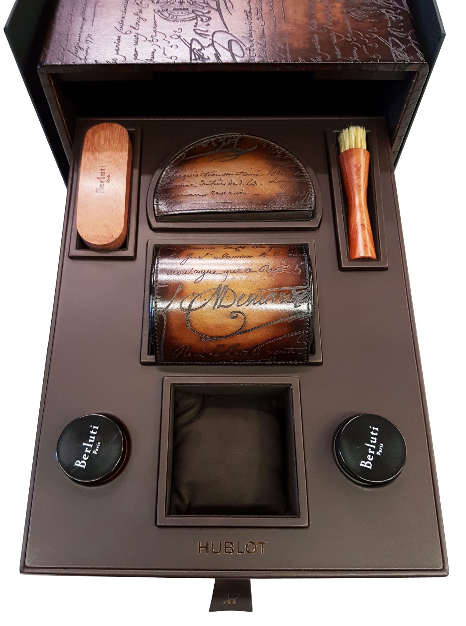 Hublot et Berluti, Berluti et Hublot : l’alliance de ces deux grands noms de l’horlogerie et du soulier sonne comme une évidence. Fondé à Paris en 1895 et développé par quatre générations d’artisans bottiers, Berluti chausse les hommes ne jurant que par son cuir Venezia emblématique dont la patine est le fruit de recherches sans cesse renouvelées. Parfaisant la panoplie de l’homme moderne, s’appuyant sur une tradition horlogère suisse séculaire, Hublot poursuit depuis plus de trente ans sa quête d’innovation continue en inventant des designs iconiques, en investissant dans la recherche de nouveaux matériaux et en battant des records mécaniques.