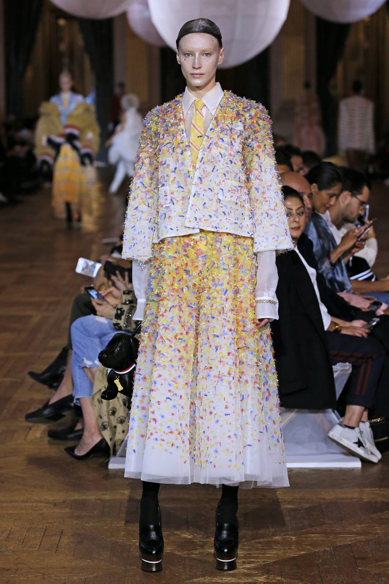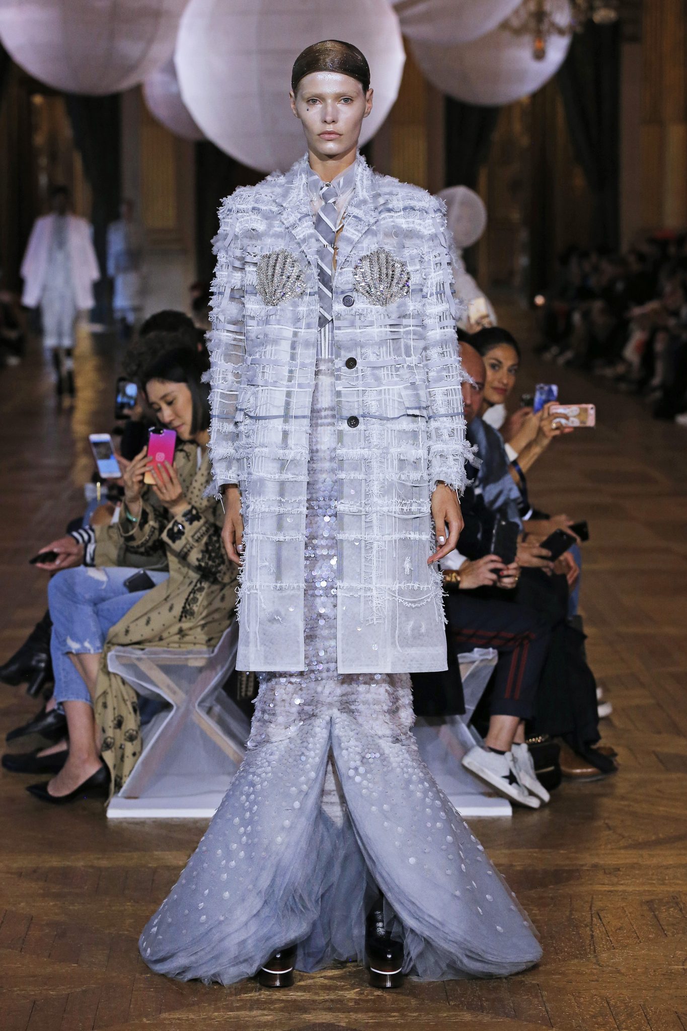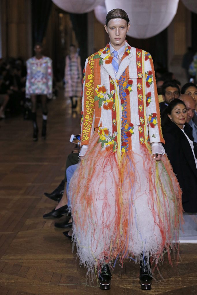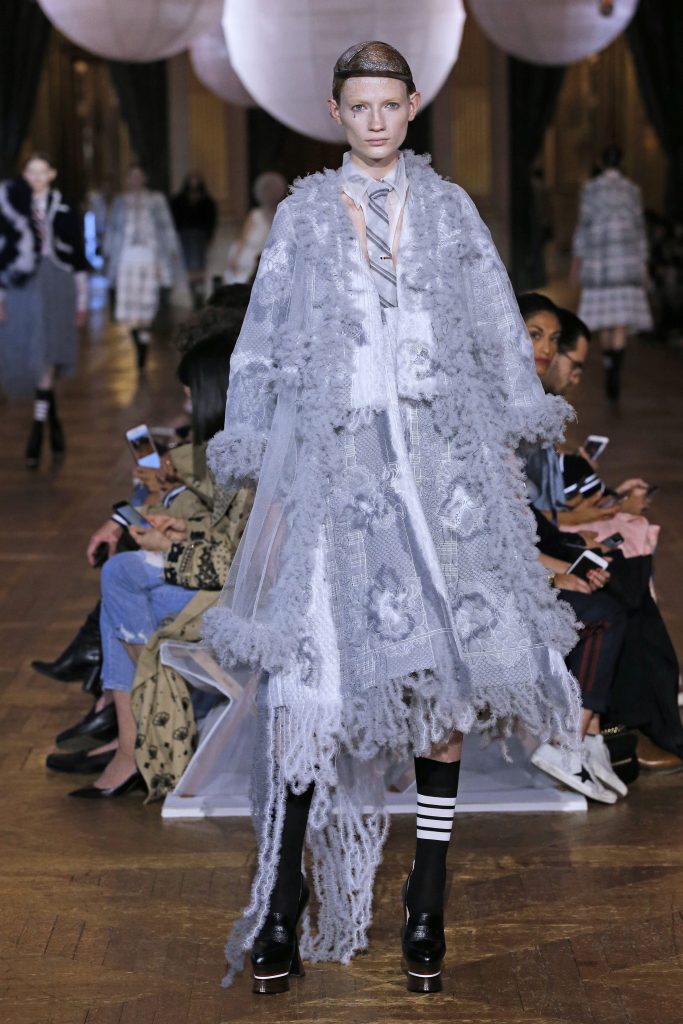 Parlons un peu du contexte, pour cette saison Thom Browne propose « un double rêve, un rêve rêvé d’une autre planète, qui reve d’une autre beauté qui est en fait réalité ». C’est une féérie majestueuse aux personnages fantasques ornés de tulles, de légéreté, comme si ils flottaient.