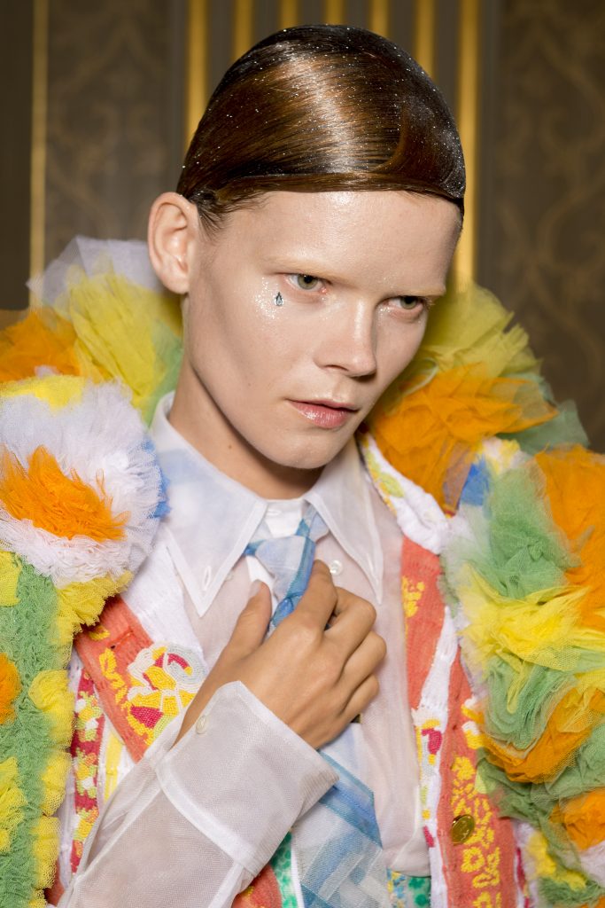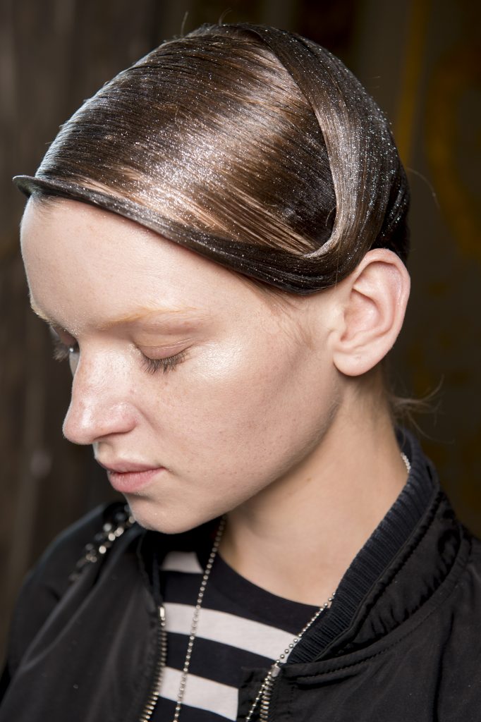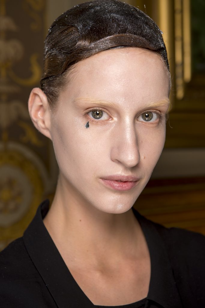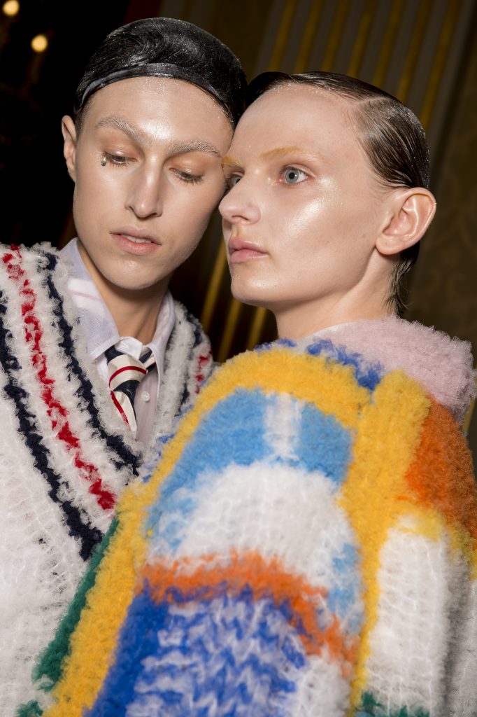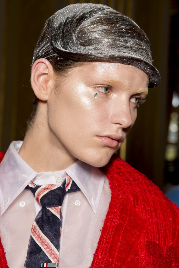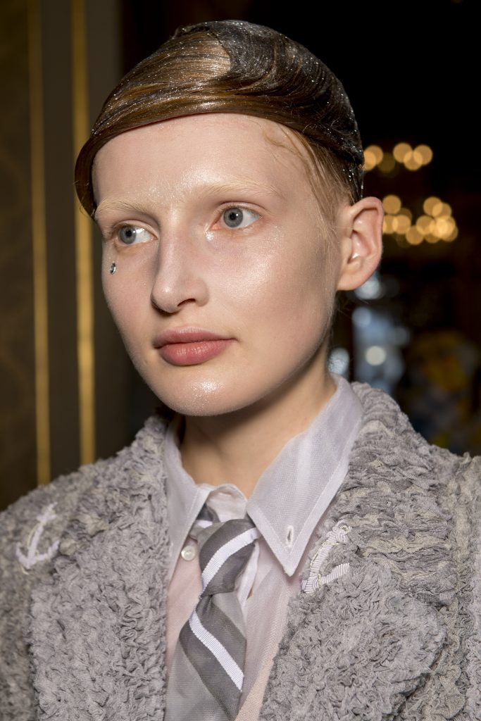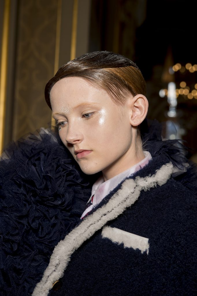 Eugene Souleiman avait donc la lourde mission de s’occuper de la coiffure de ce fantasque show. « Thom Browne m’a demandé de rendre les modèles chauves. J’ai commencé à travailler avec cette idée et construit autour. Mon idée était de créer quelque chose qui fasse penser à un pantin ou mannequin, quelque chose de brillant et irréel comme si ce n’était pas vraiment des cheveux. Je lui ai envoyé quelques references d’une artiste appelé Allen Jones et ça lui a plu. Nous avons transformé ces modèles en sculpture, nous les transformons en faux vrais mannequins. Travailler avec Thom, c’est créer de la magie, quelque chose qui ne vient pas de ce monde »