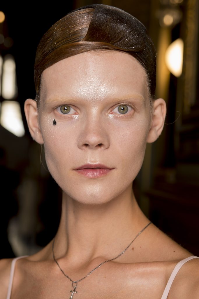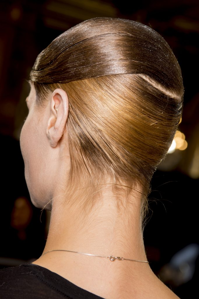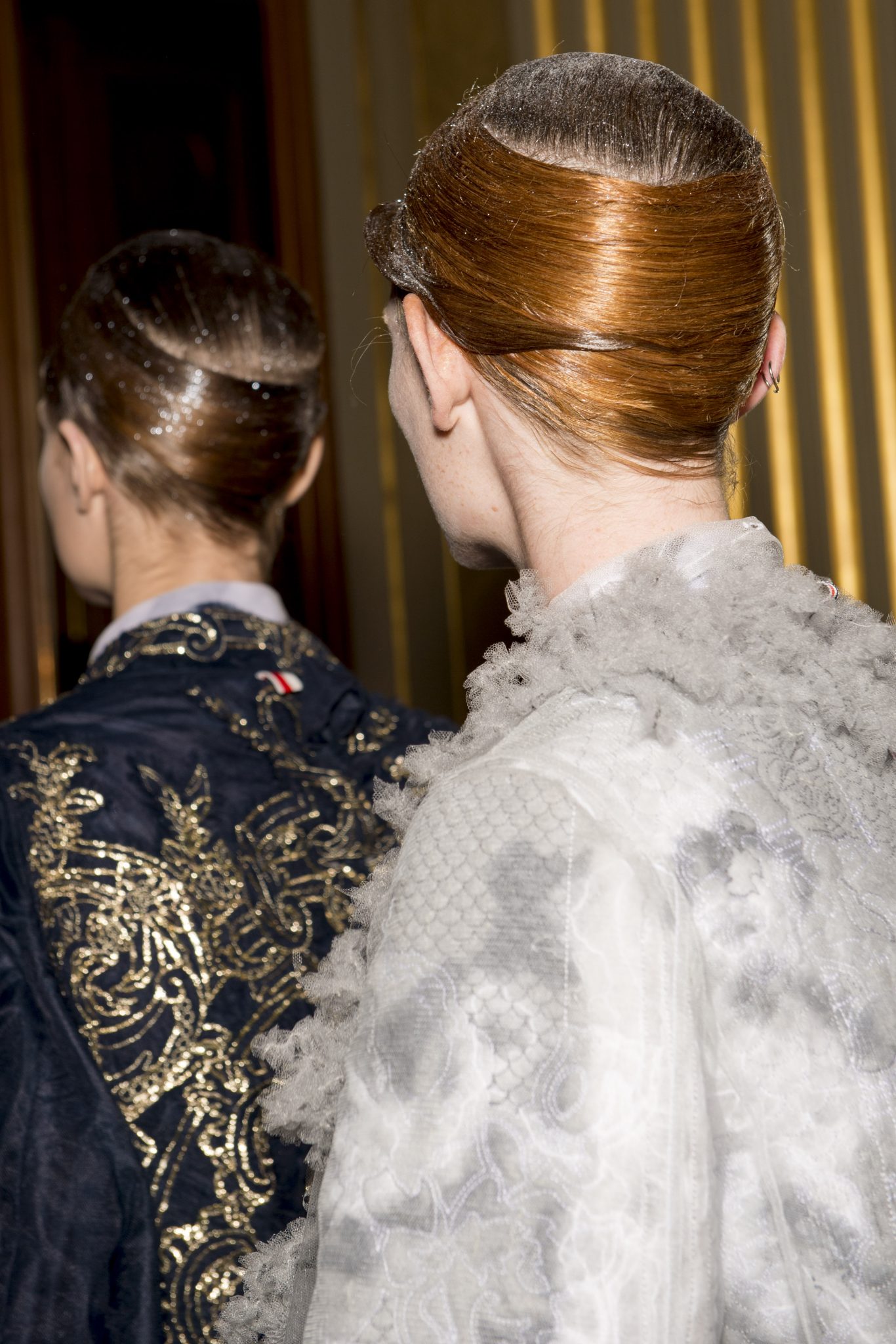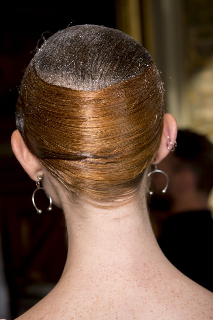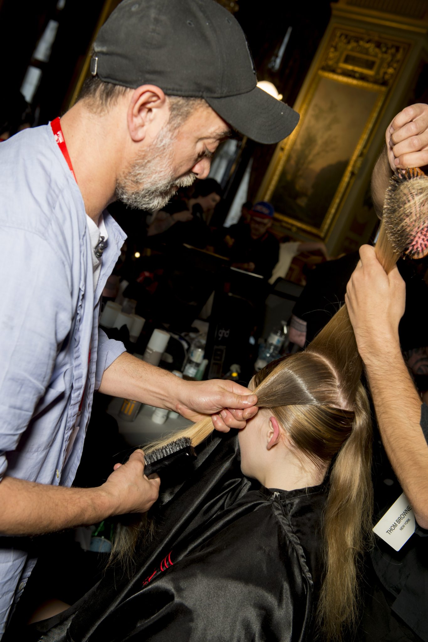 Eugene Souleiman avait donc la lourde mission de s’occuper de la coiffure de ce fantasque show. « Thom Browne m’a demandé de rendre les modèles chauves. J’ai commencé à travailler avec cette idée et construit autour. Mon idée était de créer quelque chose qui fasse penser à un pantin ou mannequin, quelque chose de brillant et irréel comme si ce n’était pas vraiment des cheveux. Je lui ai envoyé quelques references d’une artiste appelé Allen Jones et ça lui a plu. Nous avons transformé ces modèles en sculpture, nous les transformons en faux vrais mannequins. Travailler avec Thom, c’est créer de la magie, quelque chose qui ne vient pas de ce monde »