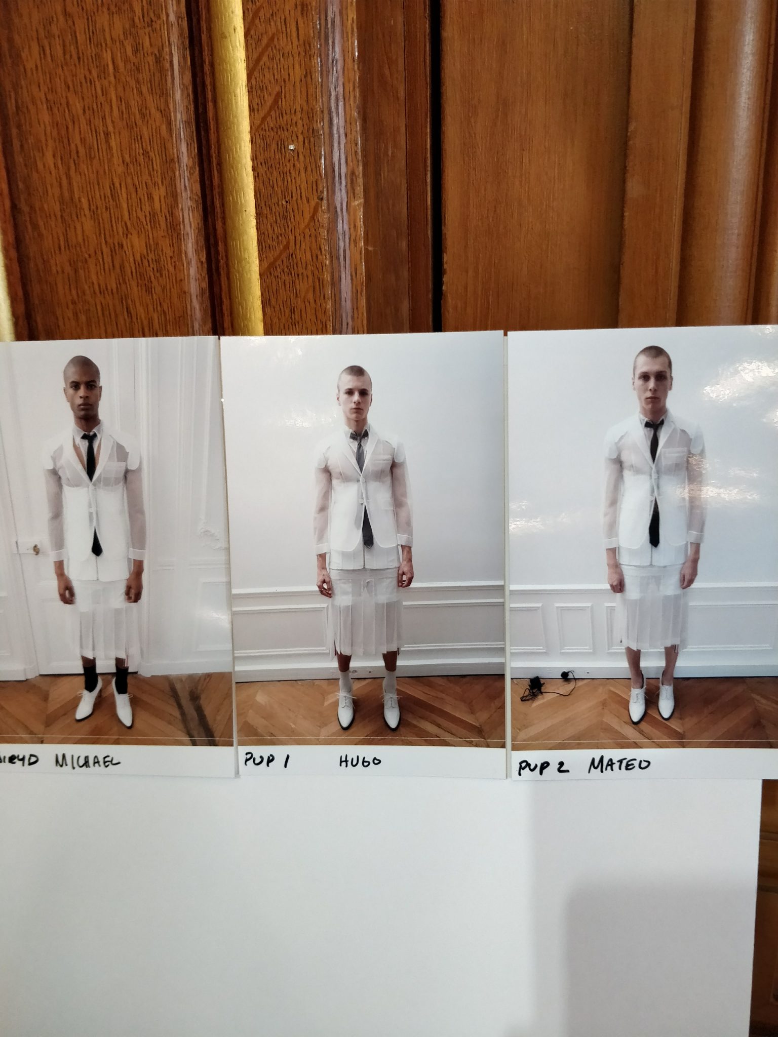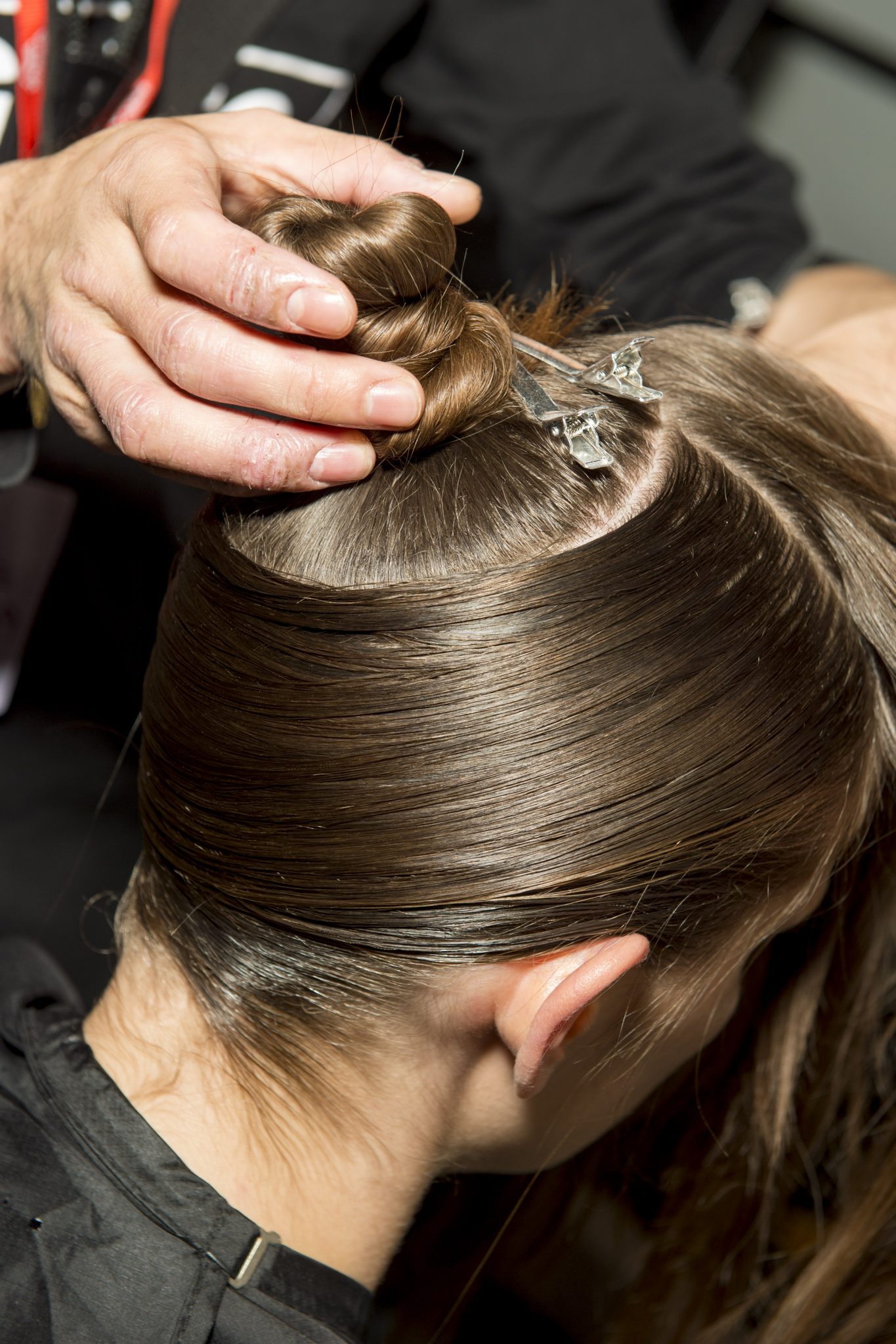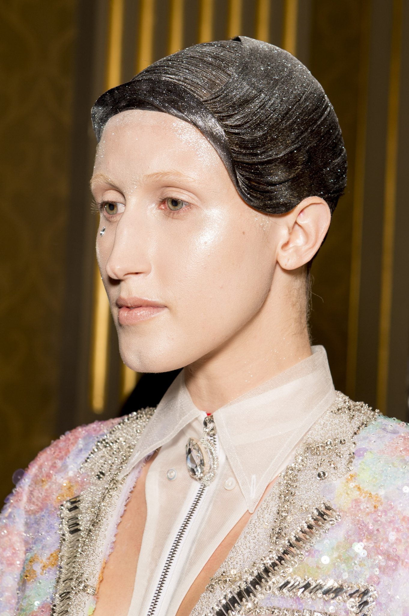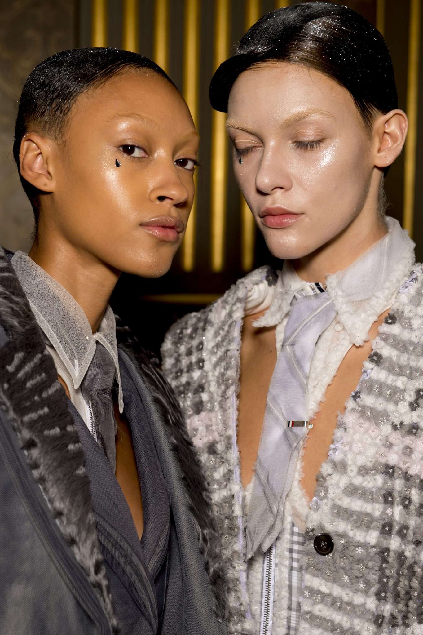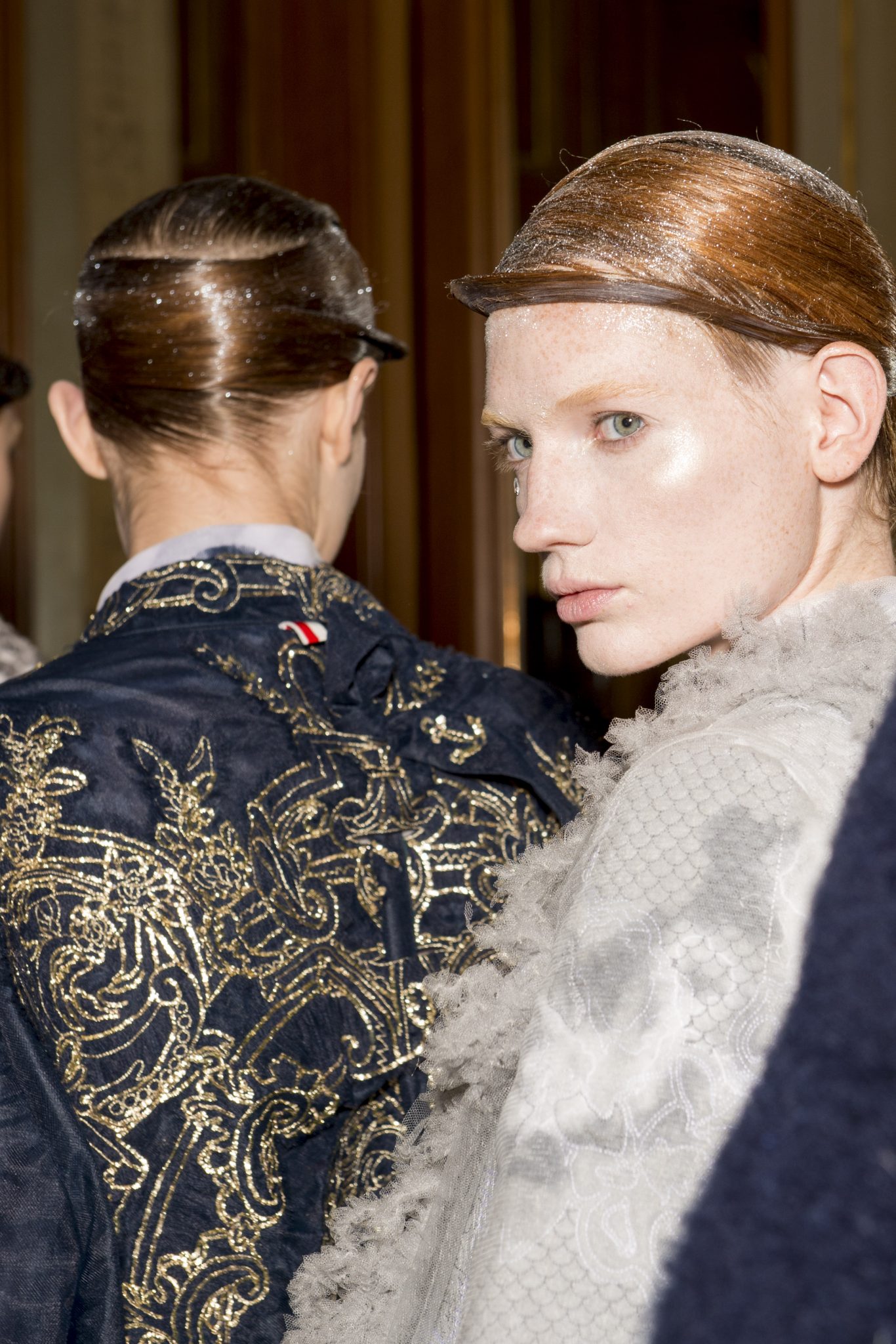 Eugene Souleiman avait donc la lourde mission de s’occuper de la coiffure de ce fantasque show. « Thom Browne m’a demandé de rendre les modèles chauves. J’ai commencé à travailler avec cette idée et construit autour. Mon idée était de créer quelque chose qui fasse penser à un pantin ou mannequin, quelque chose de brillant et irréel comme si ce n’était pas vraiment des cheveux. Je lui ai envoyé quelques references d’une artiste appelé Allen Jones et ça lui a plu. Nous avons transformé ces modèles en sculpture, nous les transformons en faux vrais mannequins. Travailler avec Thom, c’est créer de la magie, quelque chose qui ne vient pas de ce monde »