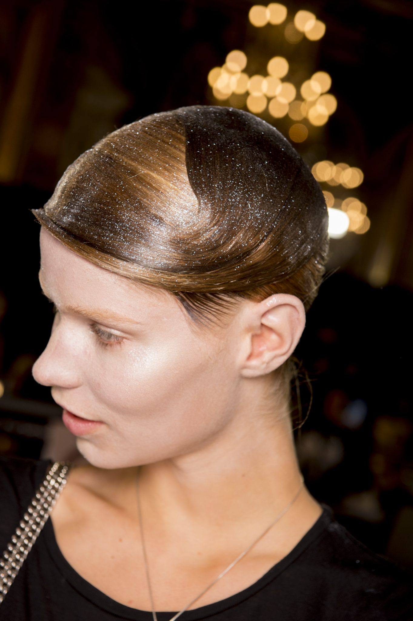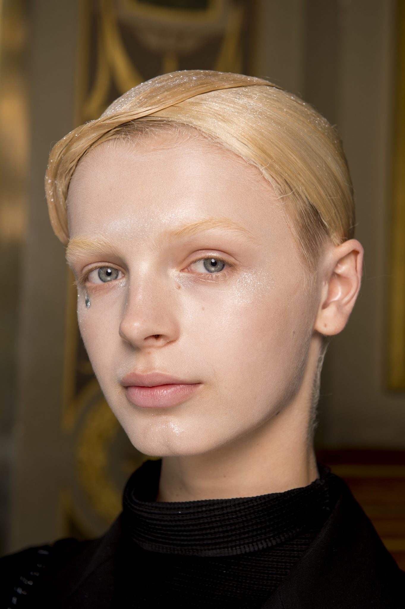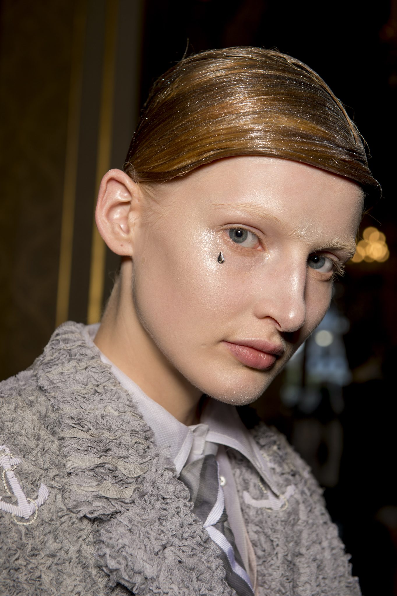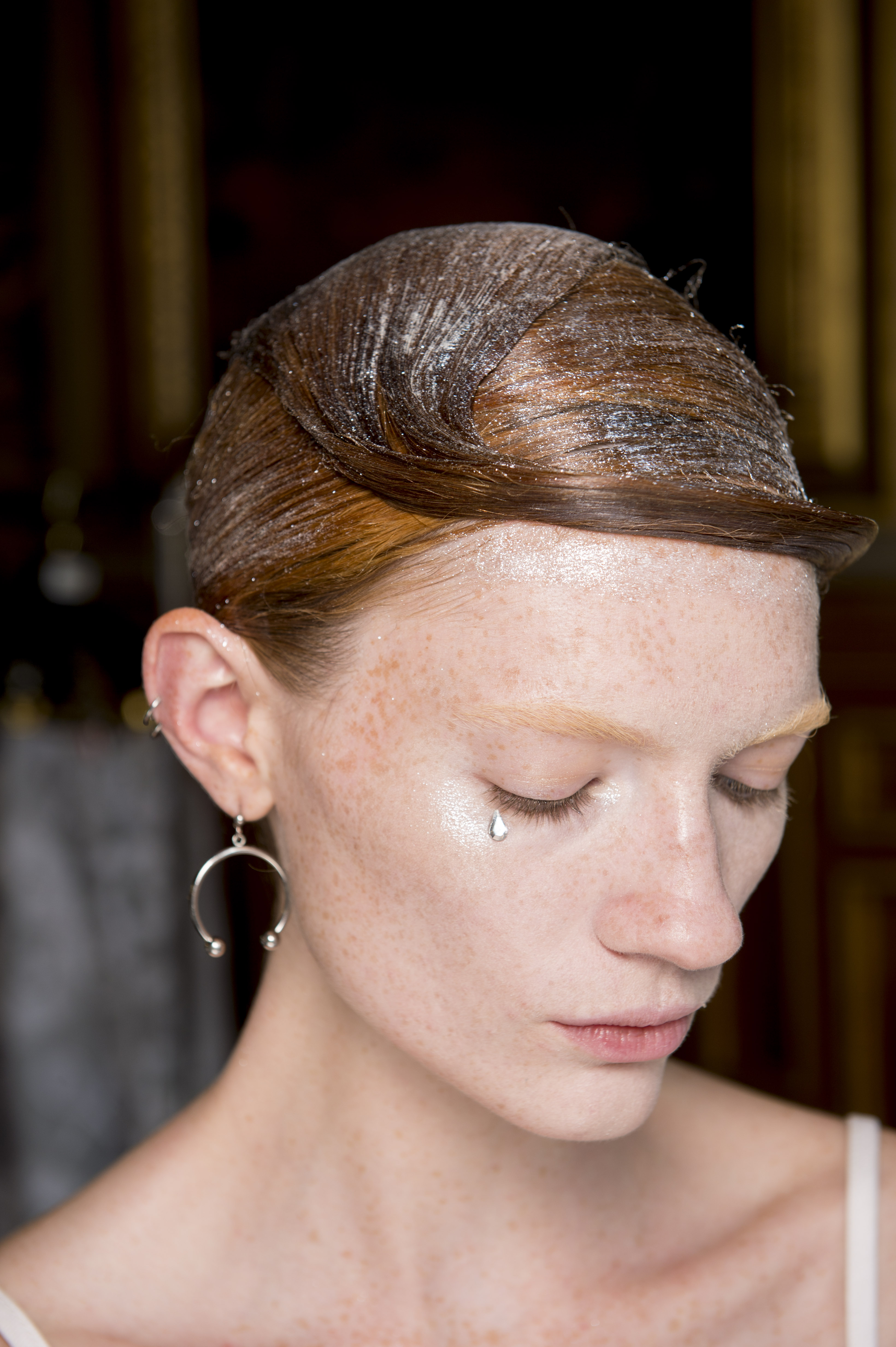 Eugene Souleiman avait donc la lourde mission de s’occuper de la coiffure de ce fantasque show. « Thom Browne m’a demandé de rendre les modèles chauves. J’ai commencé à travailler avec cette idée et construit autour. Mon idée était de créer quelque chose qui fasse penser à un pantin ou mannequin, quelque chose de brillant et irréel comme si ce n’était pas vraiment des cheveux. Je lui ai envoyé quelques references d’une artiste appelé Allen Jones et ça lui a plu. Nous avons transformé ces modèles en sculpture, nous les transformons en faux vrais mannequins. Travailler avec Thom, c’est créer de la magie, quelque chose qui ne vient pas de ce monde »