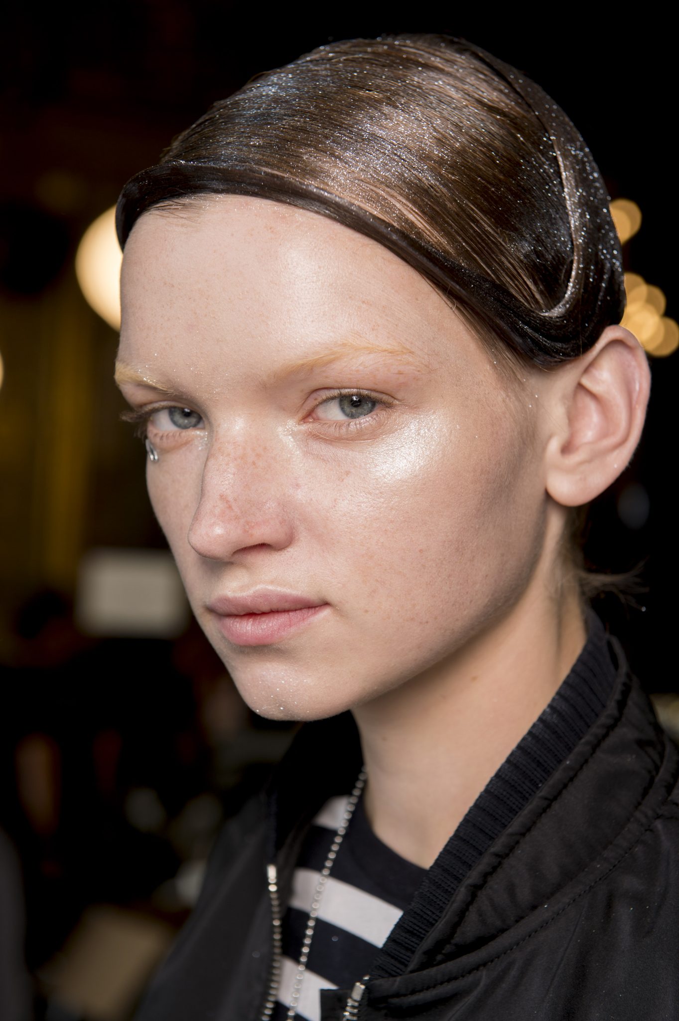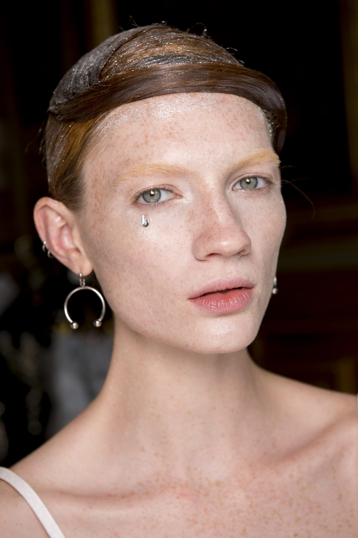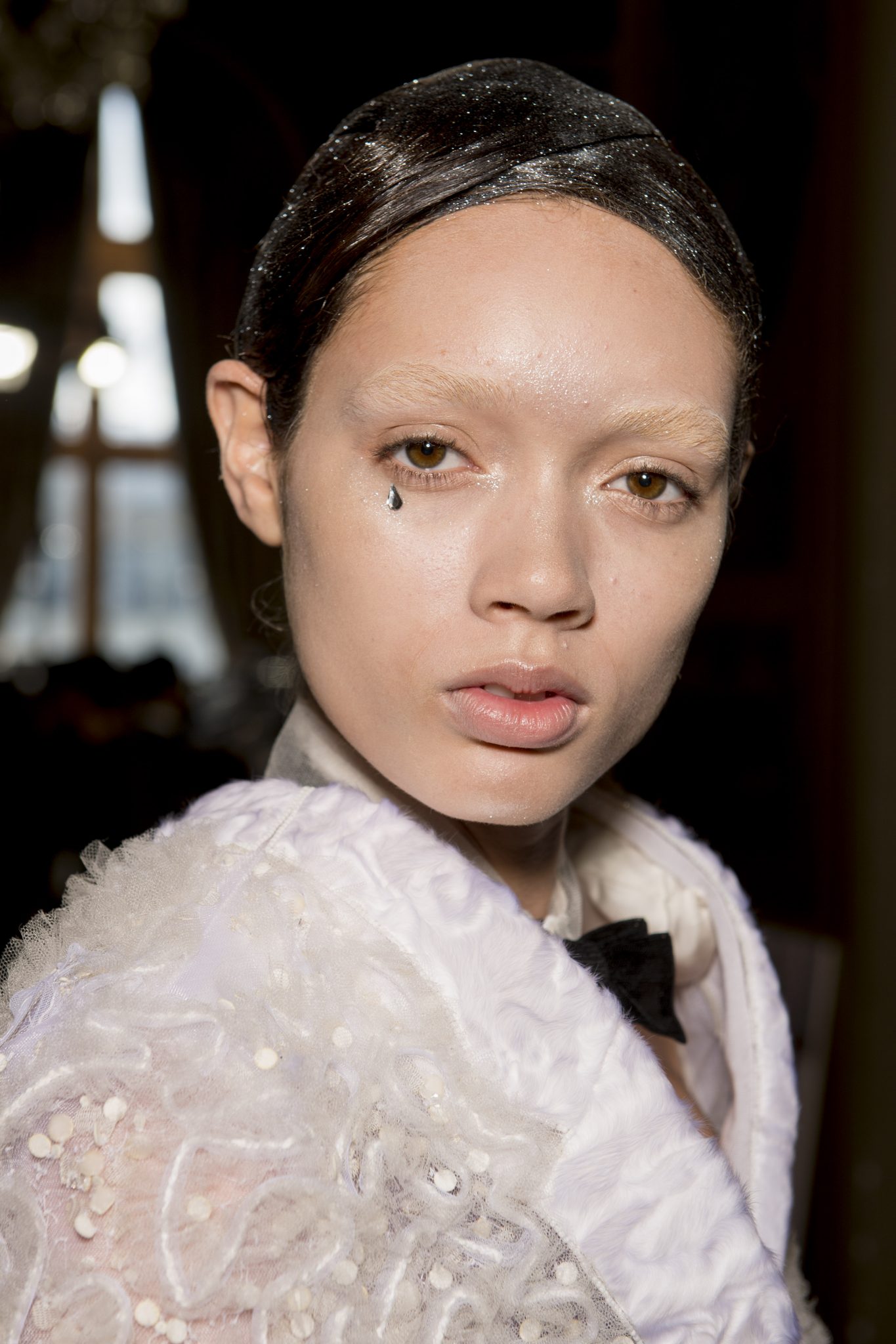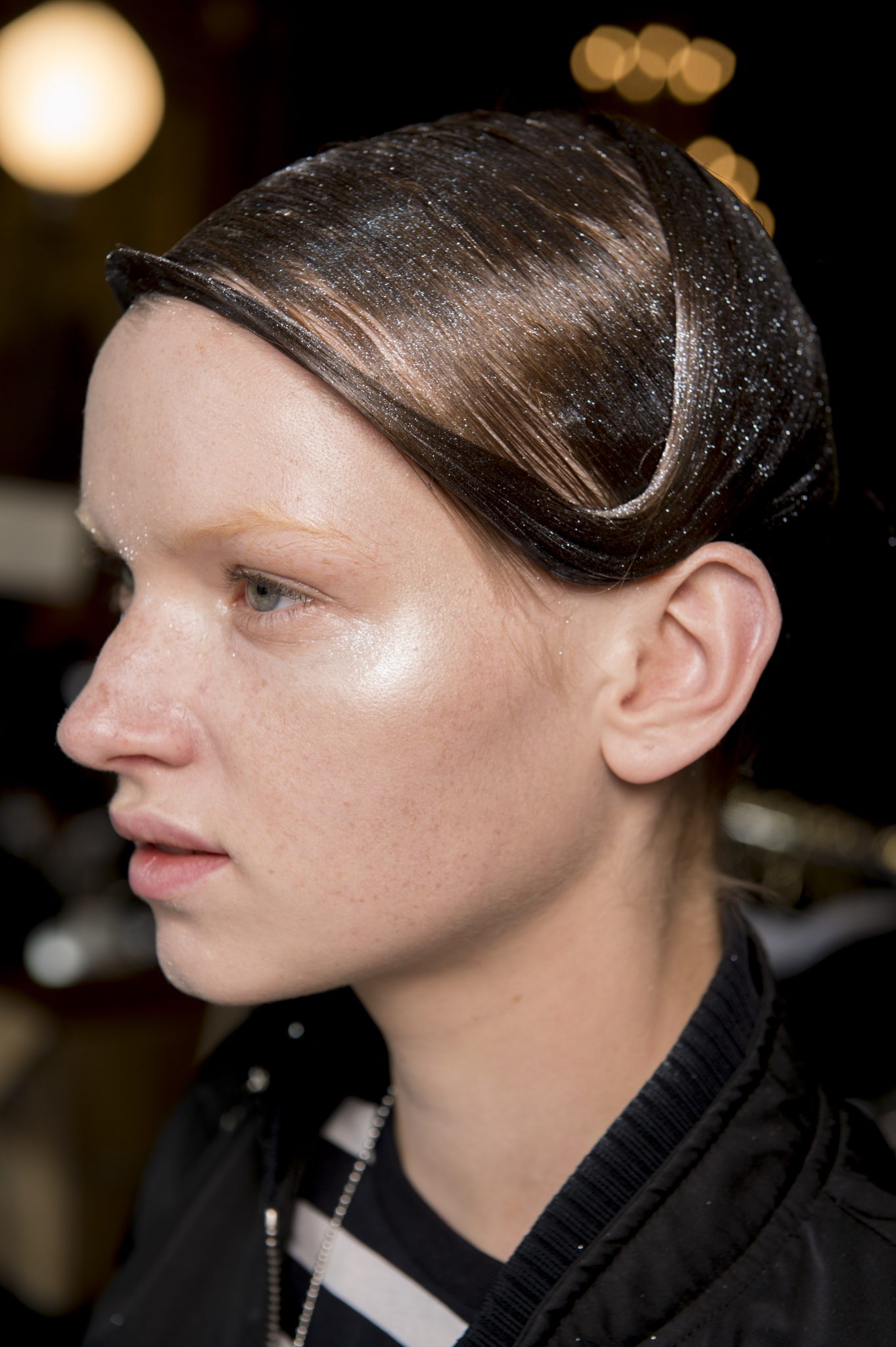 Eugene Souleiman avait donc la lourde mission de s’occuper de la coiffure de ce fantasque show. « Thom Browne m’a demandé de rendre les modèles chauves. J’ai commencé à travailler avec cette idée et construit autour. Mon idée était de créer quelque chose qui fasse penser à un pantin ou mannequin, quelque chose de brillant et irréel comme si ce n’était pas vraiment des cheveux. Je lui ai envoyé quelques references d’une artiste appelé Allen Jones et ça lui a plu. Nous avons transformé ces modèles en sculpture, nous les transformons en faux vrais mannequins. Travailler avec Thom, c’est créer de la magie, quelque chose qui ne vient pas de ce monde »
