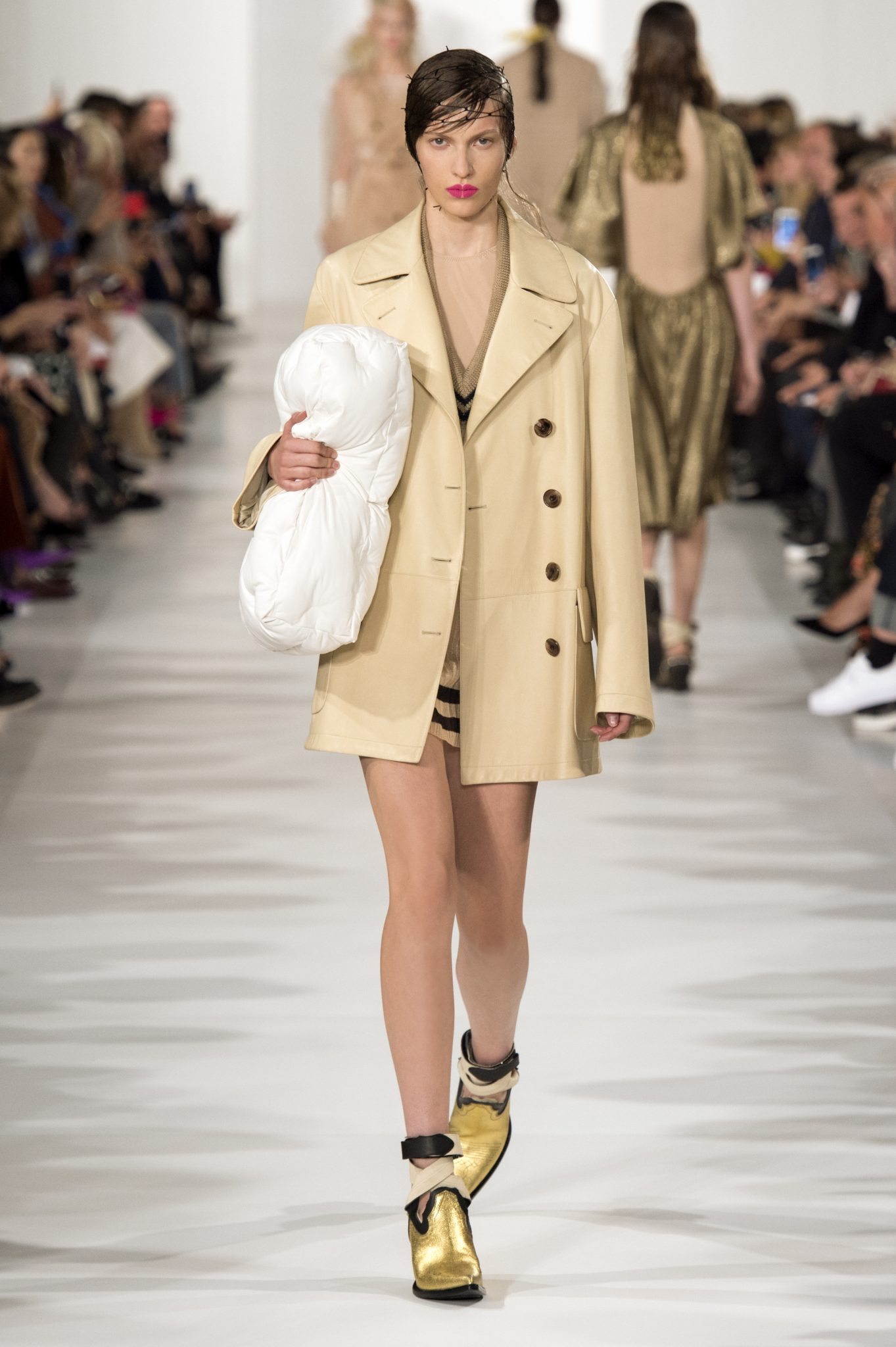 Le t-shirt reprend une nouvelle importance à mesure que le décortiqué s’applique, le réduisant à son noyau et le taillant avec panache – un harnais qui peut être porté sur un manteau sur mesure ou une robe de soirée. Les notions originelles de glamour sont répétées: le soutien-gorge, le plissé soleil et l’or. Le manteau rouge homme est coupé dans une robe avec un décolleté amoureux et un dos plissé. Le glamour chaotique des voyages s’exprime par un vêtement en transit. Le Glam Slam fait ses débuts sur la piste. Le nouveau sac culte de Maison Margiela est un sac de cuir léger en forme de nuage, évoquant des associations universelles de confort. «Nous nous sommes mis à proposer et à explorer davantage l’idée d’un nouveau glamour qui nous séduit dans notre vie quotidienne.» – Maison Margiela