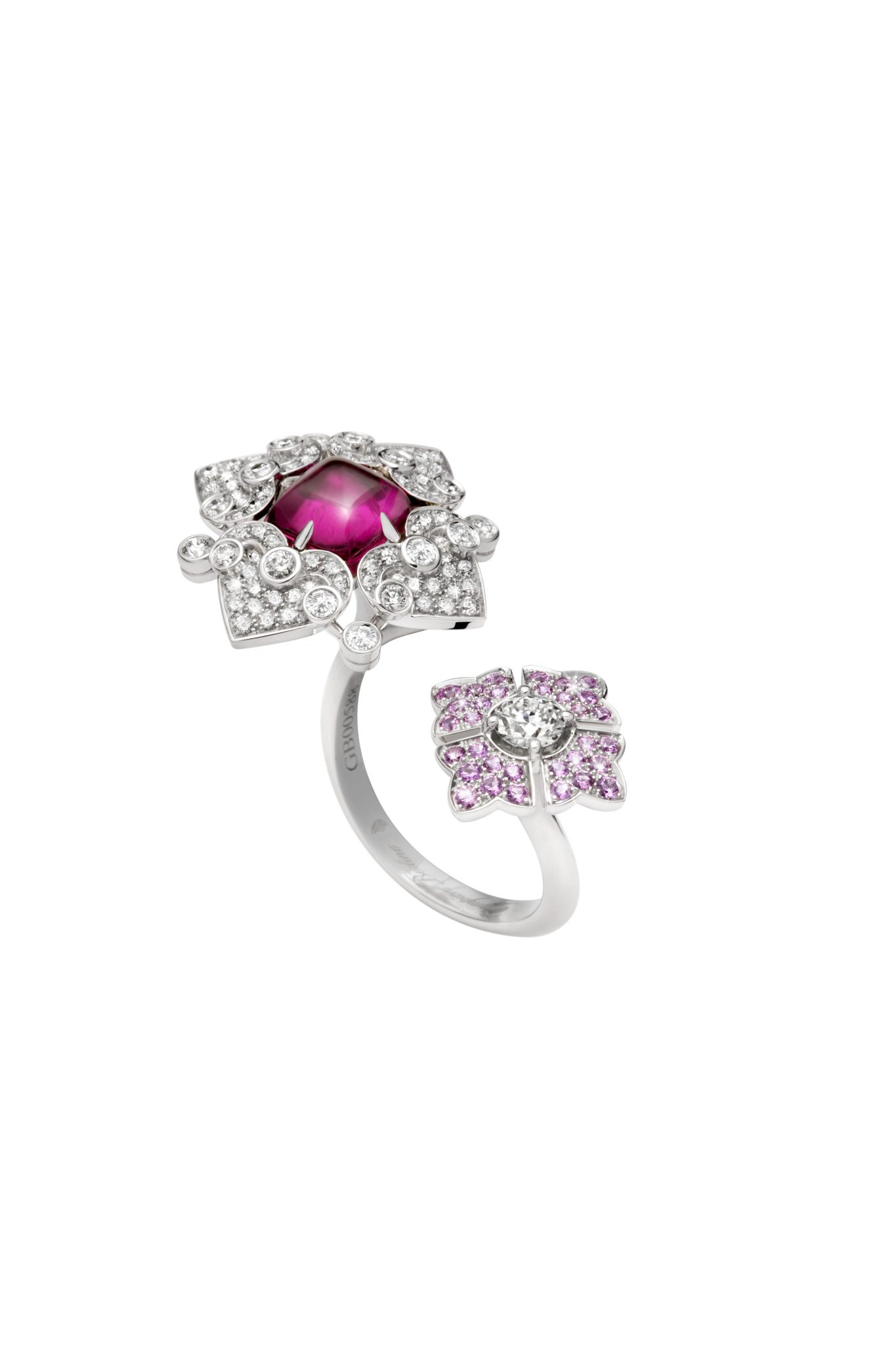 C’est aussi un motif cher à Giampiero Bodino, qui a toujours apprécié sa simplicité. À travers cette collection aussi limitée qu’exceptionnelle, le créateur conjugue au présent ce motif ancestral, avec cinq pièces de haute joaillerie dans lesquels les diamants jouent les premiers rôles, sublimant les quatre pointes de la rose des vents pour en souligner la pureté, la précision, l’harmonie et l’élégance. Un cabochon de rubellite vient rehausser la partie centrale de l’un des trois bracelets, proposé en parure avec une superbe bague alternant rubellite et pavage de saphirs roses, dans une subtile référence aux couleurs de Noël.