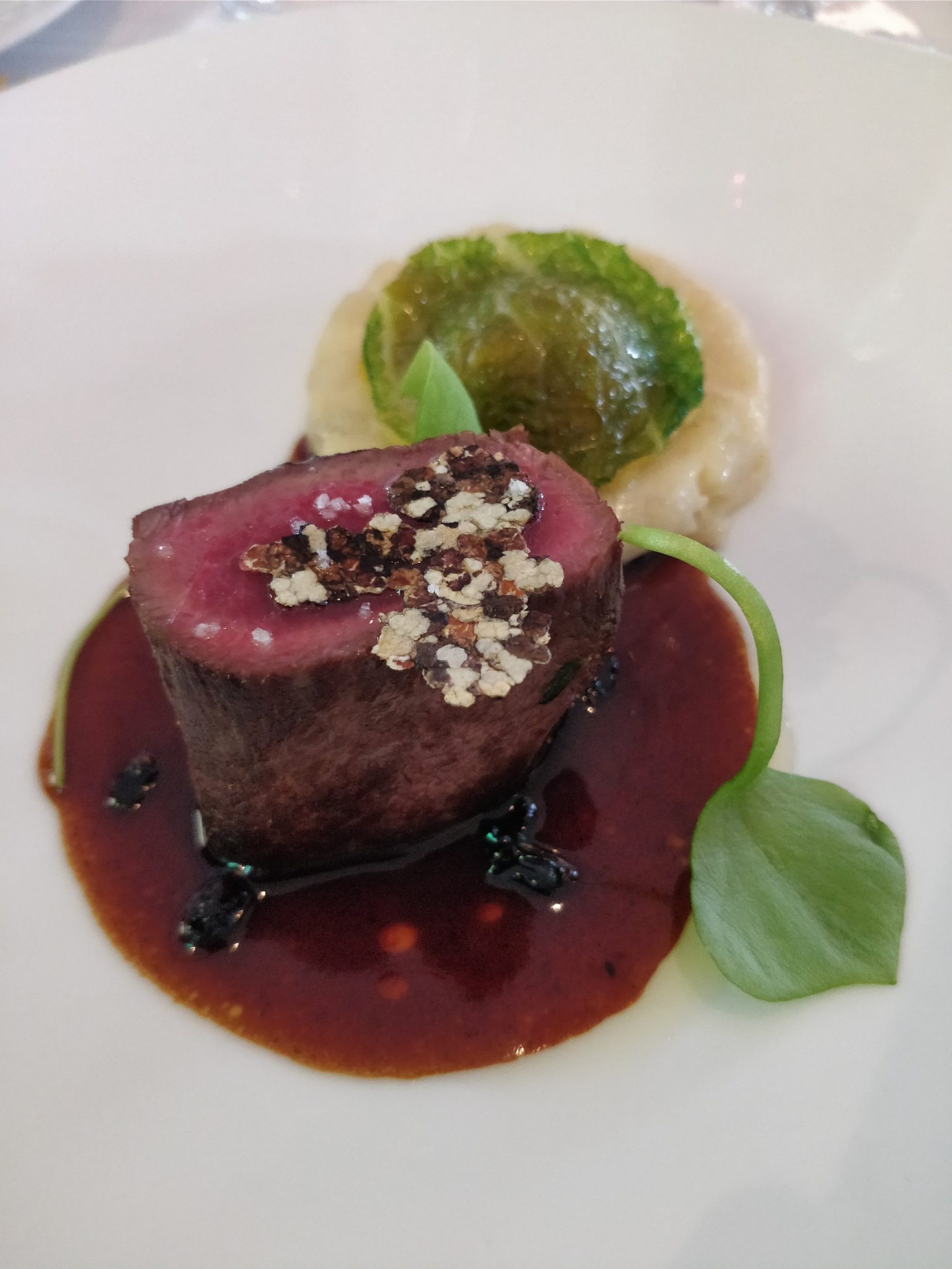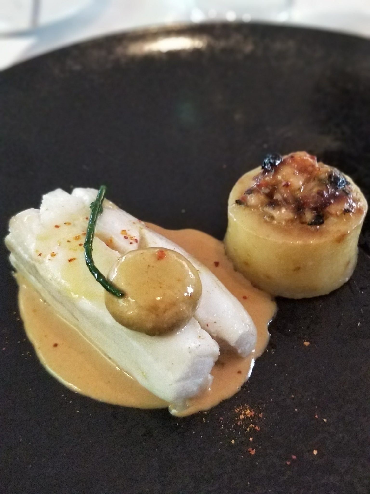À l’épine vinette acidulée et feuille de poivre, salsifis glacés et raviole de choux