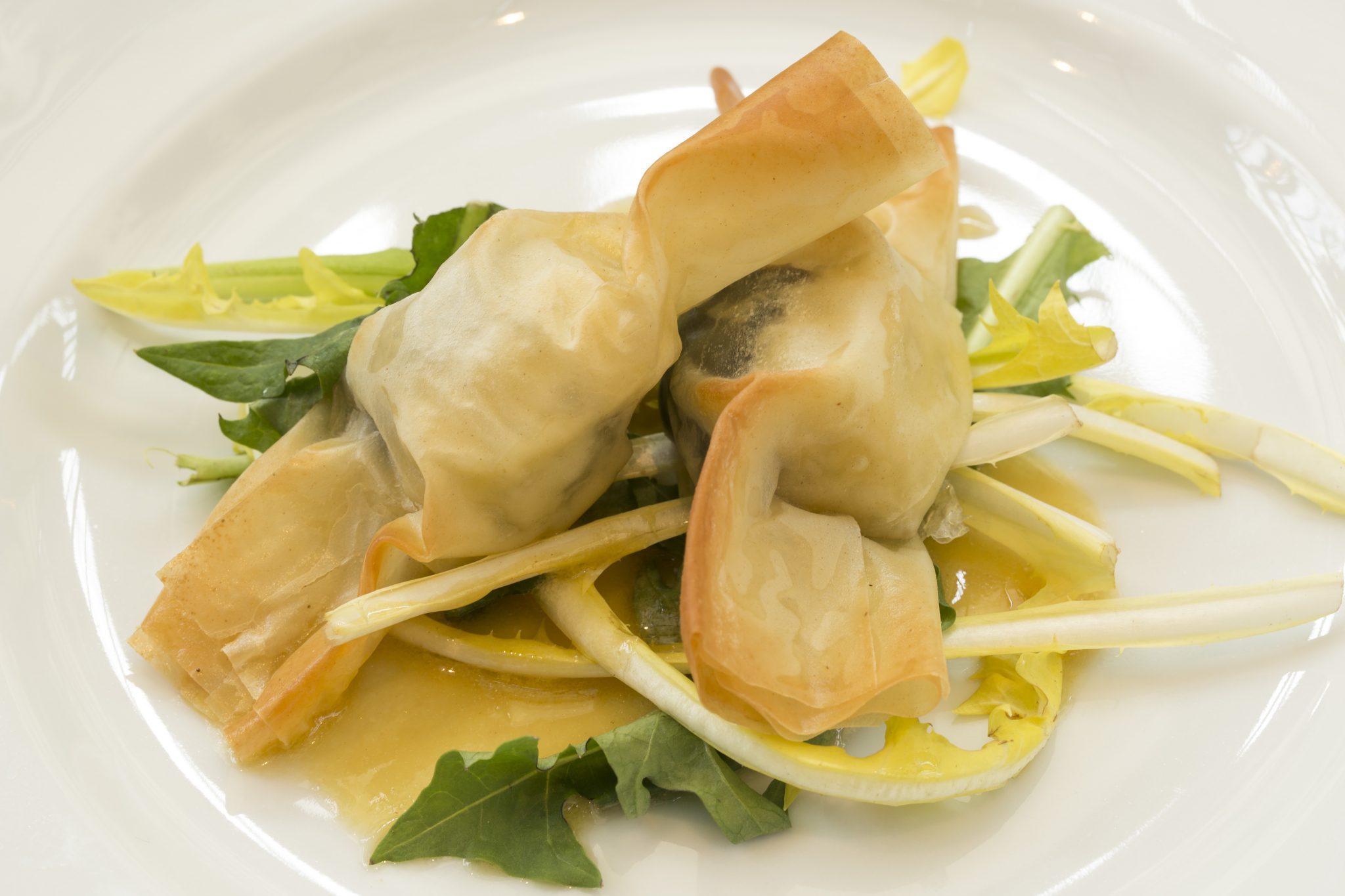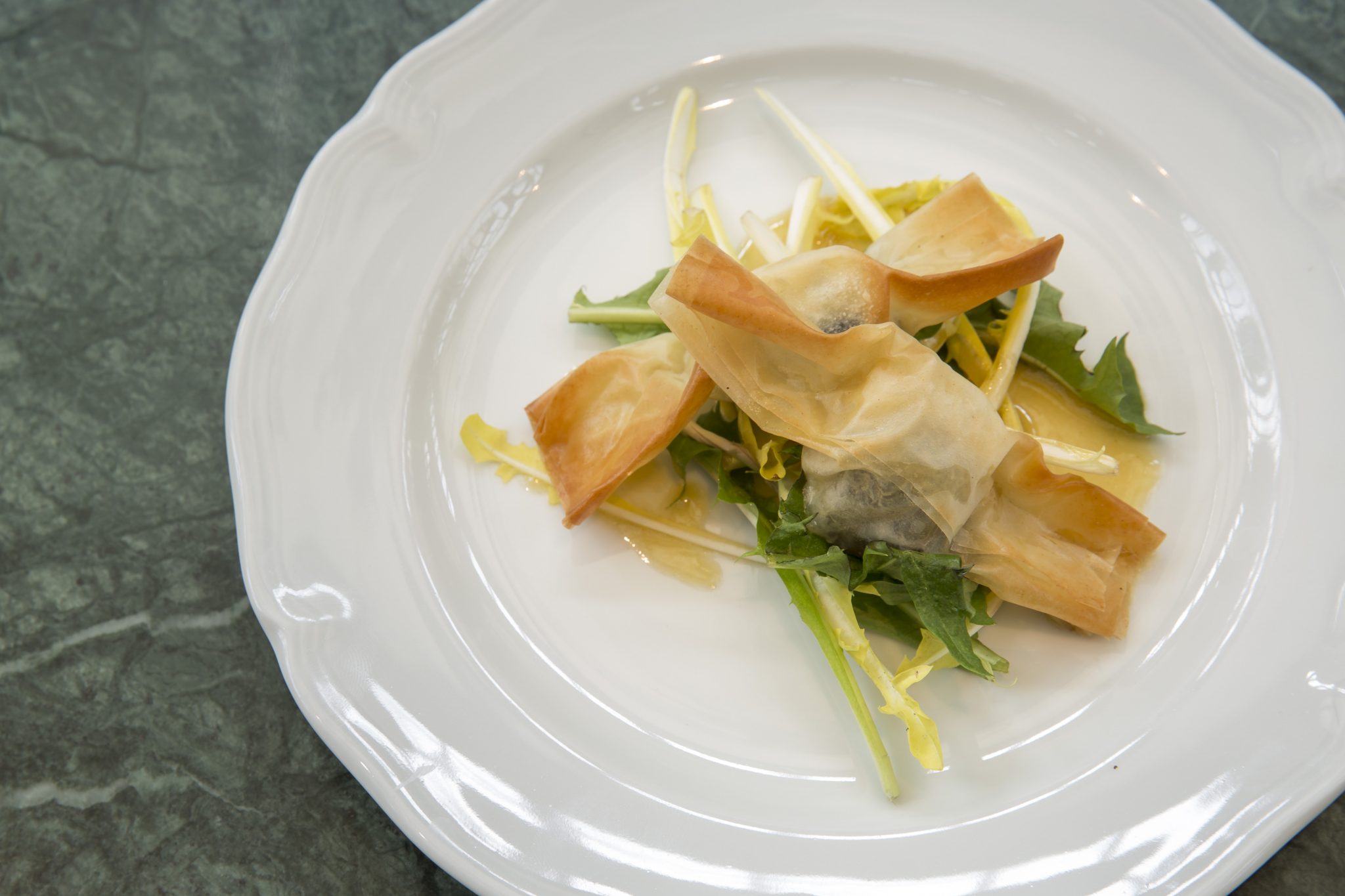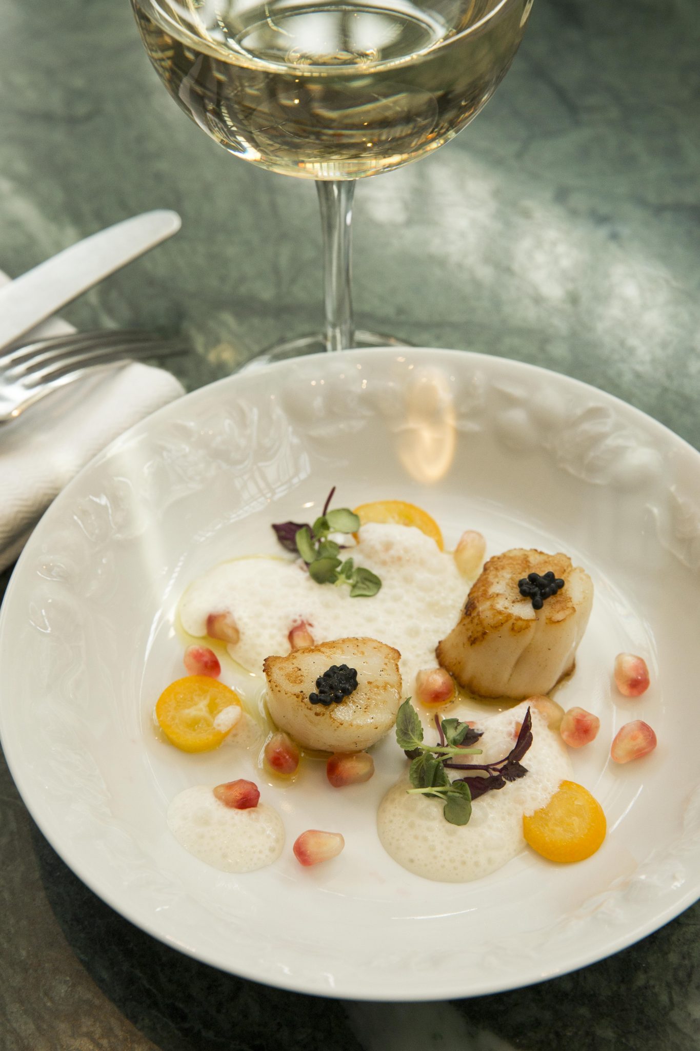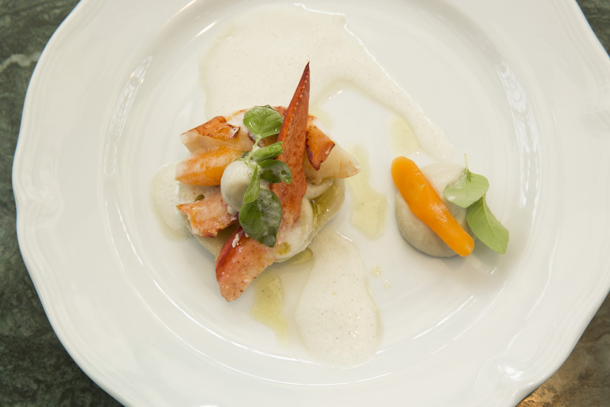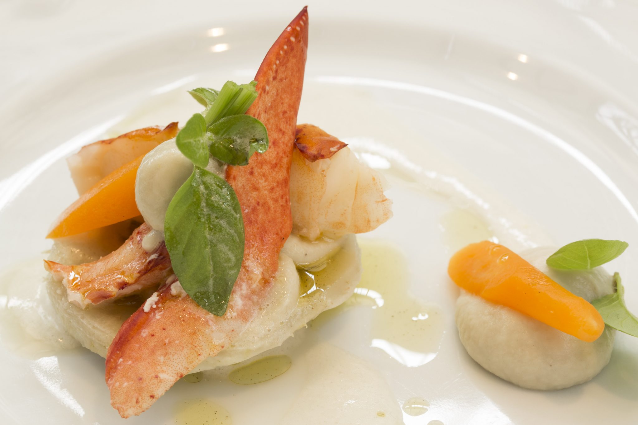 Coupe de Champagne et amuse-bouches, Ravioles de foie gras et cèpes, topinambour crémeux, Homard en salade, haricots verts et artichauts, citron et caviar de hareng, Filet de Bœuf, carpaccio de champignons marinés, sauce tigre, Brie truffé