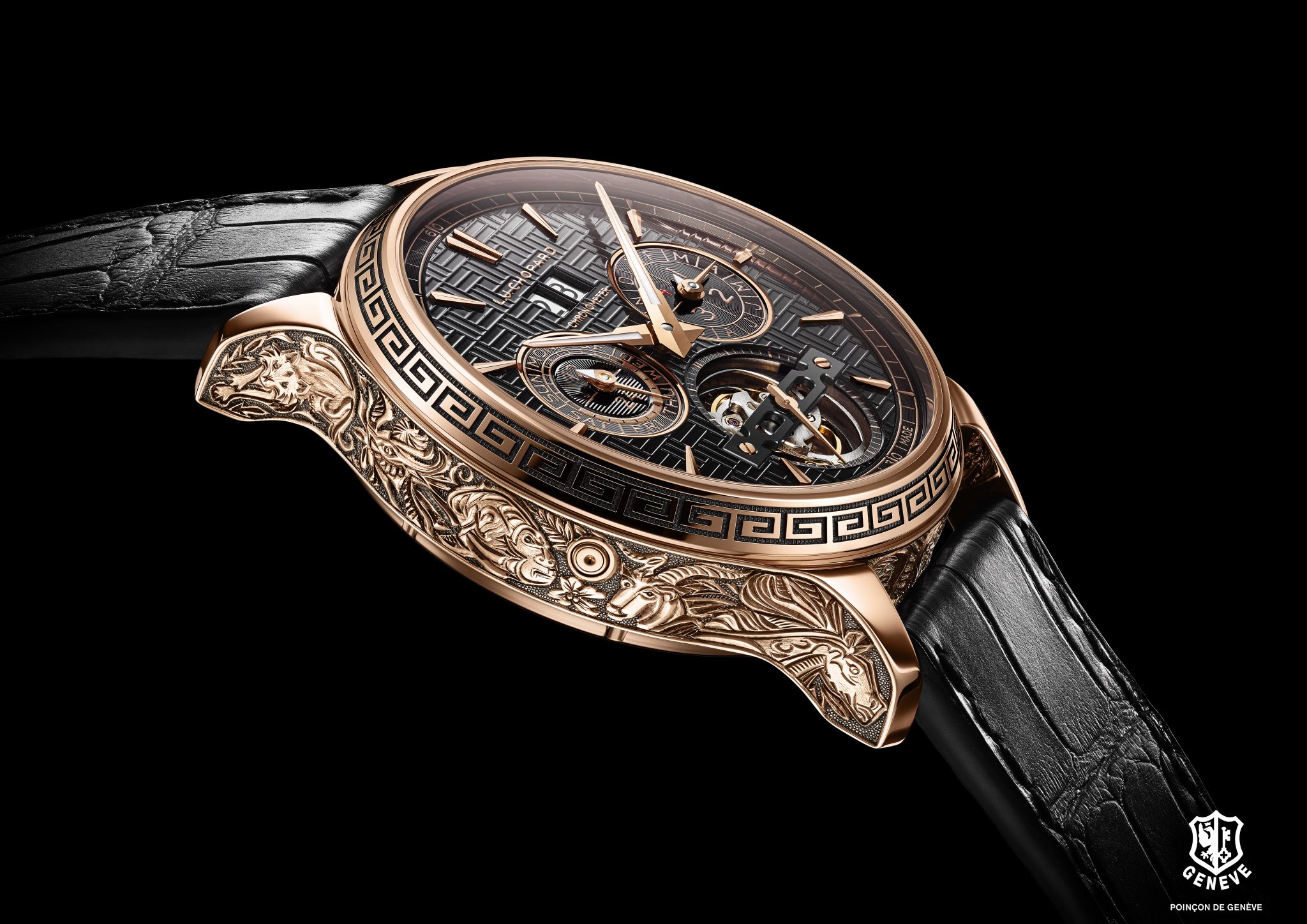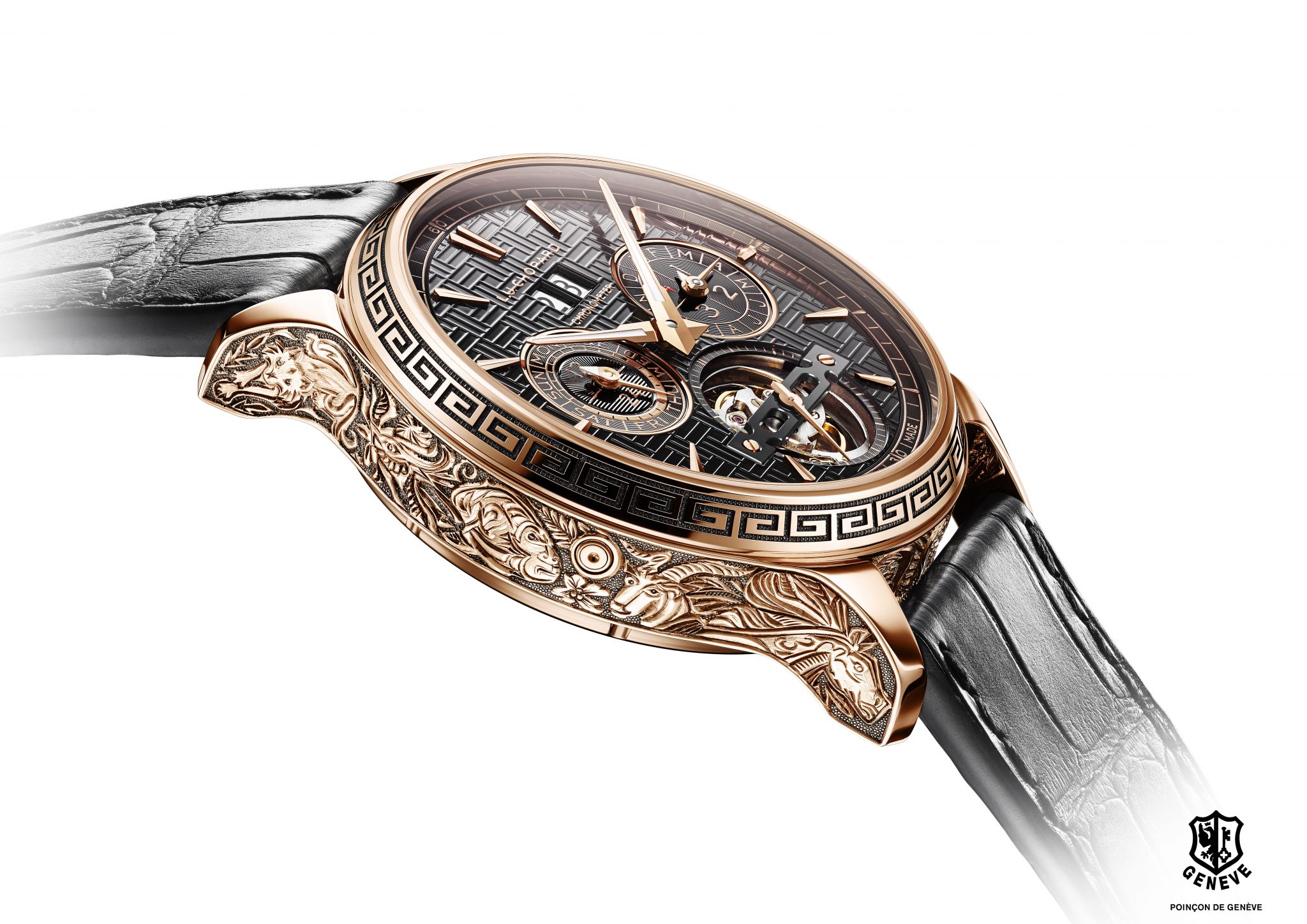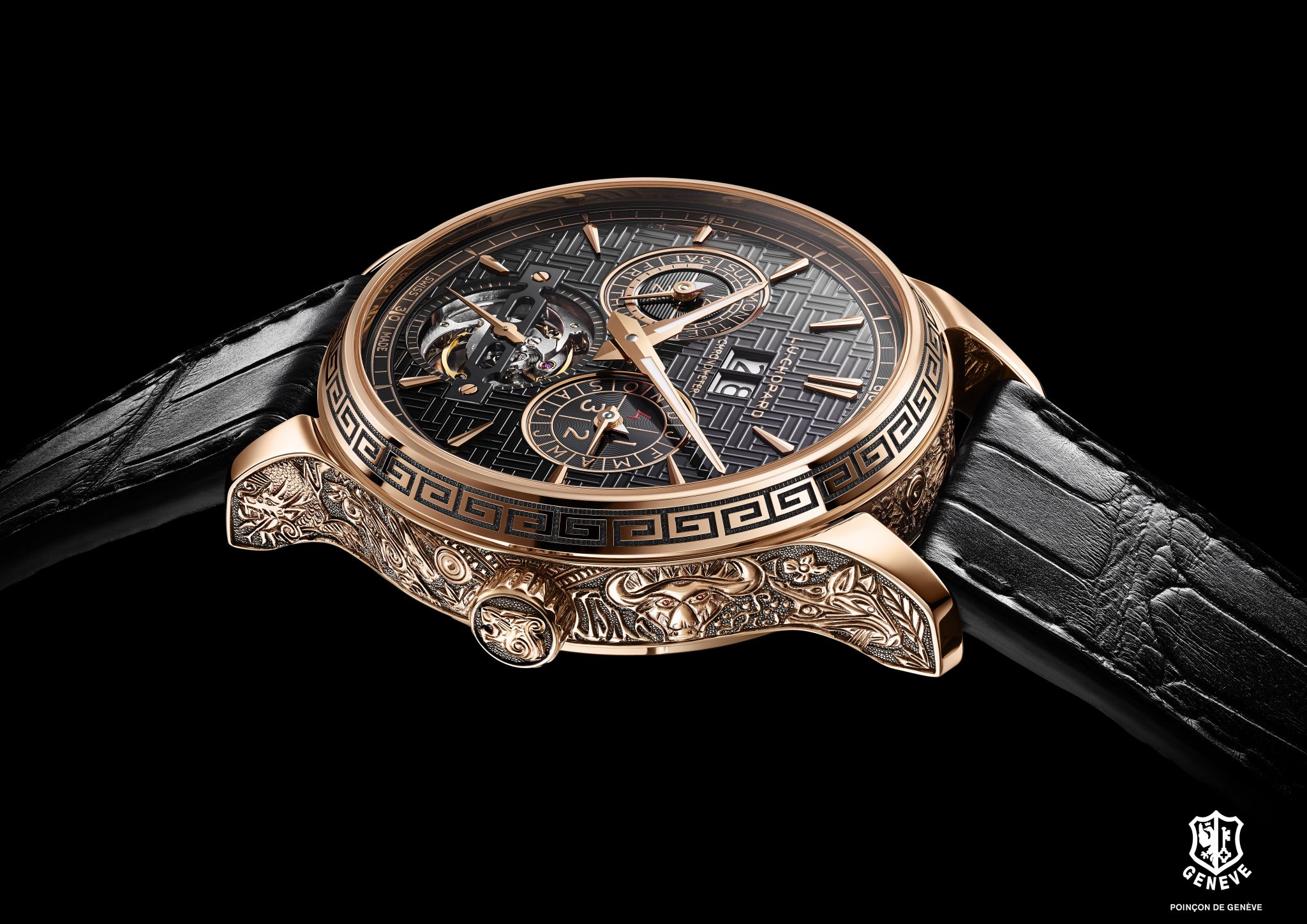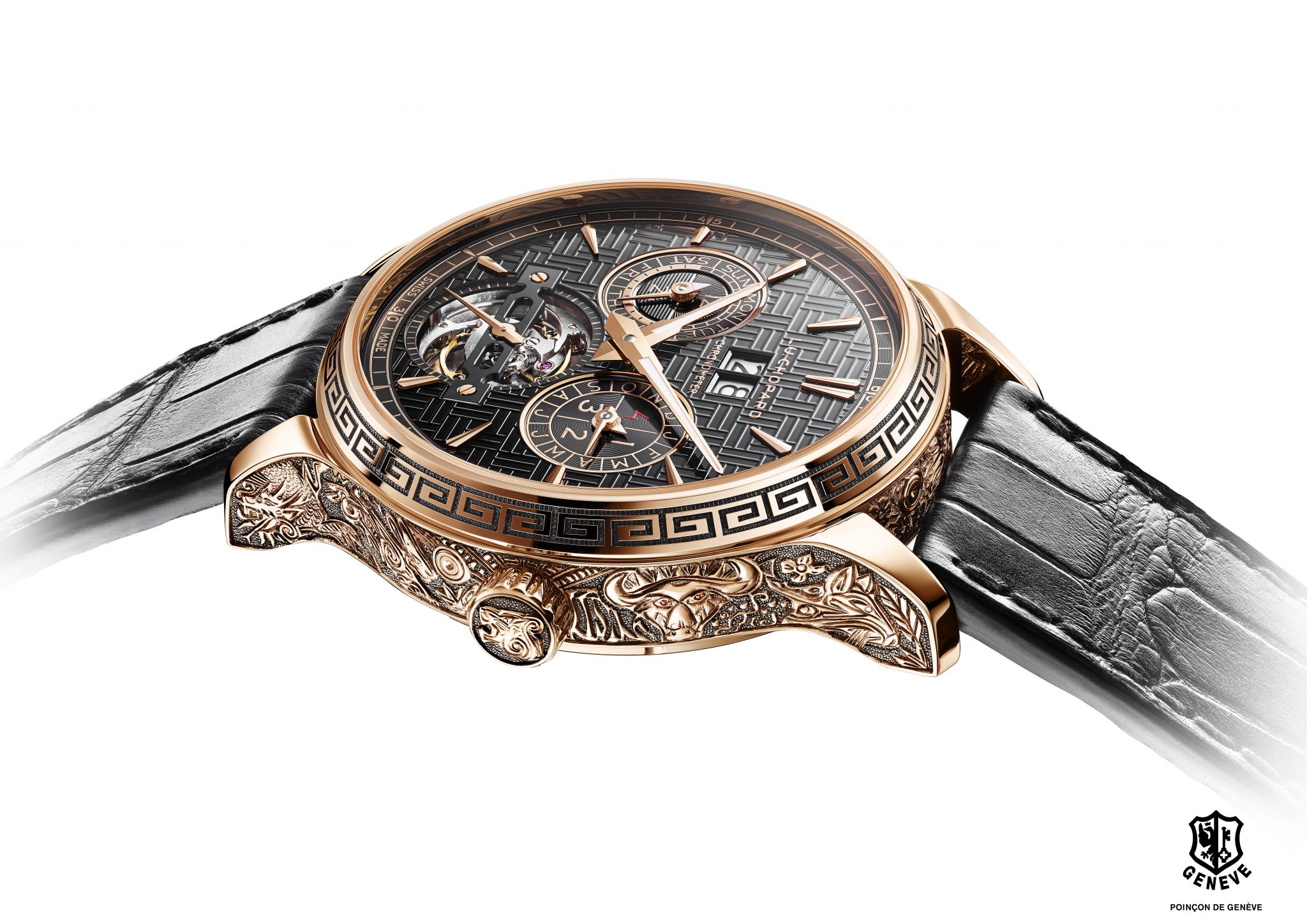 Les artisans de la Maison Chopard ont réalisé un boîtier en or rose gravé intégralement à la main et représentant les 12 signes du zodiaque. Véritable prouesse artistique, cette œuvre artisanale qui rend hommage à une culture millénaire, est réservée au plus avisé des collectionneurs.