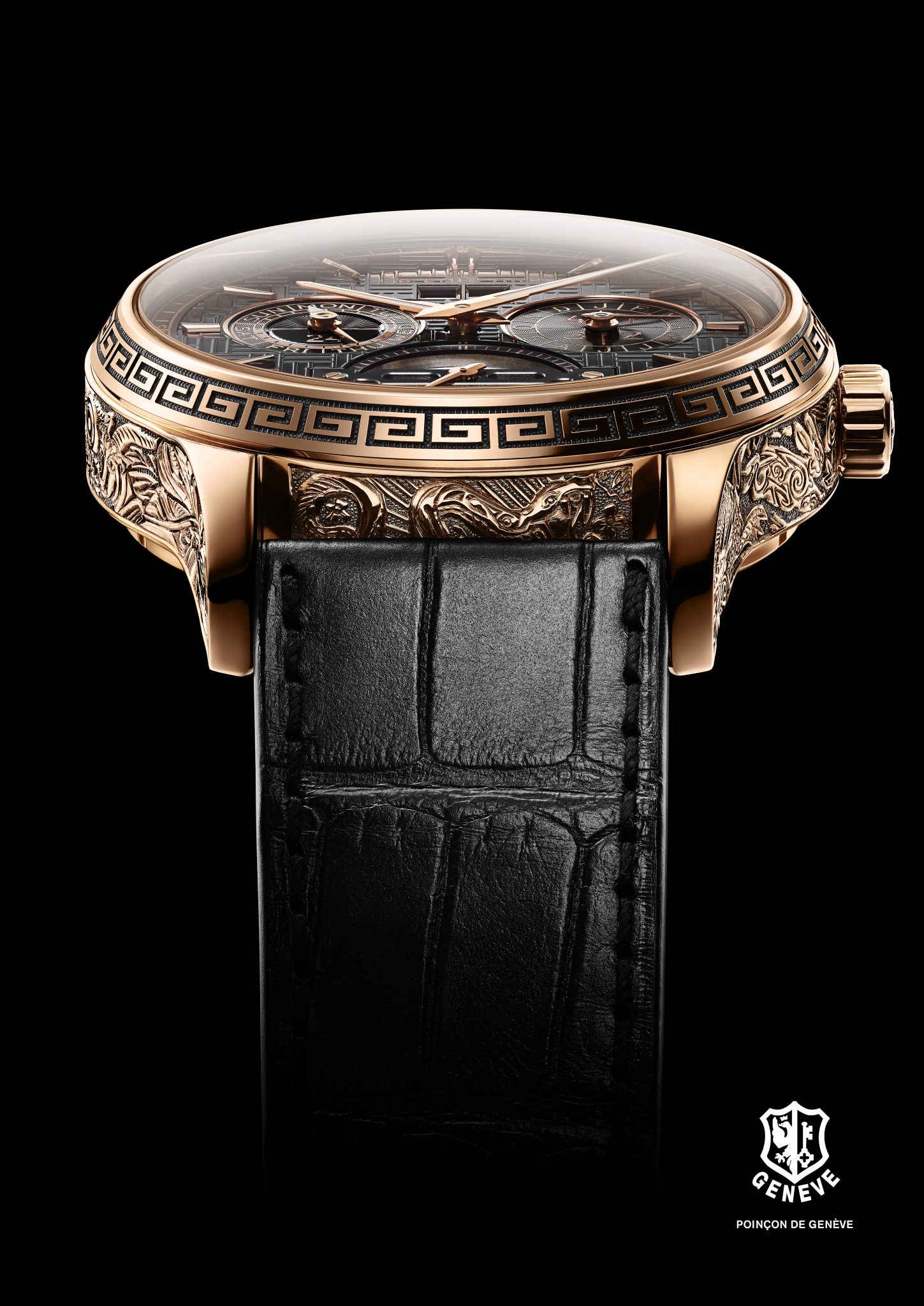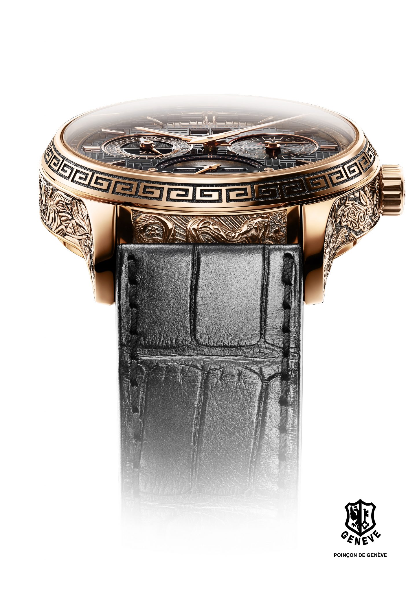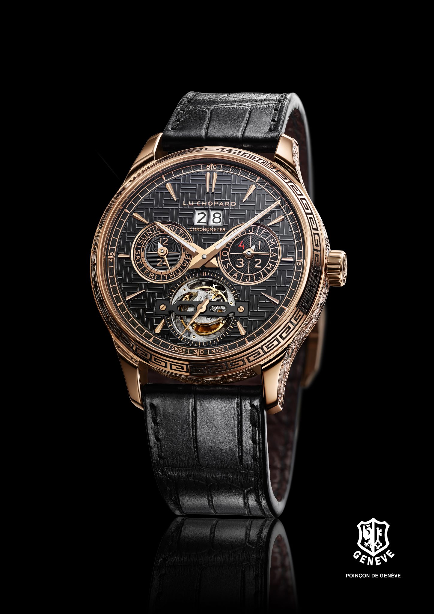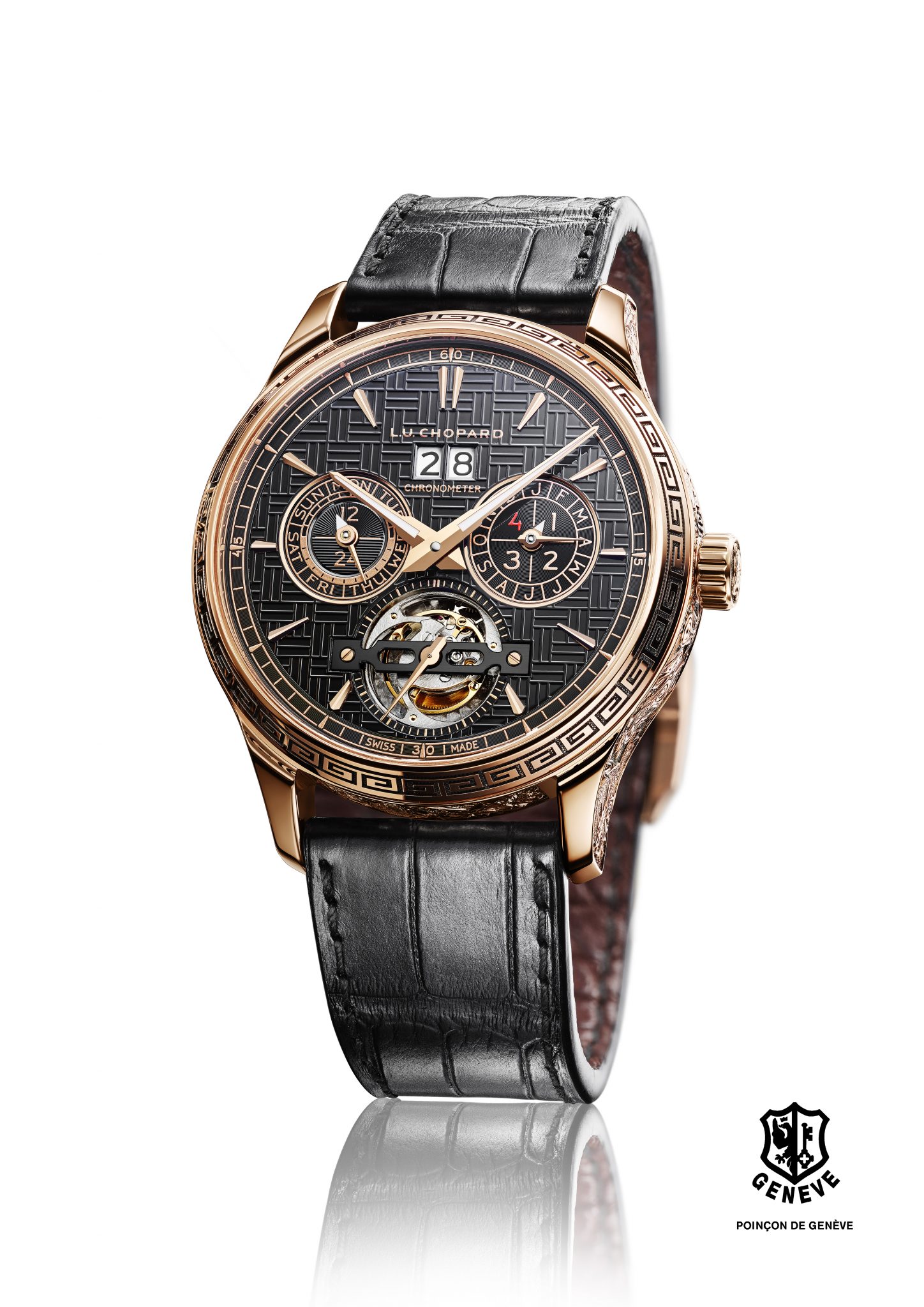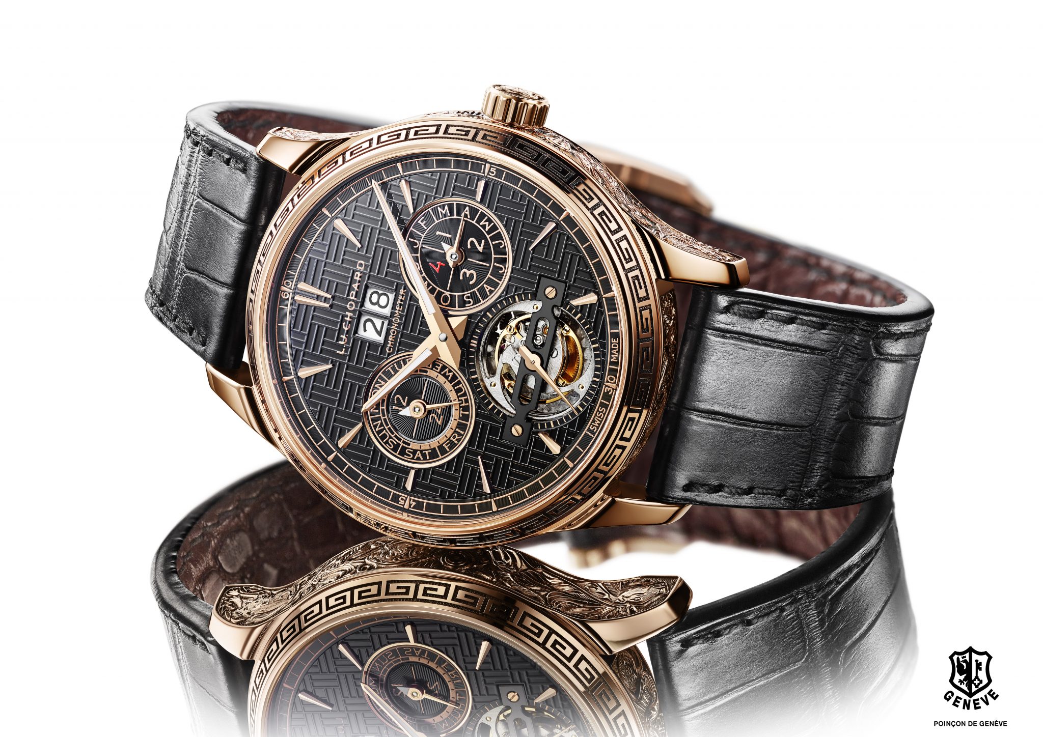 Les artisans de la Maison Chopard ont réalisé un boîtier en or rose gravé intégralement à la main et représentant les 12 signes du zodiaque. Véritable prouesse artistique, cette œuvre artisanale qui rend hommage à une culture millénaire, est réservée au plus avisé des collectionneurs.