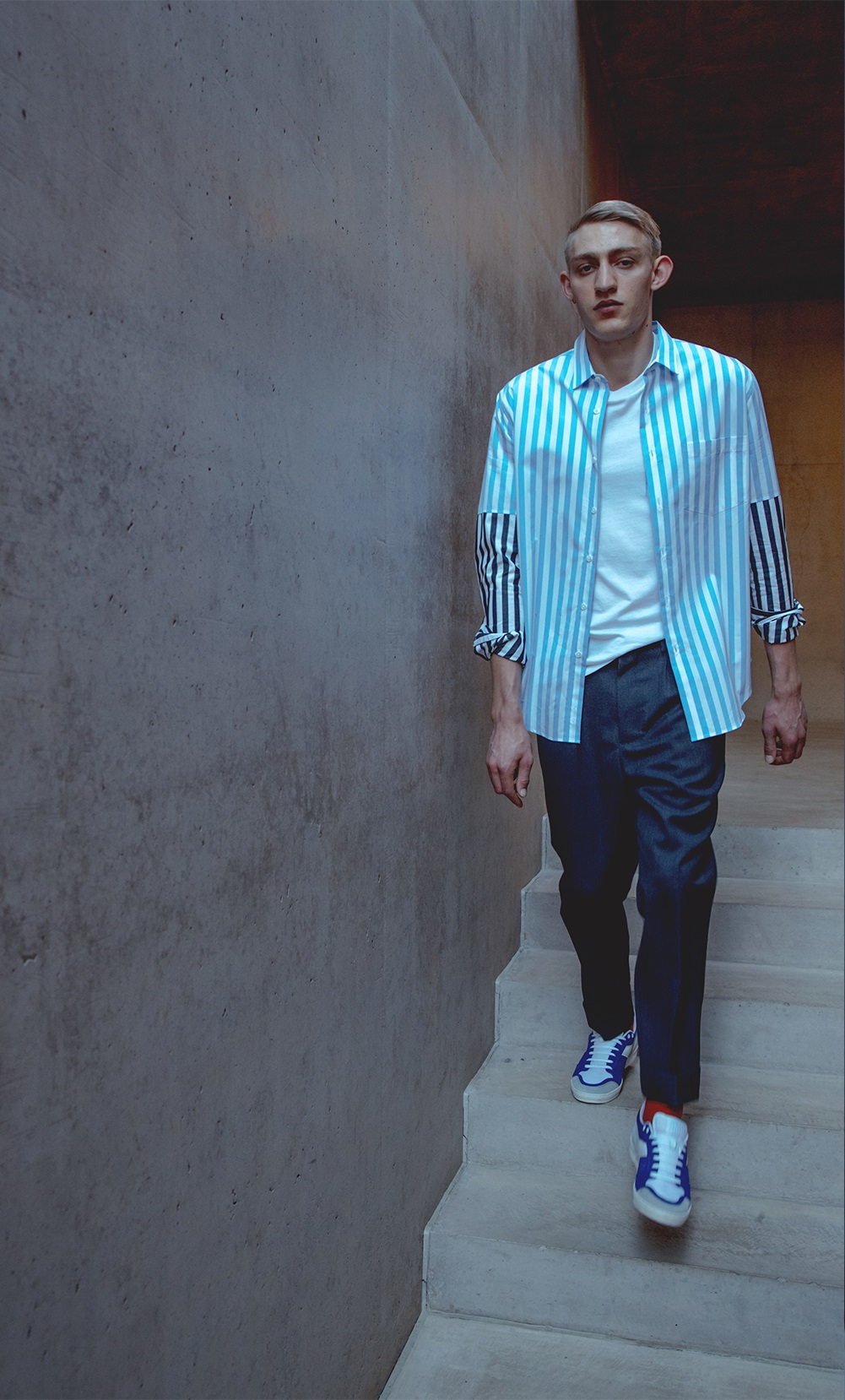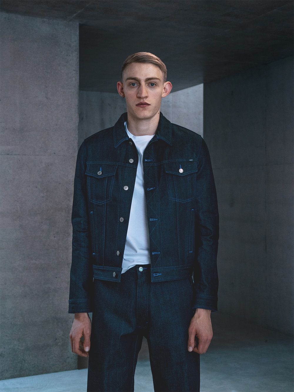 La collection est composée, entres autres, d’un manteau oversize bleu roi, d’un pull à col roulé en laine feutrée et d’une veste en denim indigo brut dont l’intérieur du col, les dessous du poignet et les surpiqûres sont contrastées en bleu roi.