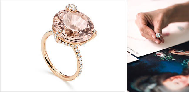 Le design sobre de la collection met parfaitement en valeur les gemmes aux couleurs tendres. Son signe distinctif : une griffe plus volumineuse que les autres, pavée de diamants, qui apporte une note espiègle et décontractée. La collection se compose de boucles d’oreilles, de colliers, de bagues et de bracelets en or rose, tous ornés de morganites, d’aigues-marines ou de béryls jaunes. D’excellente facture, ils affichent au dos le « B » emblématique de Bucherer Fine Jewellery. La pièce maîtresse de la collection Peekaboo est une somptueuse bague cocktail : une morganite rose de 12 carats trône en majesté sur un corps de bague circulaire, serti de diamants.