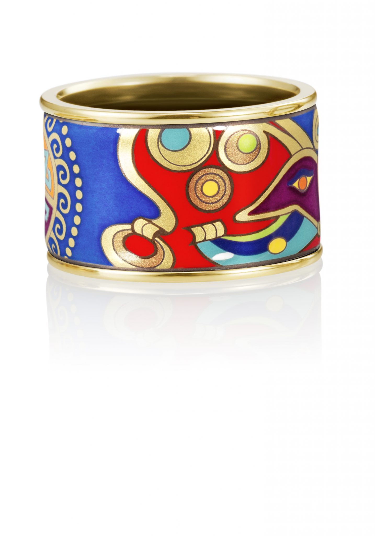 Ces éléments ont été travaillés dans un motif mystique en émail grand feu plein de couleurs chaudes telles que l’indigo, le rouge, le vert ou le jaune.