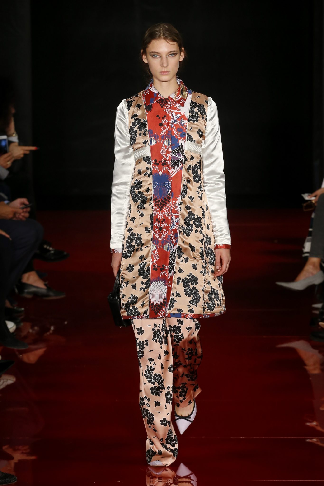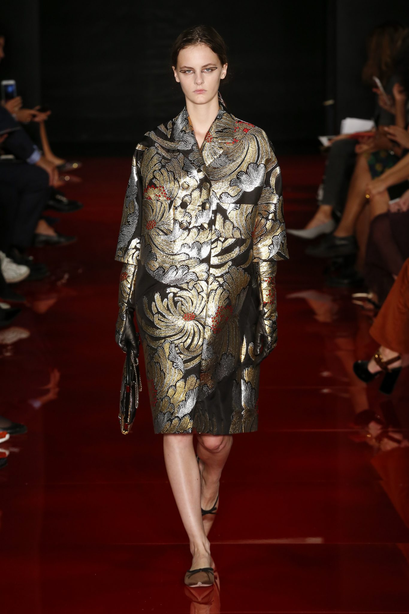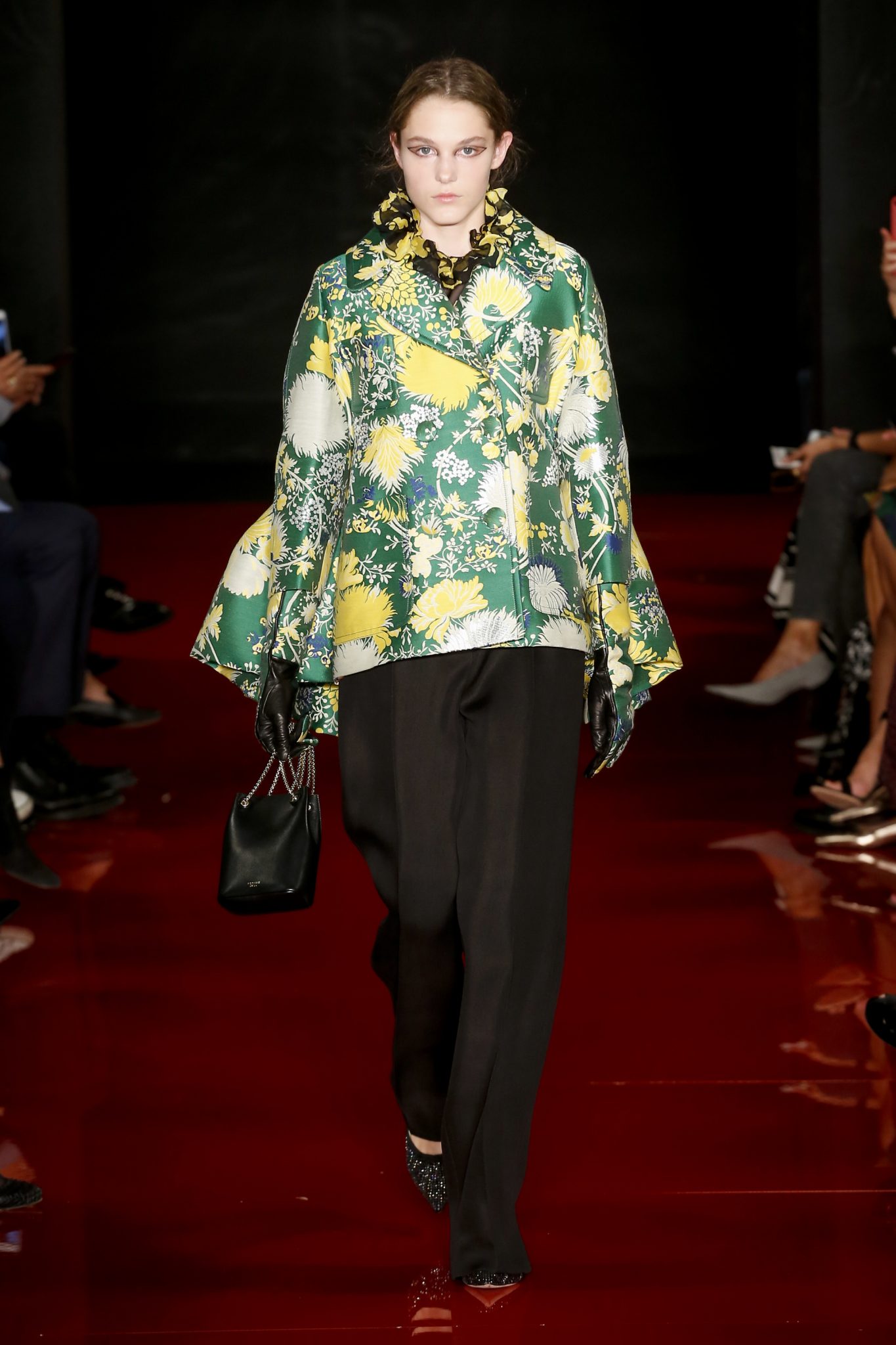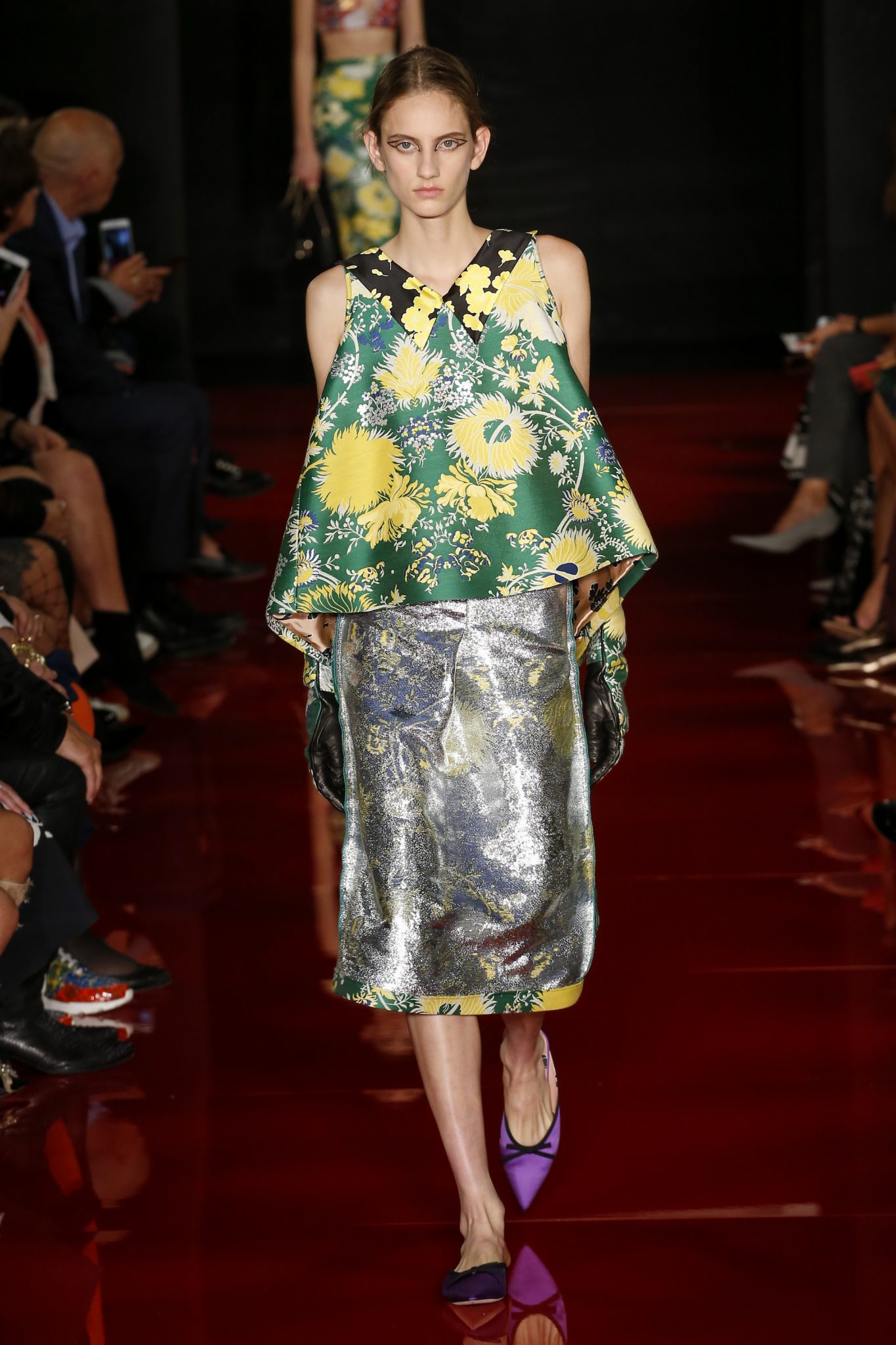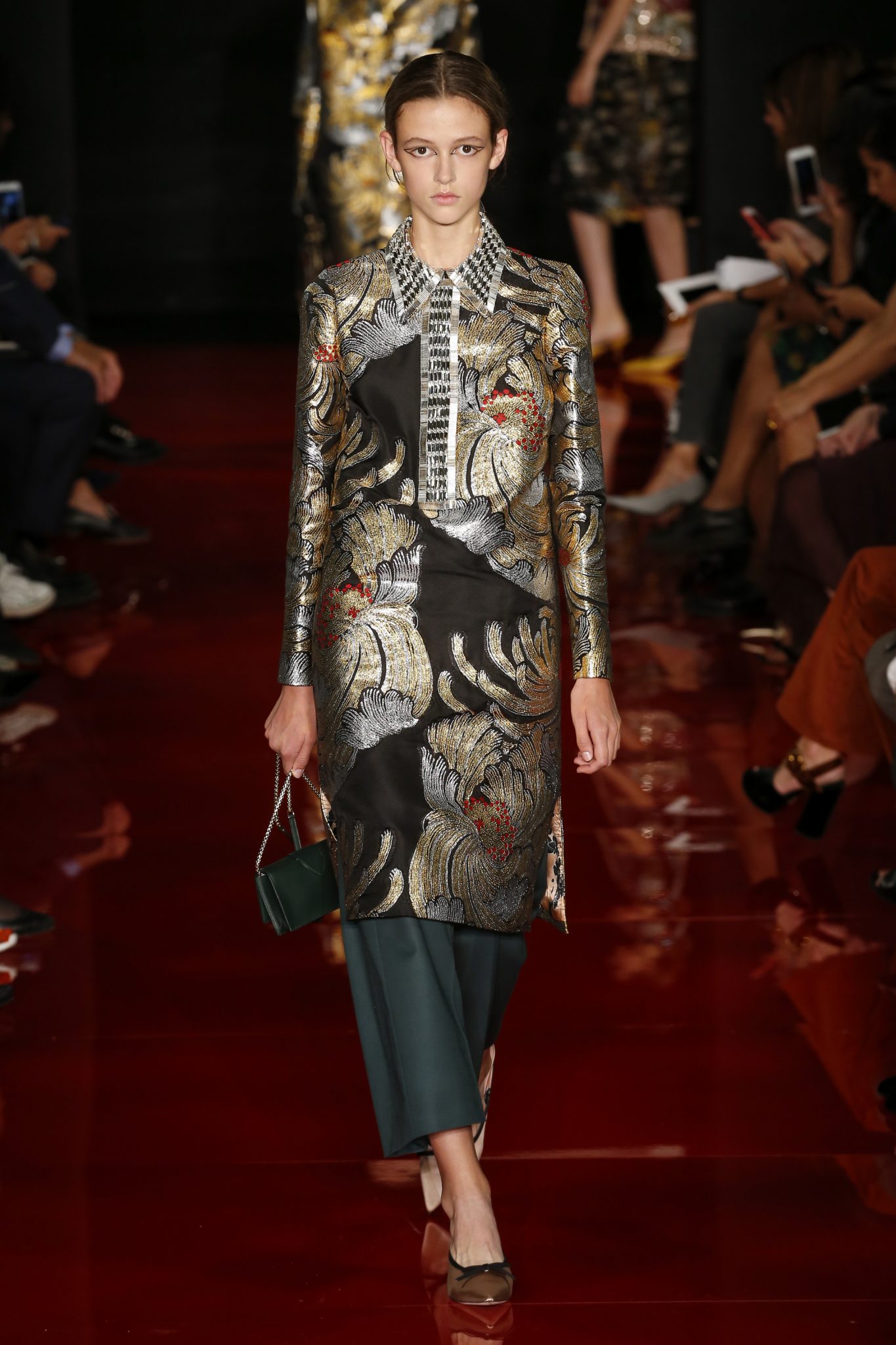 Des broderies ornent des imprimés. Les imprimés, eux, ornent des brocarts. Légèreté et pesanteur coexistent au sein d’un même look, une superposition de couleurs et de motifs, de volumes et de silhouettes. Emblématiques du style Rochas, les vêtements adoptent une coupe ample et se portent par-dessus des pantalons droits.