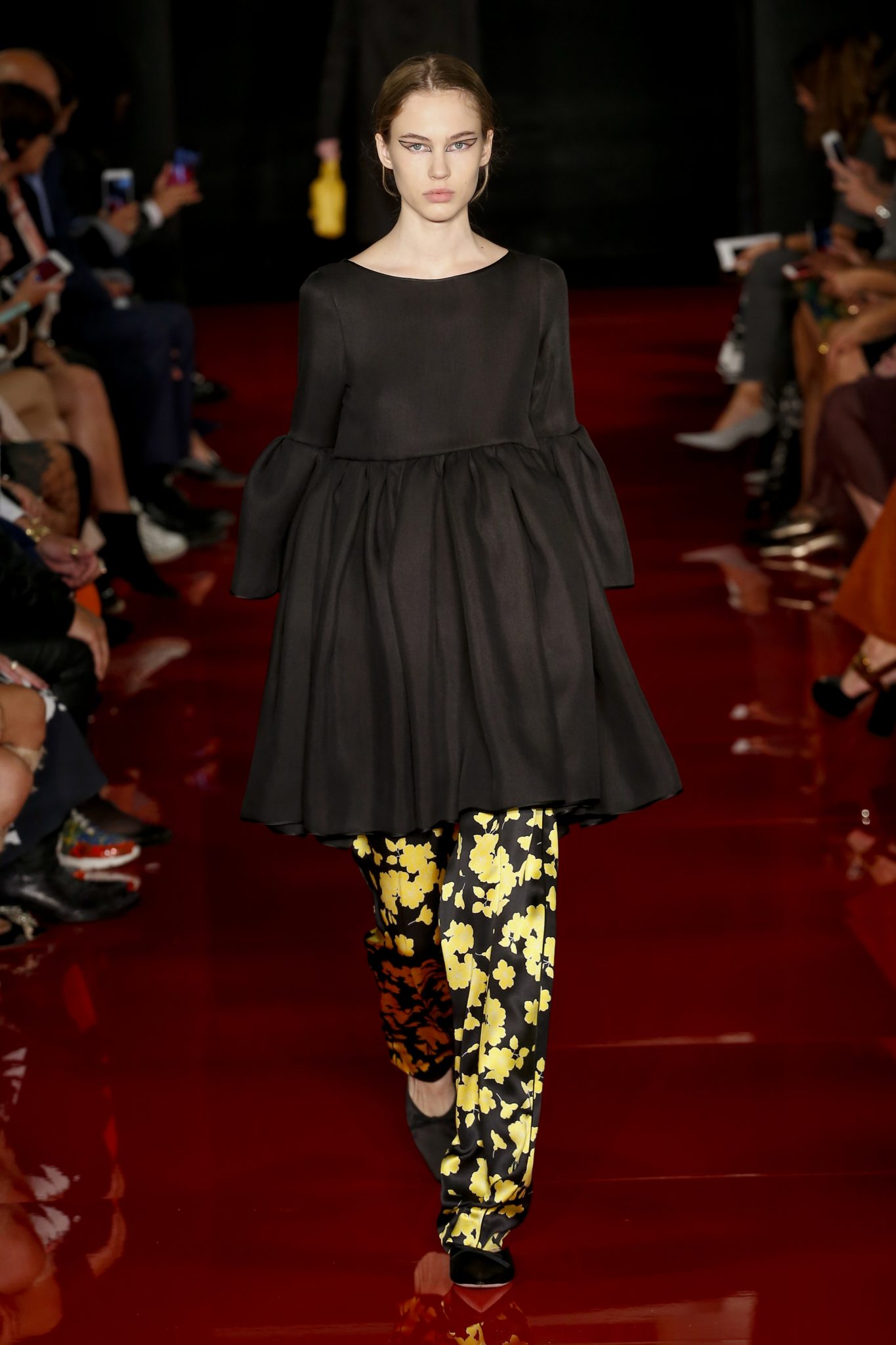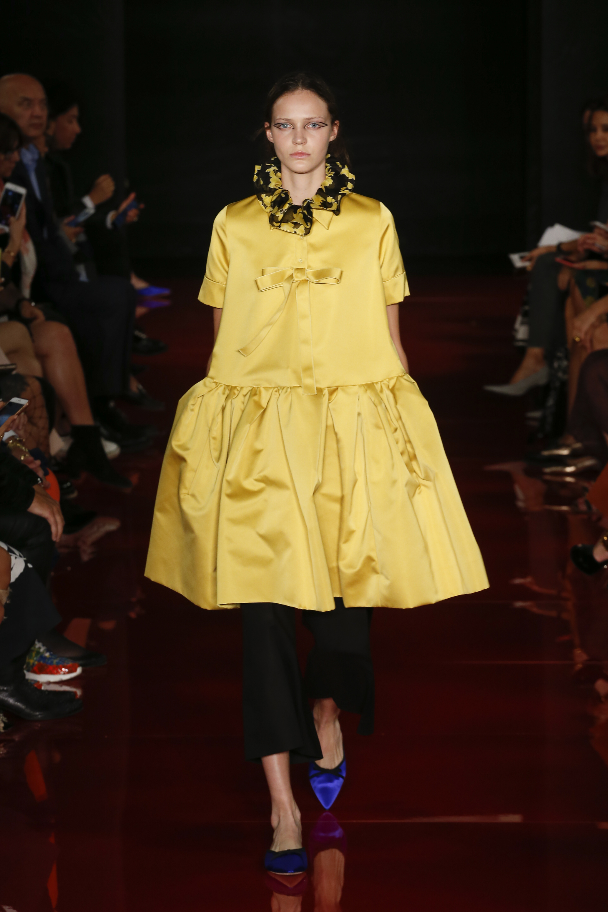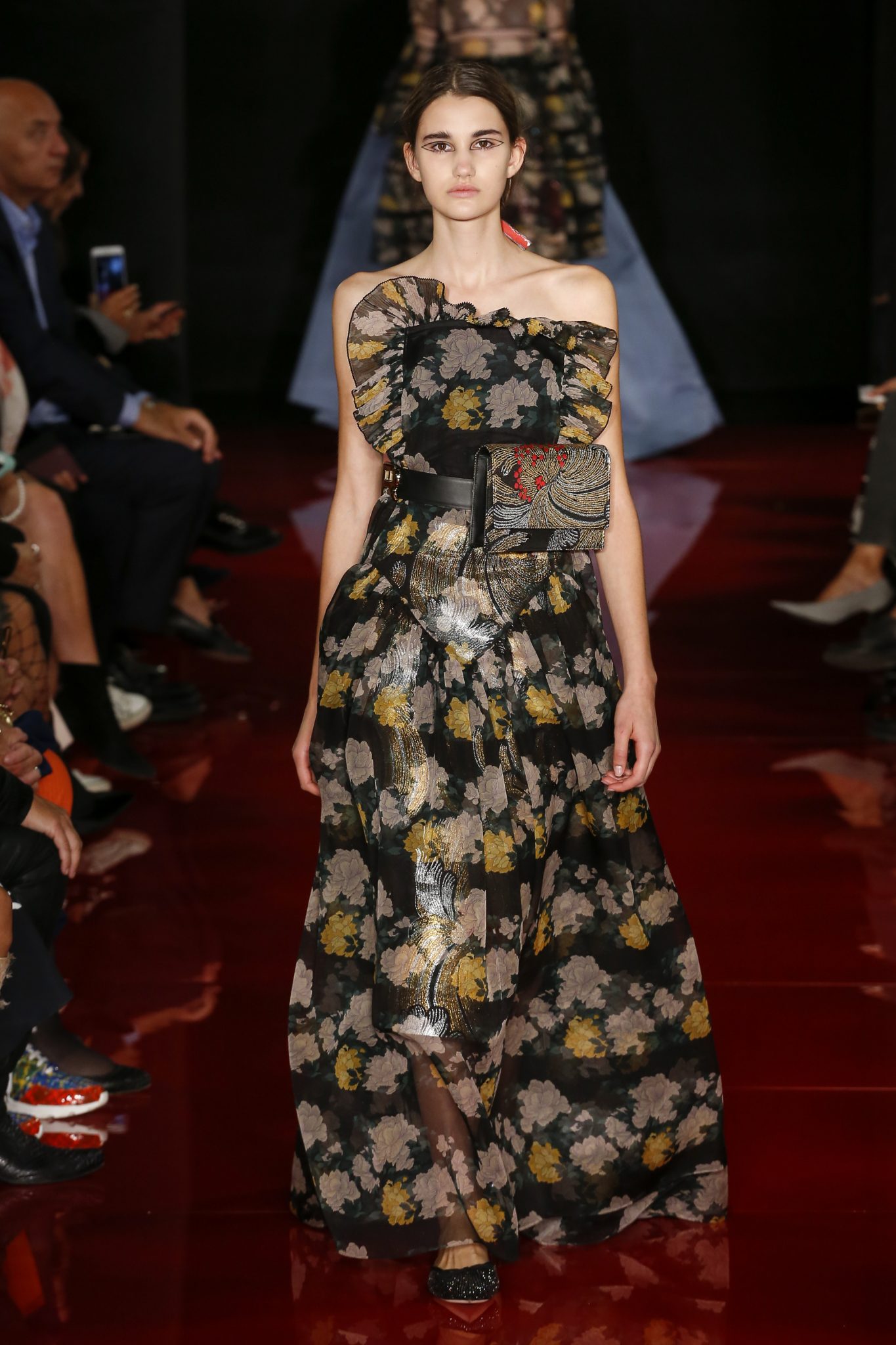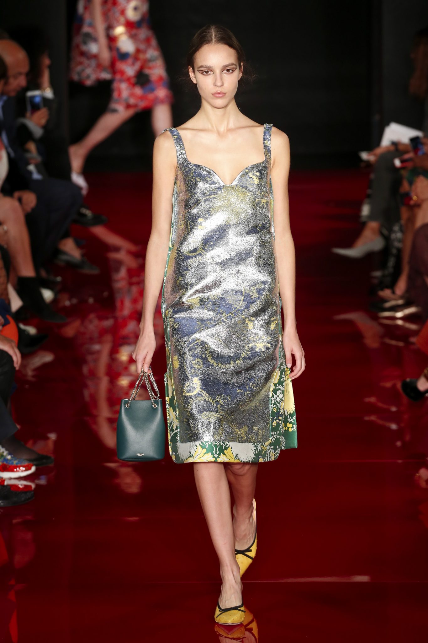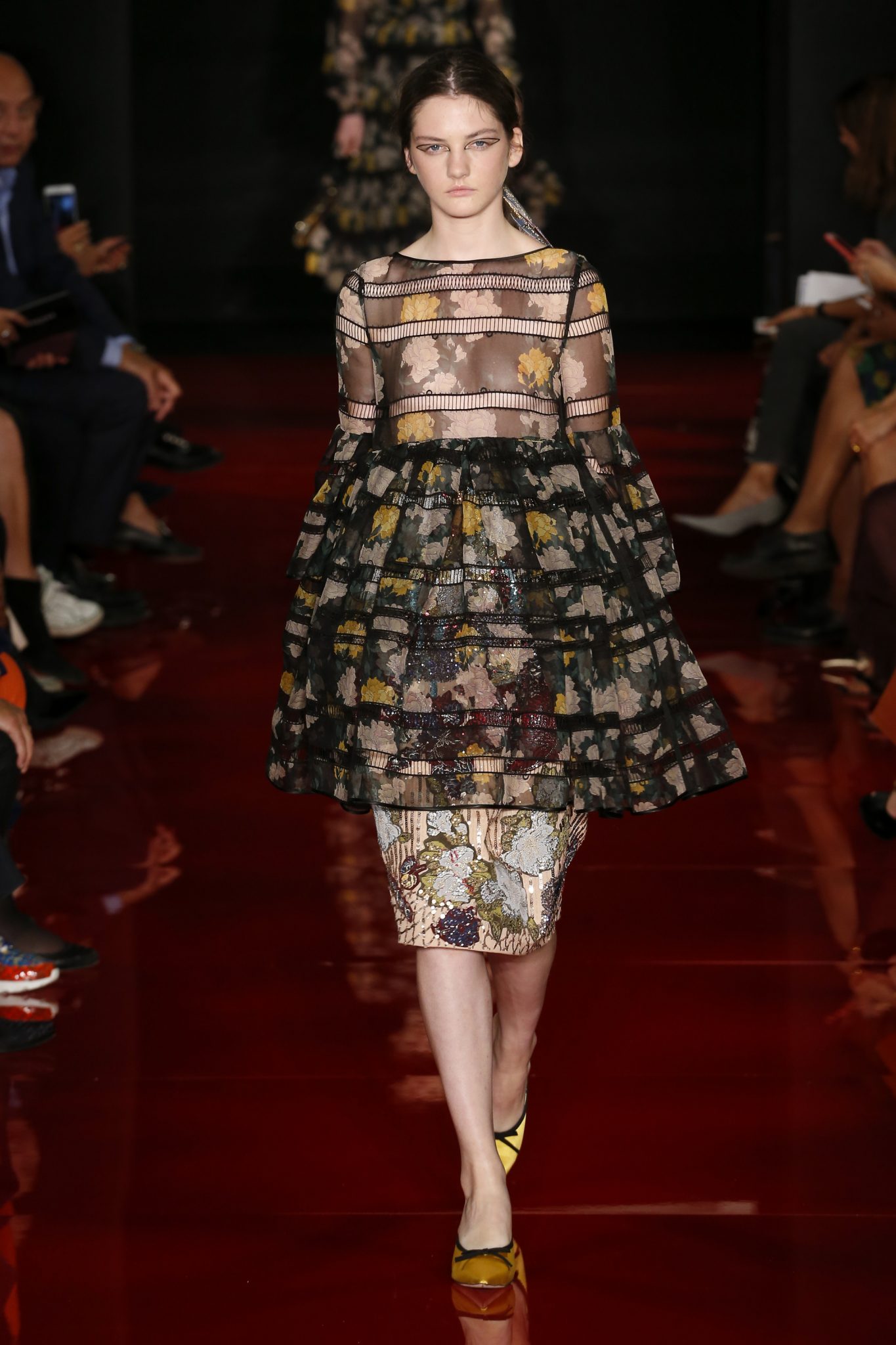 Des broderies ornent des imprimés. Les imprimés, eux, ornent des brocarts. Légèreté et pesanteur coexistent au sein d’un même look, une superposition de couleurs et de motifs, de volumes et de silhouettes. Emblématiques du style Rochas, les vêtements adoptent une coupe ample et se portent par-dessus des pantalons droits.