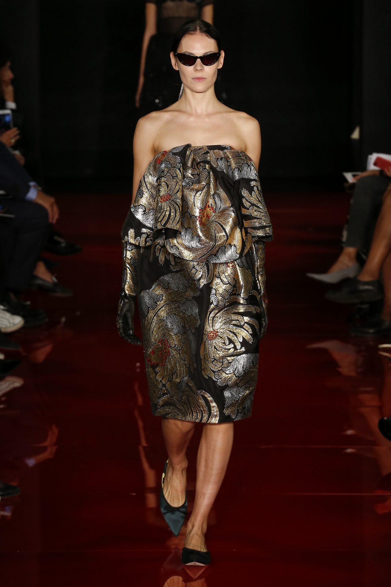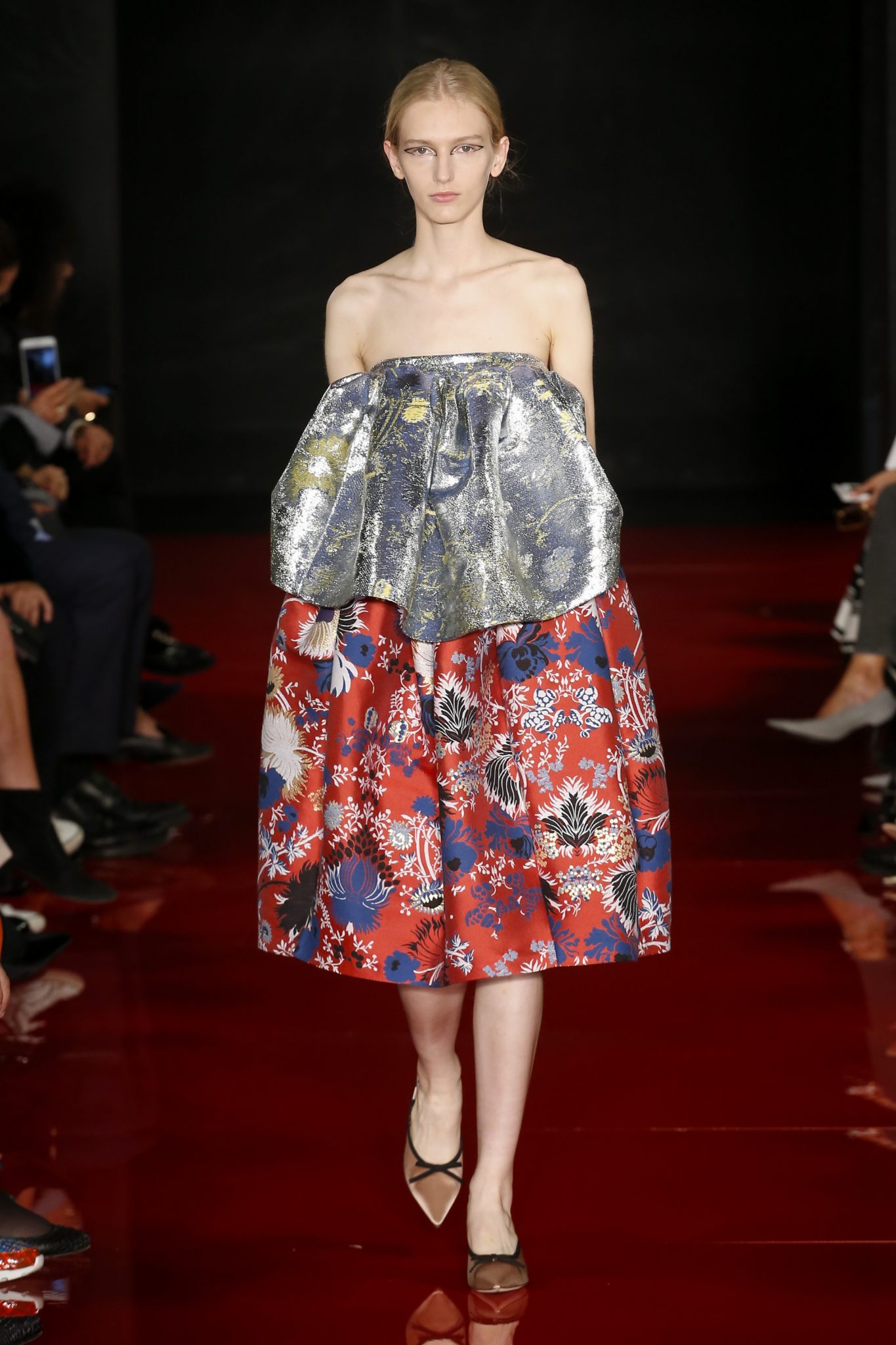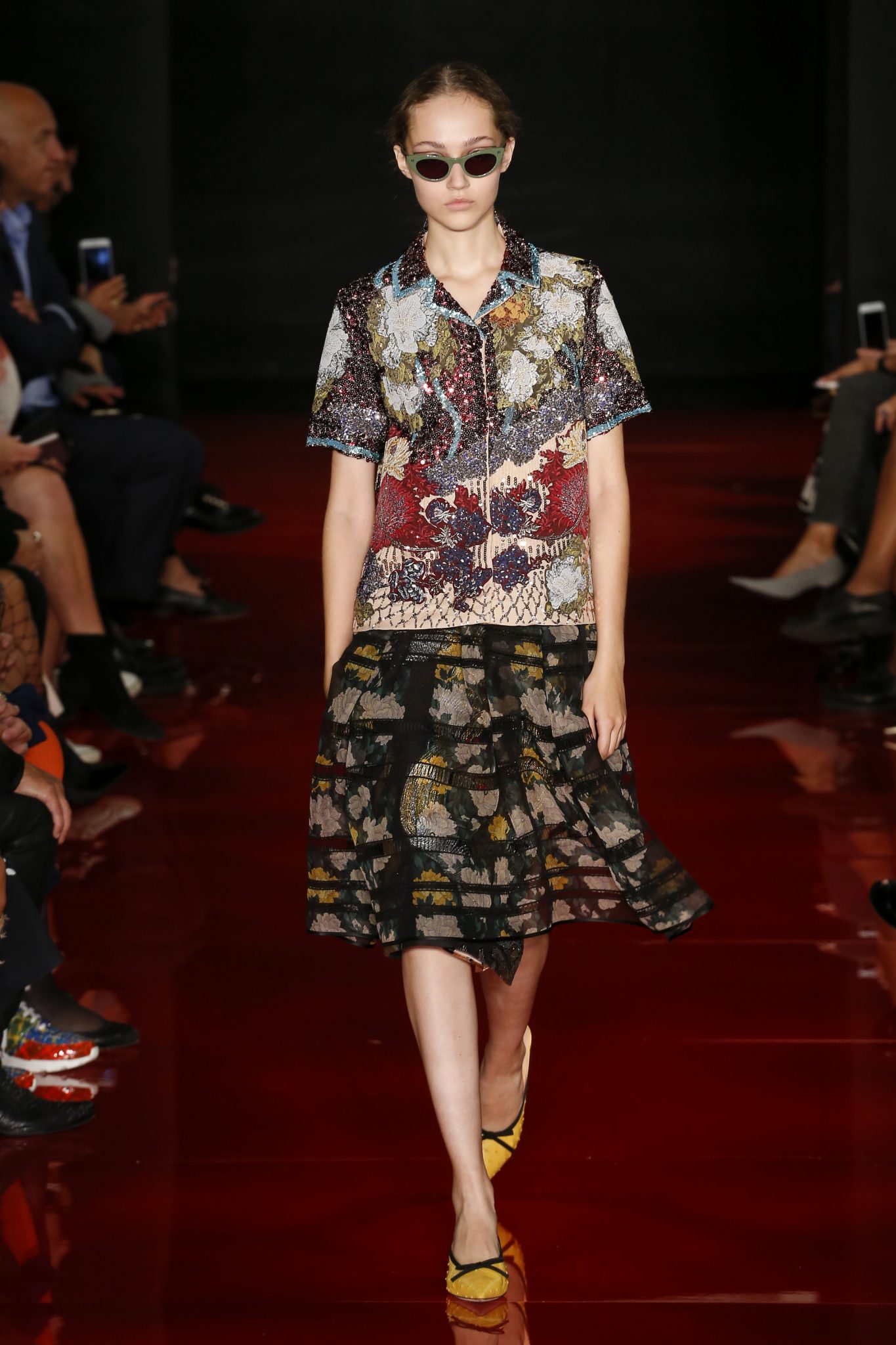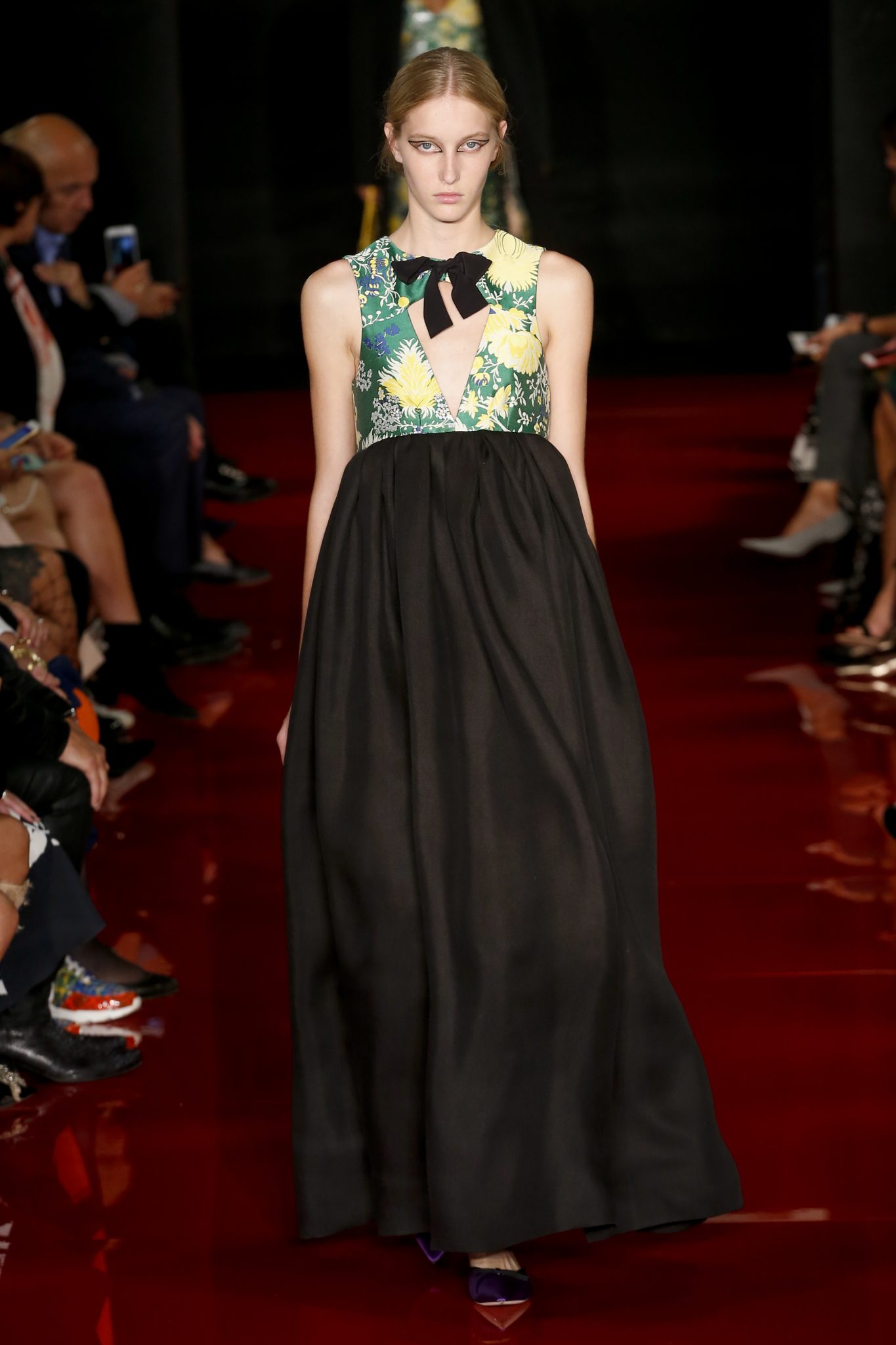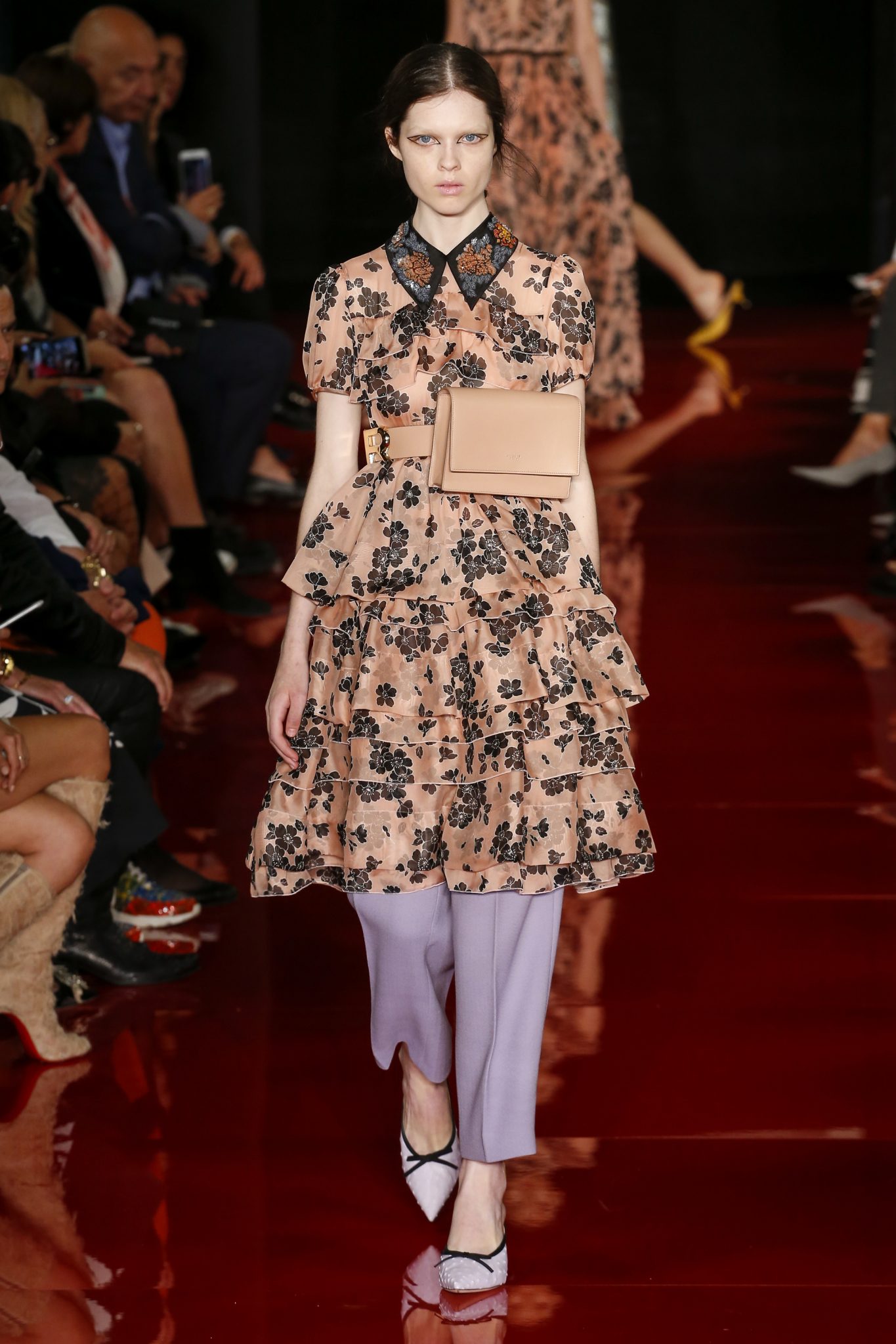 Des broderies ornent des imprimés. Les imprimés, eux, ornent des brocarts. Légèreté et pesanteur coexistent au sein d’un même look, une superposition de couleurs et de motifs, de volumes et de silhouettes. Emblématiques du style Rochas, les vêtements adoptent une coupe ample et se portent par-dessus des pantalons droits.