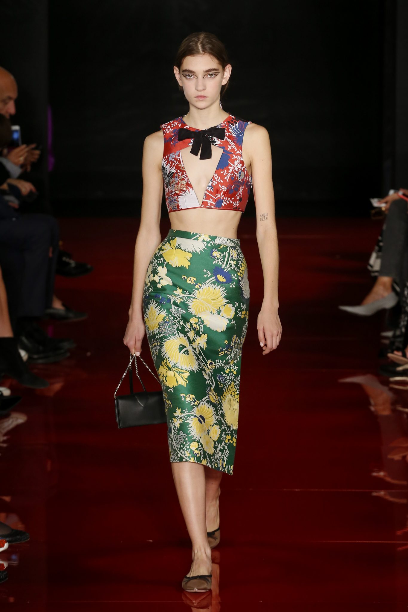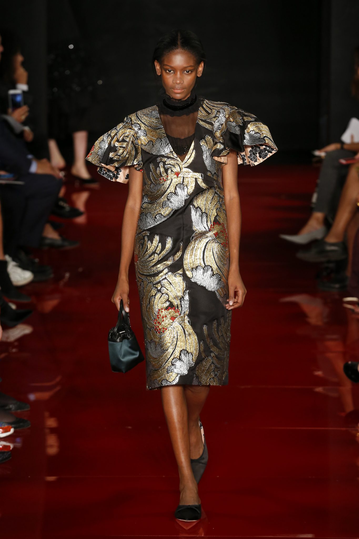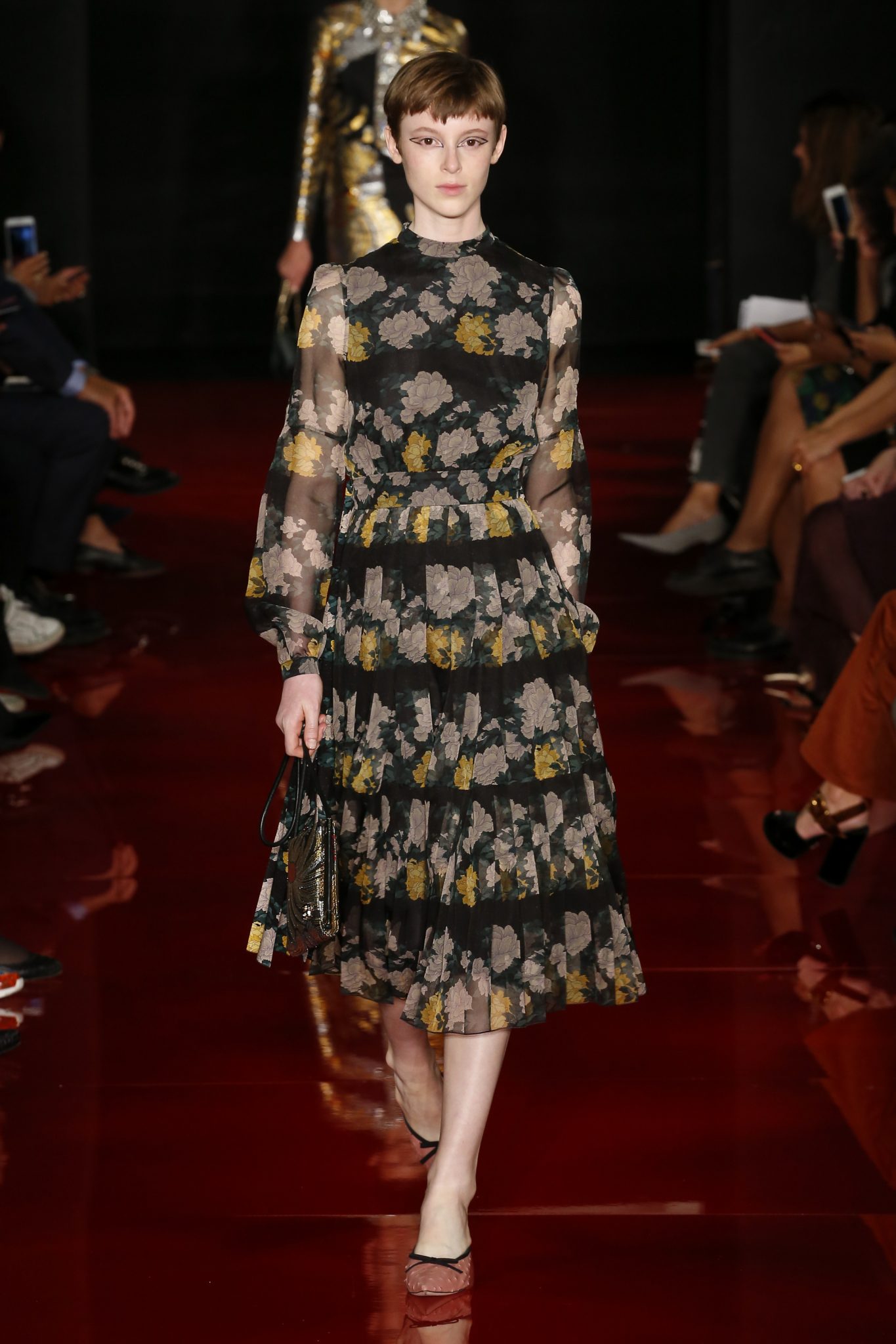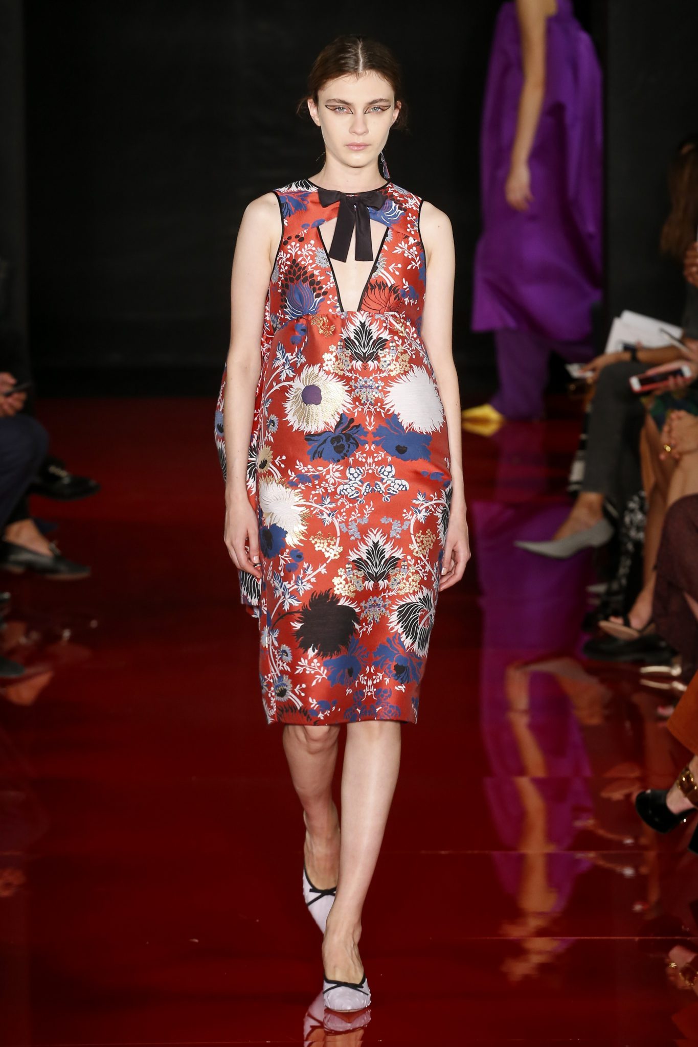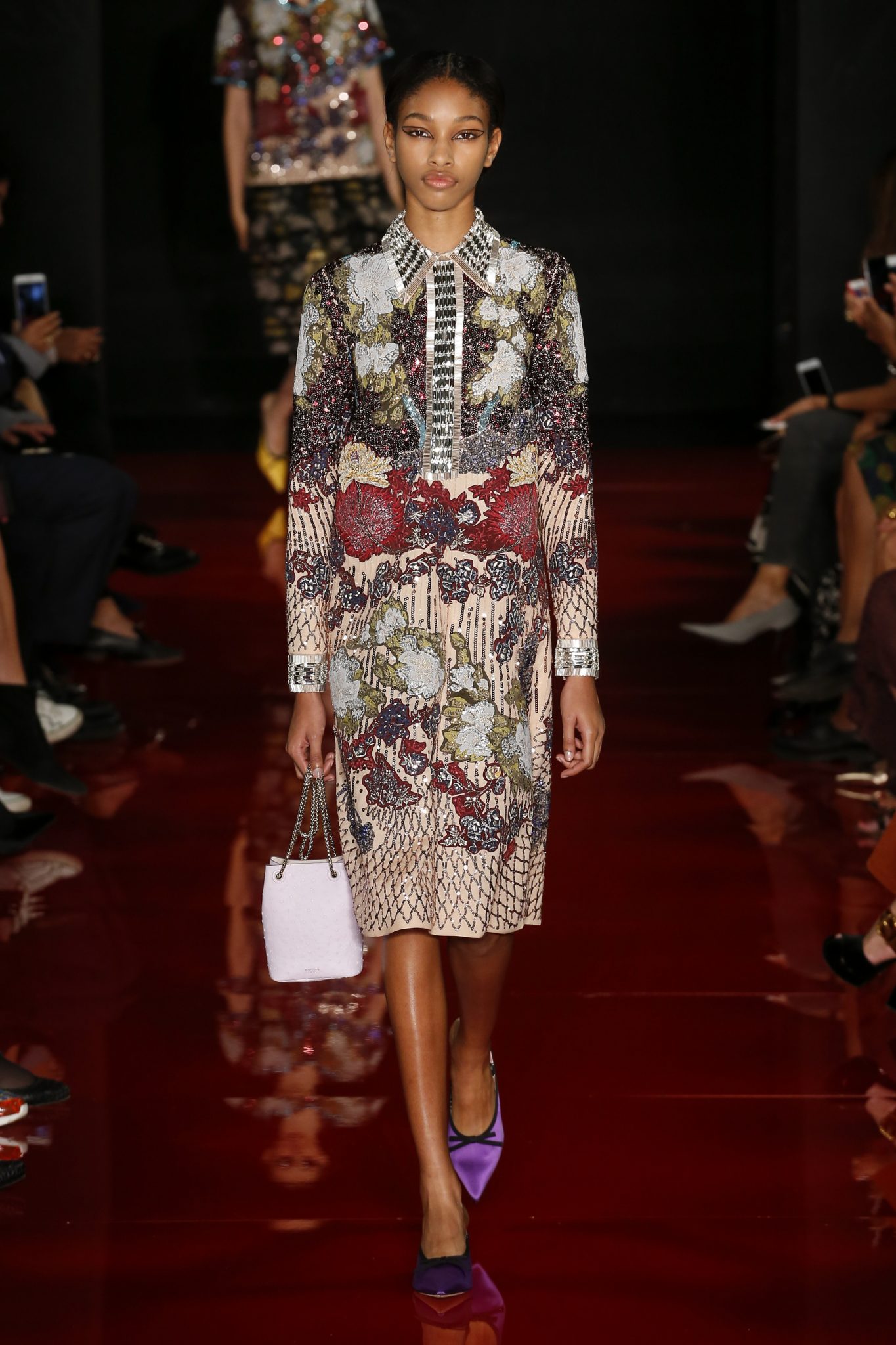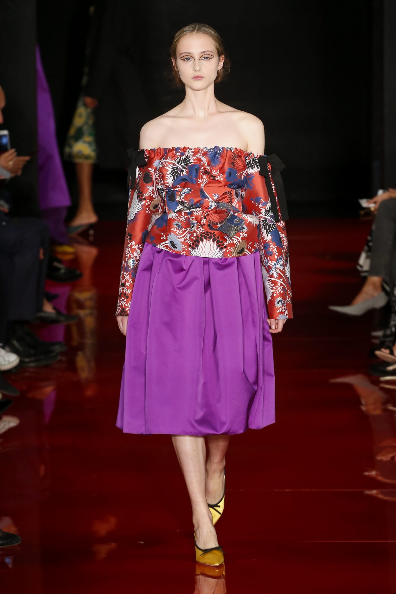 Des broderies ornent des imprimés. Les imprimés, eux, ornent des brocarts. Légèreté et pesanteur coexistent au sein d’un même look, une superposition de couleurs et de motifs, de volumes et de silhouettes. Emblématiques du style Rochas, les vêtements adoptent une coupe ample et se portent par-dessus des pantalons droits.