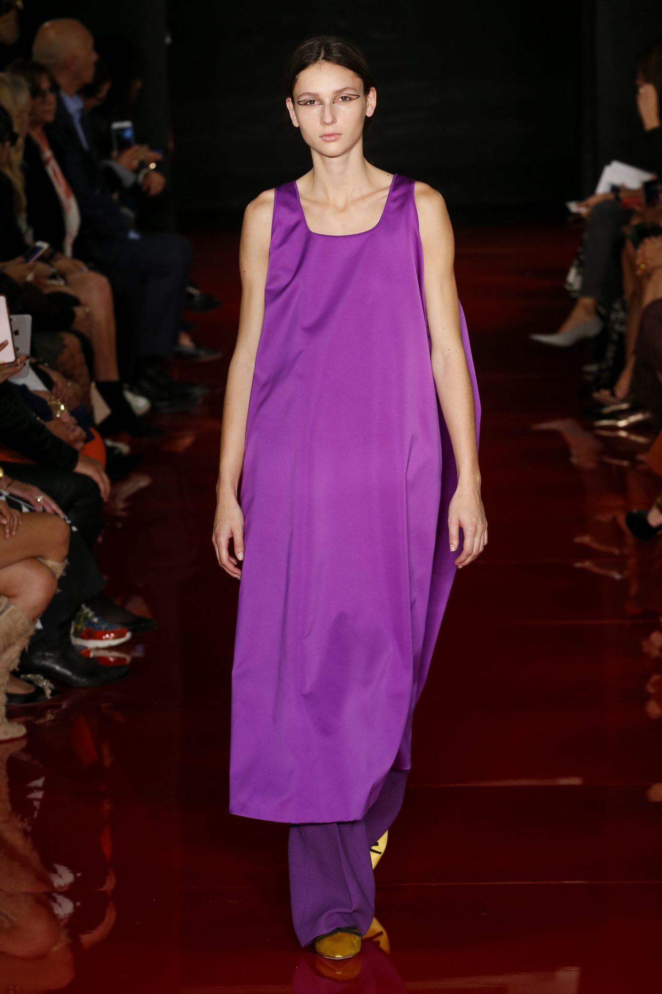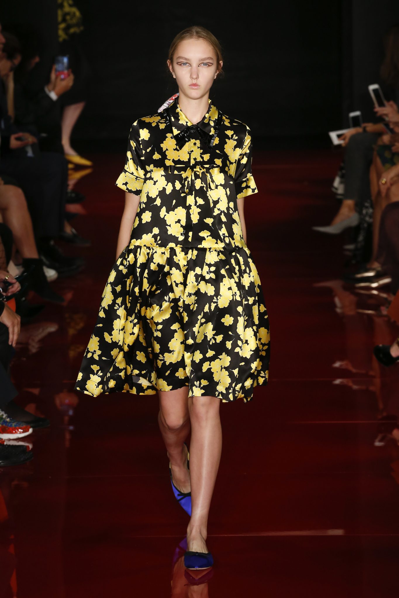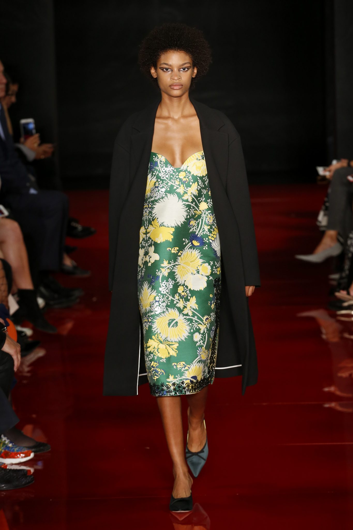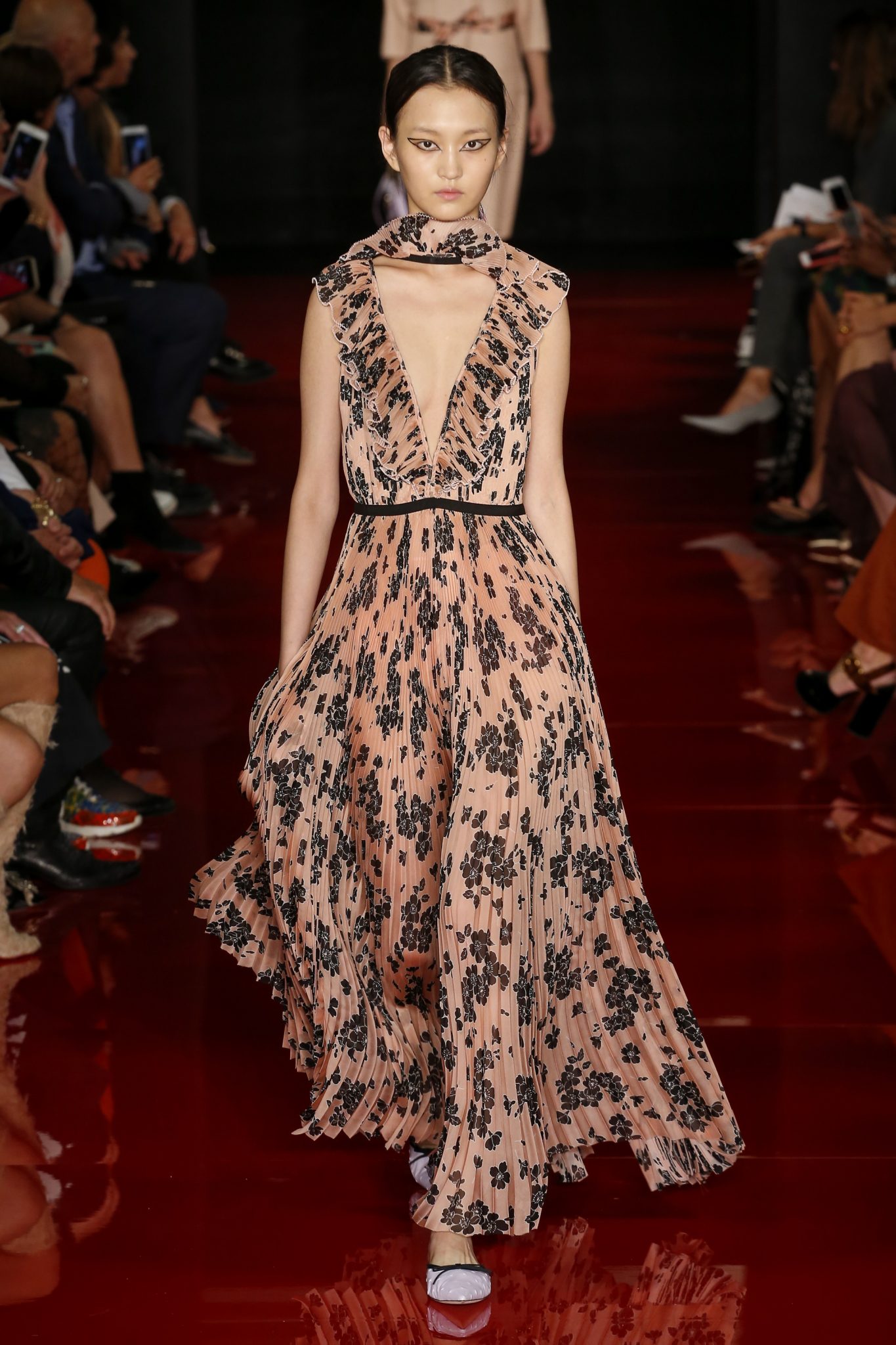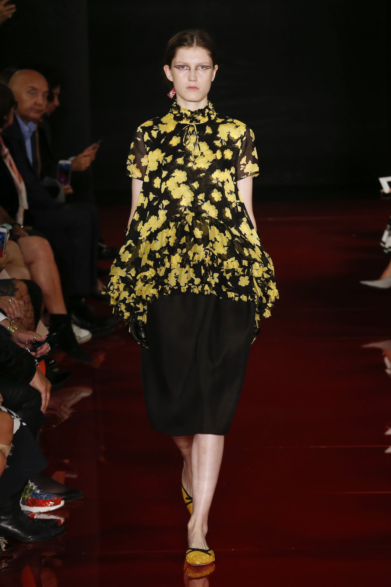 Des broderies ornent des imprimés. Les imprimés, eux, ornent des brocarts. Légèreté et pesanteur coexistent au sein d’un même look, une superposition de couleurs et de motifs, de volumes et de silhouettes. Emblématiques du style Rochas, les vêtements adoptent une coupe ample et se portent par-dessus des pantalons droits.
