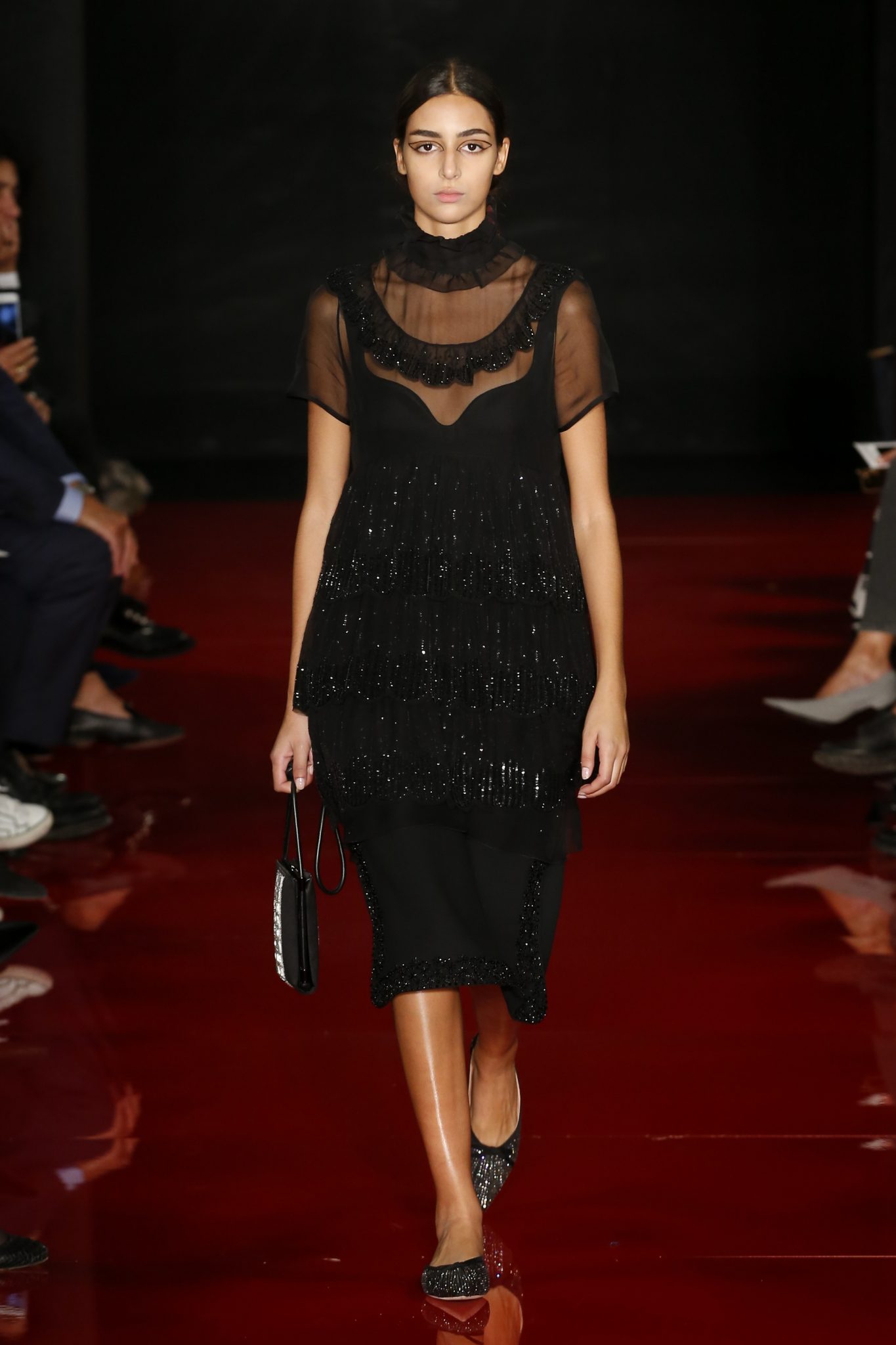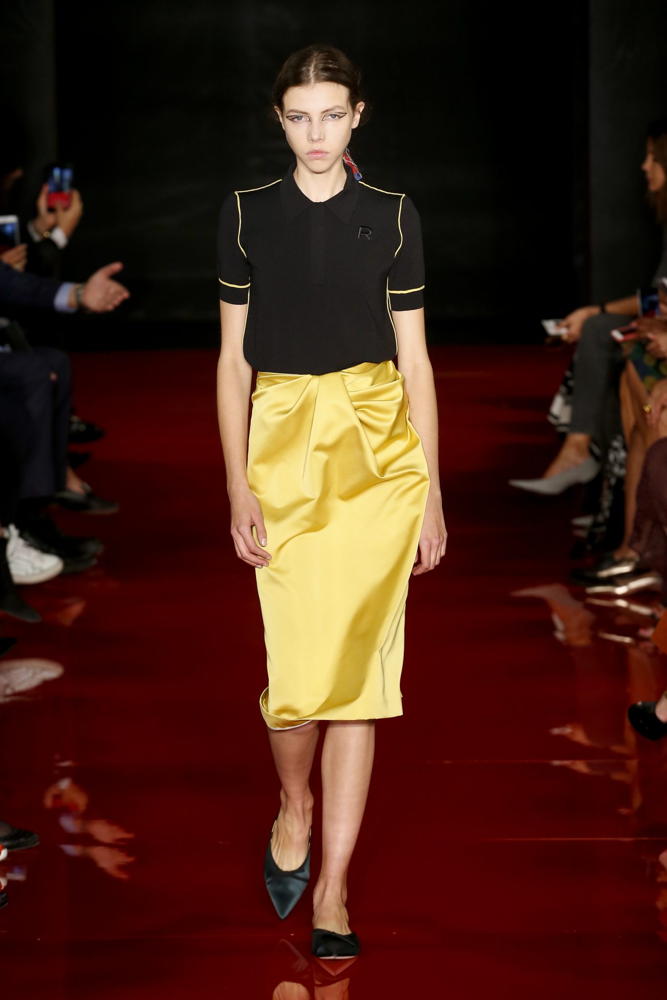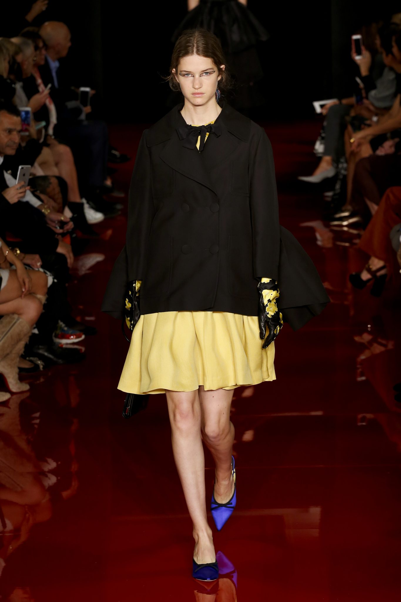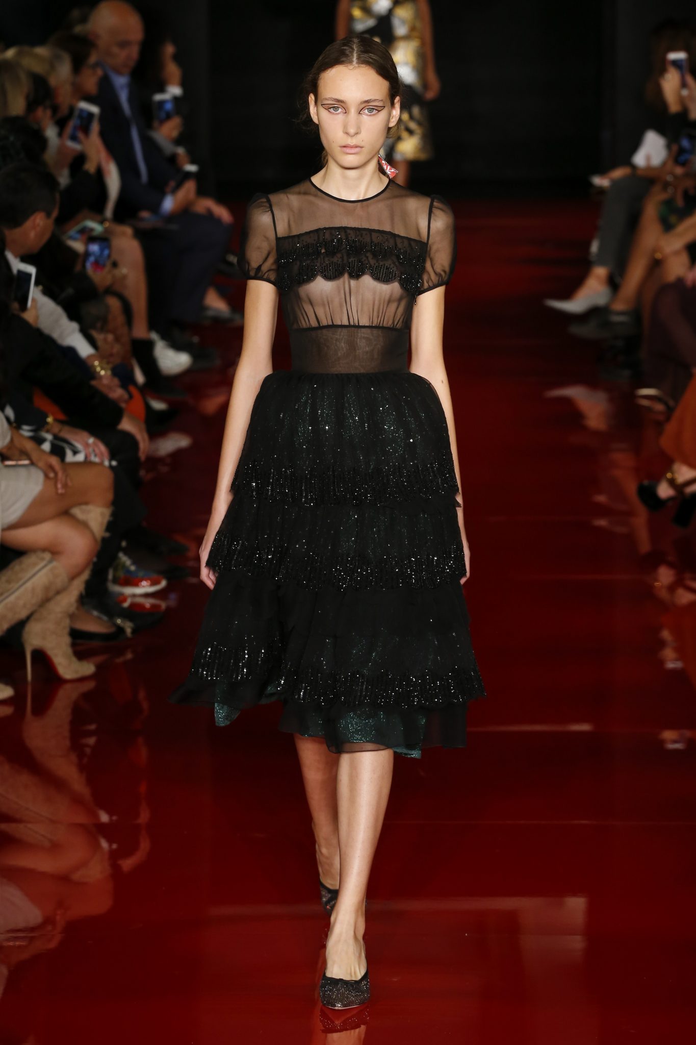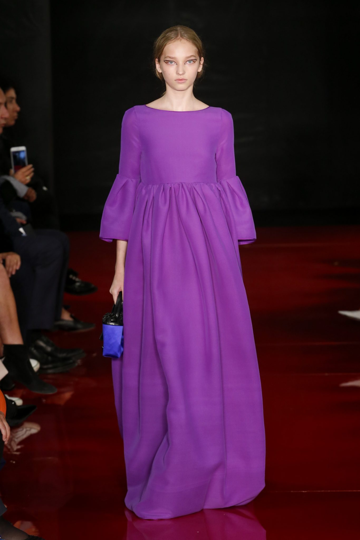 Des broderies ornent des imprimés. Les imprimés, eux, ornent des brocarts. Légèreté et pesanteur coexistent au sein d’un même look, une superposition de couleurs et de motifs, de volumes et de silhouettes. Emblématiques du style Rochas, les vêtements adoptent une coupe ample et se portent par-dessus des pantalons droits.
