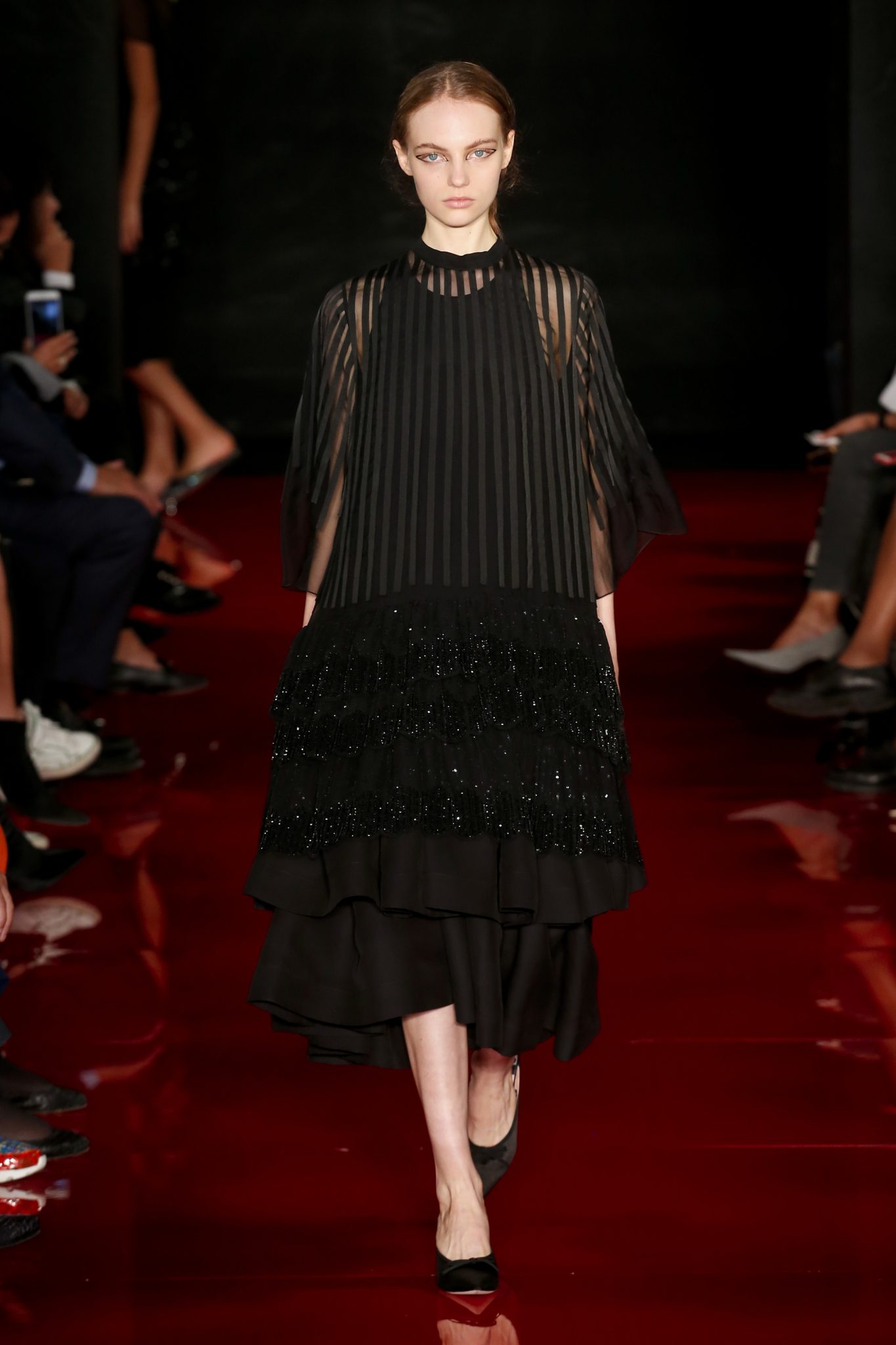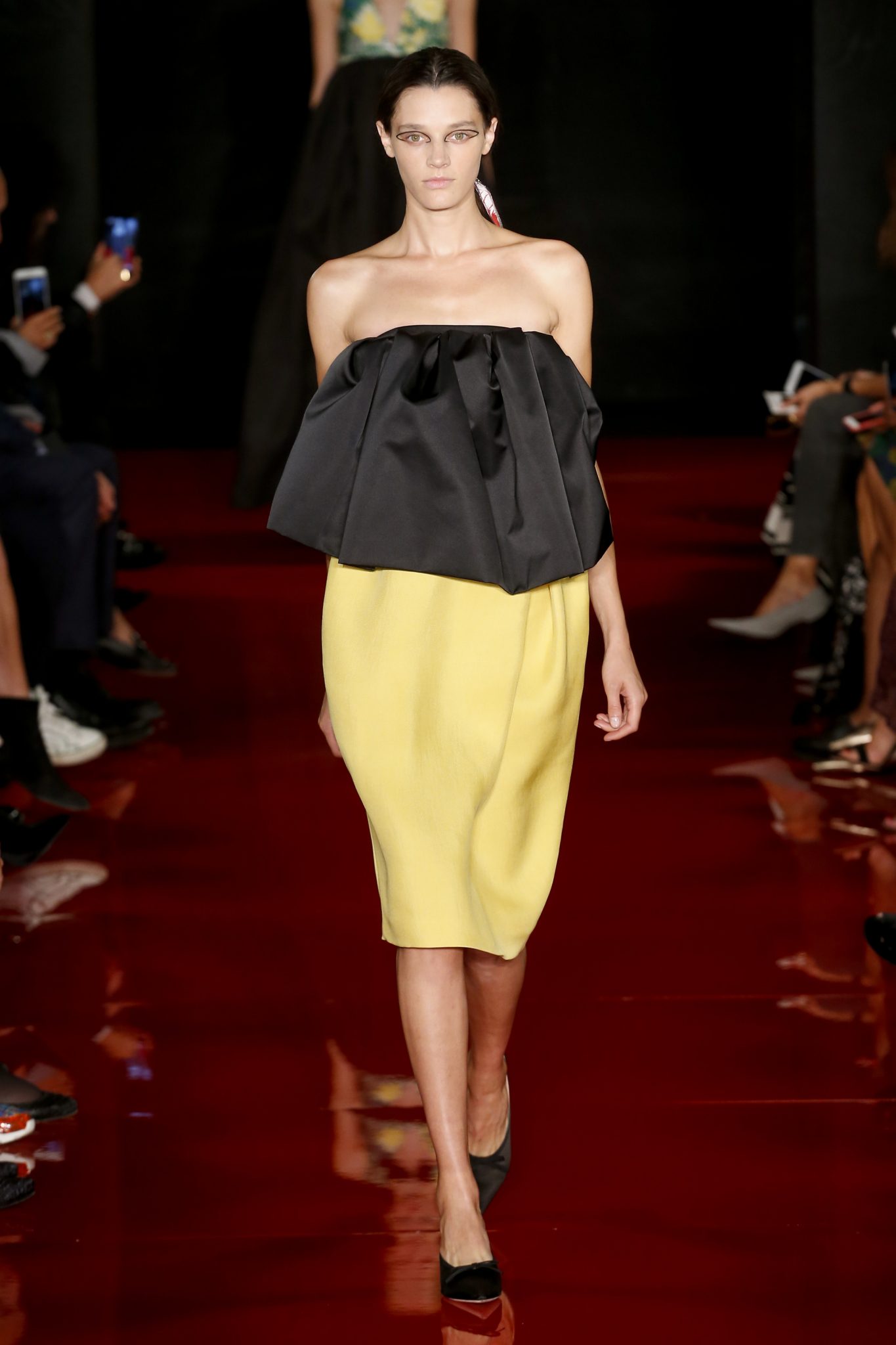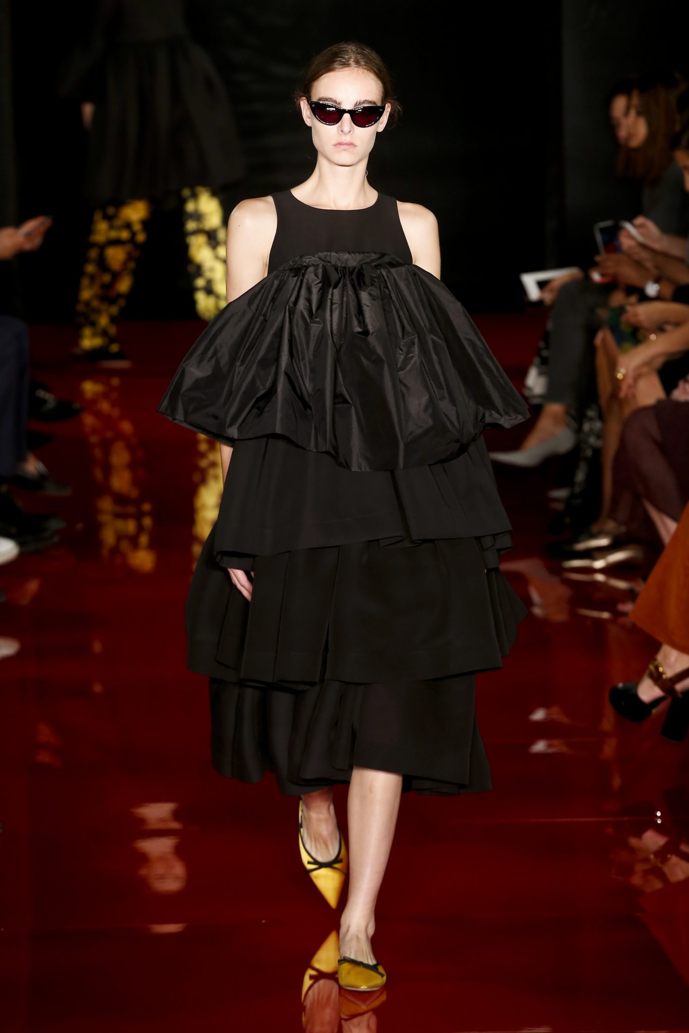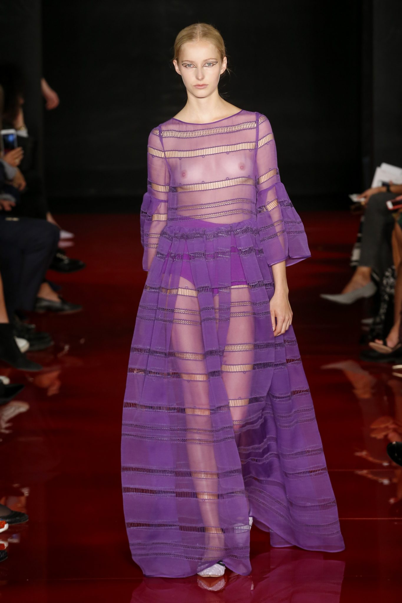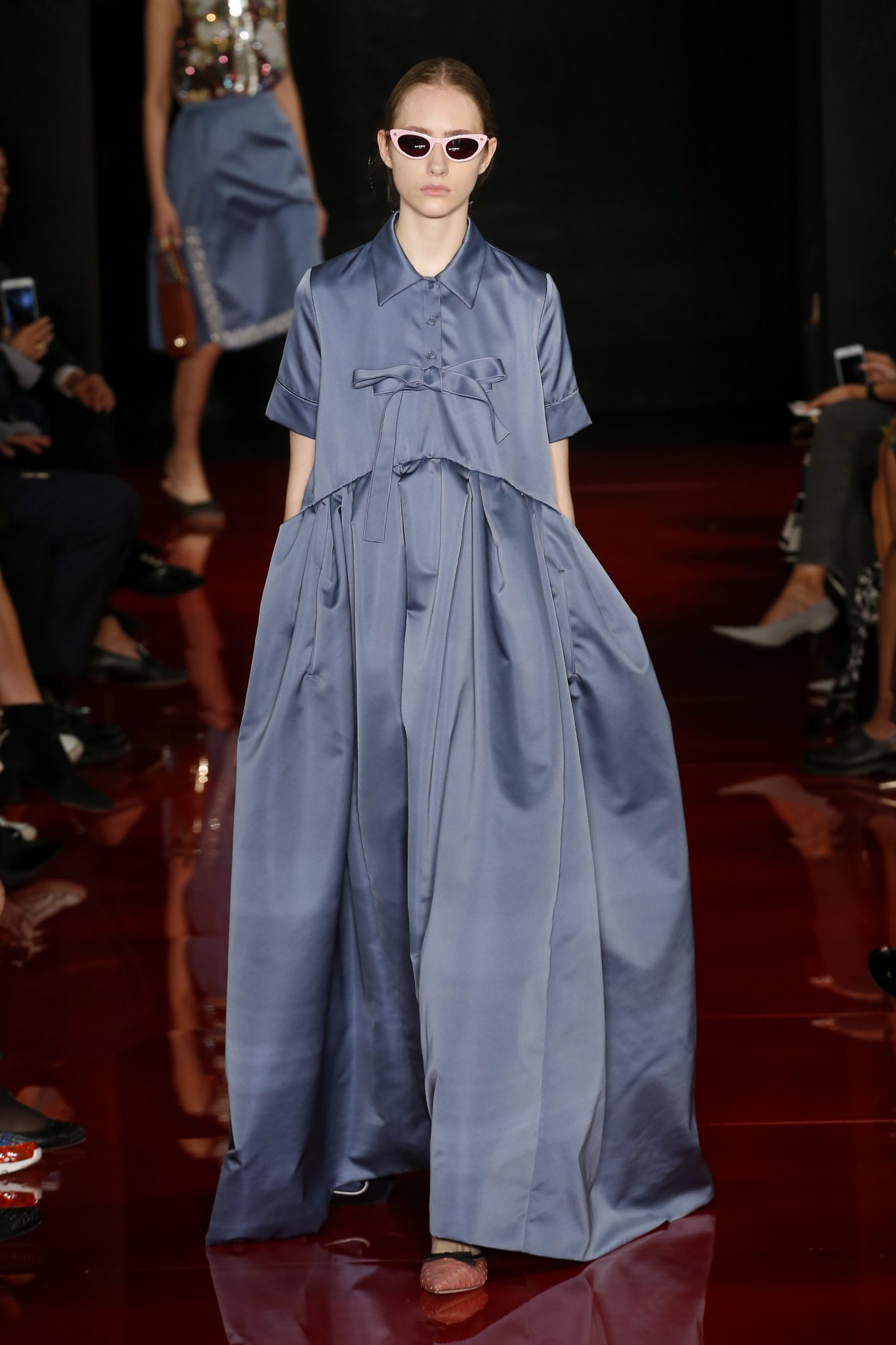 Souvenirs de boudoir et de couture française : mousseline de soie, cigaline, Georgette définissent la structure du vêtement, souvenirs glorieux d’une grandeur passée. En apparence, l’ensemble est contemporain et graphique. Les finitions, elles, sont classiques et raffinées.
