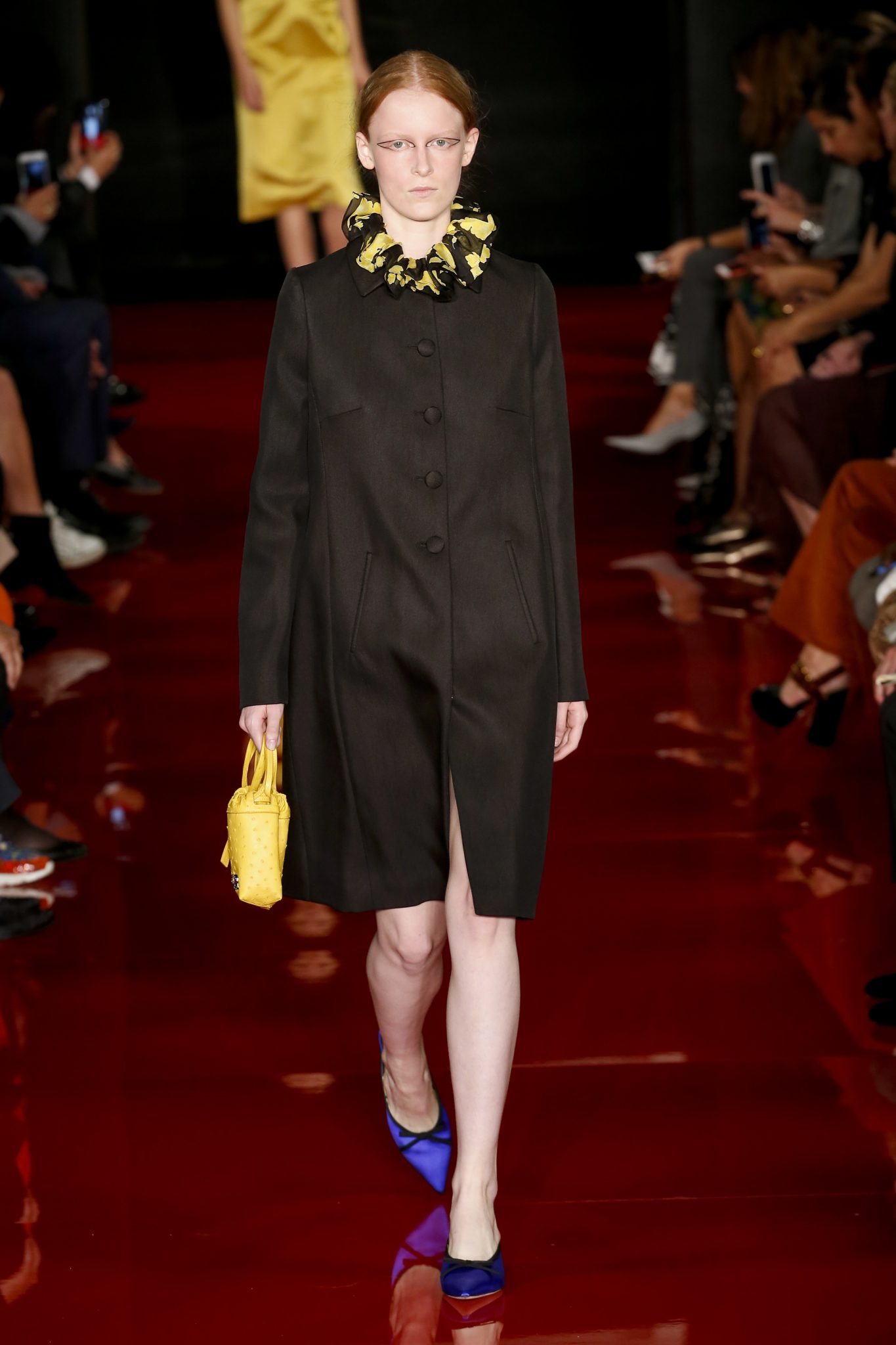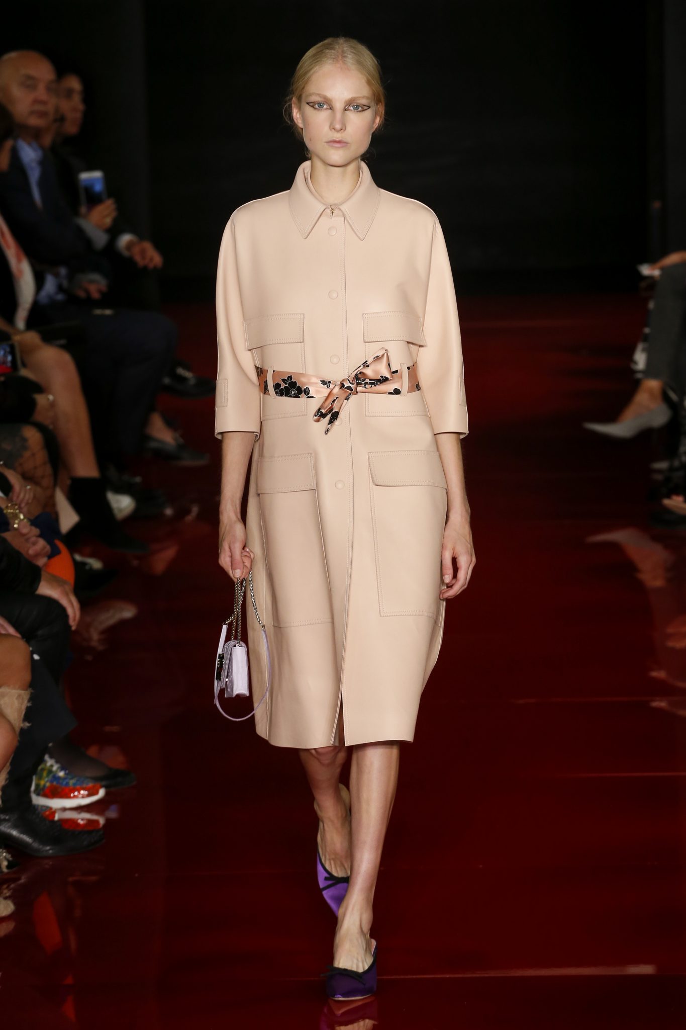 Les accessoires se font touches de couleur, abat-jours imaginaires qui éclairent l’intérieur à la tombée du jour. Des mules plates ou à talons mi-hauts de couleurs vives. Et des pochettes en accord avec la collection.