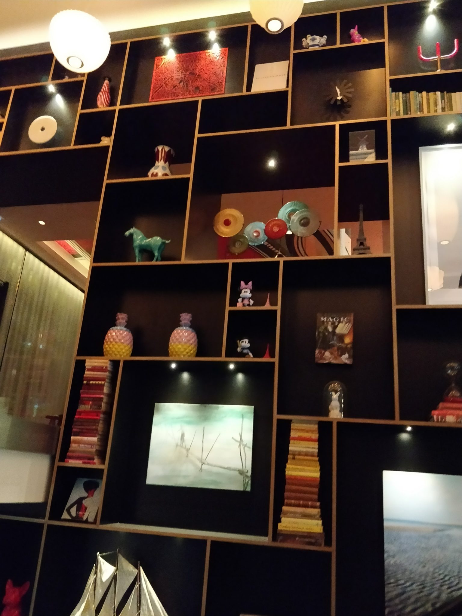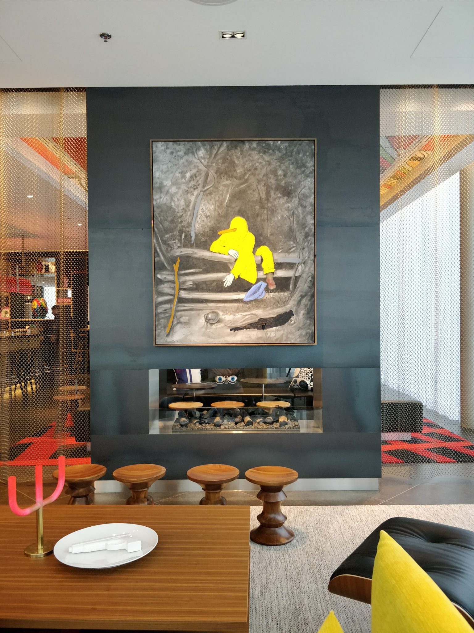 Différentes zones composent ce lobby : au centre une zone d’accueil amène au comptoir « auto check-in » juste à côté de CollectionM, un concept store qui propose des accessoires de voyage ludiques, des cadeaux inspirants et des livres d’art. Le mobilier soigneusement sélectionné chez Vitra, est une collection de pièces iconiques signées Jean Prouvé, Charles et Ray Eames, et Verner Panton. Des tables communales encouragent les interactions entre les hôtes, et des Macs en libre accès permettent de se connecter ou de surfer sur le net en toute simplicité. Ici encore le plafond se transforme en toile géante, avec une installation signée de l’artiste français Romain Froquet. De l’autre côté, des salons plus calmes et confortables accueillent les réunions entre amis, ou permettent de regarder la télévision et se détendre. Le bar et la cuisine ouverte forment le cœur animé des parties communes. Au sol, un tapis sur mesure joue de la beauté des immeubles de bureaux. Devant les ascenseurs qui mènent aux 175 chambres que compte l’hôtel, AVAST signe une autre œuvre monumentale, qui s’étend jusqu’au premier étage.