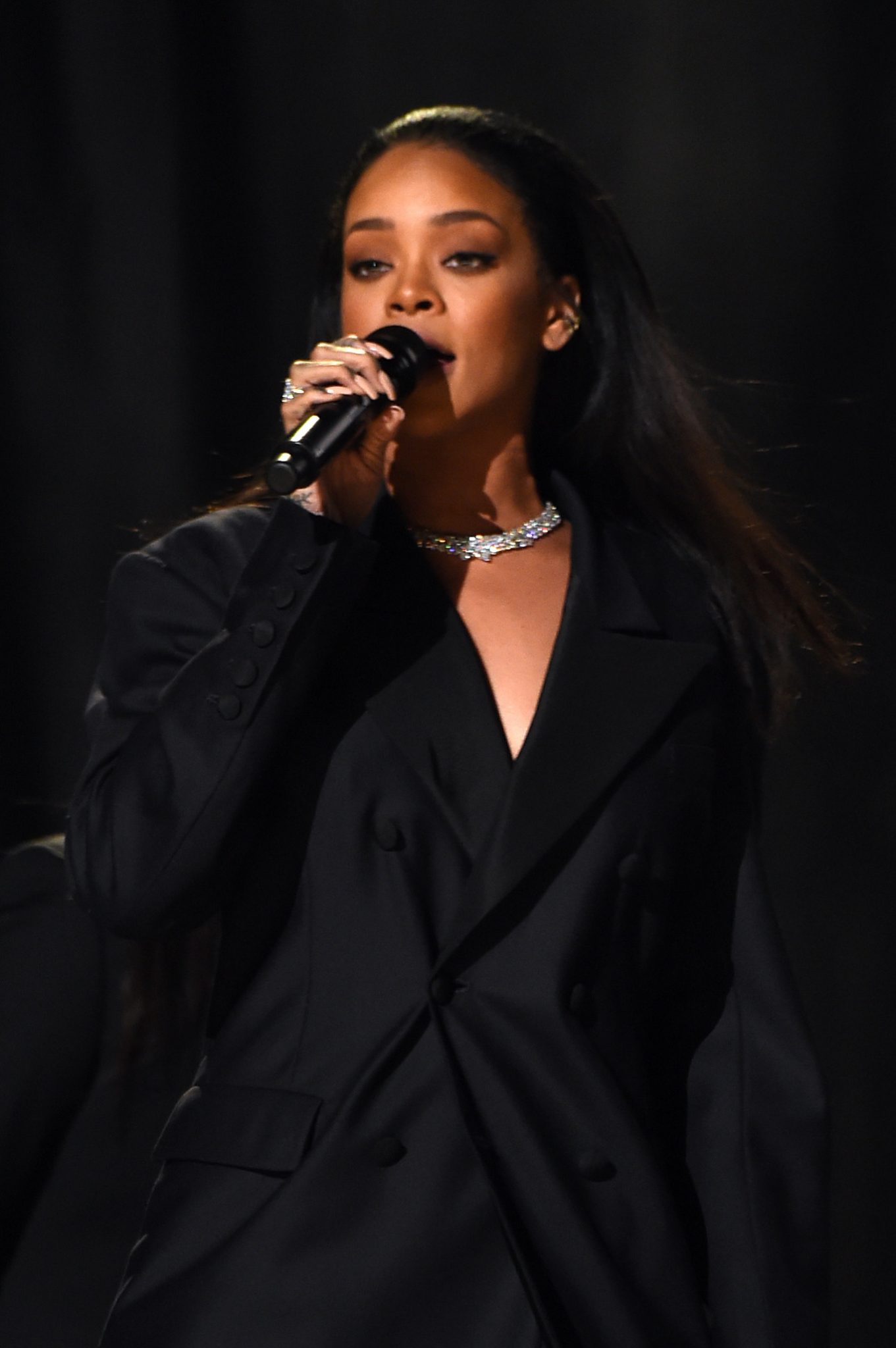 - LOS ANGELES, CA – FEBRUARY 08: Rihanna performs onstage at The 57th Annual GRAMMY Awards at the STAPLES Center on February 8, 2015 in Los Angeles, California. (Photo by Larry Busacca/Getty Images for NARAS)