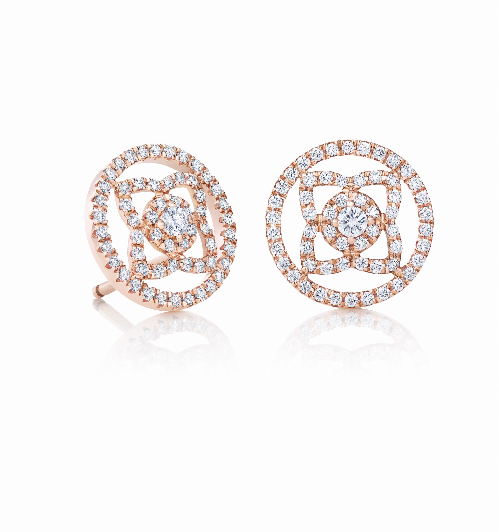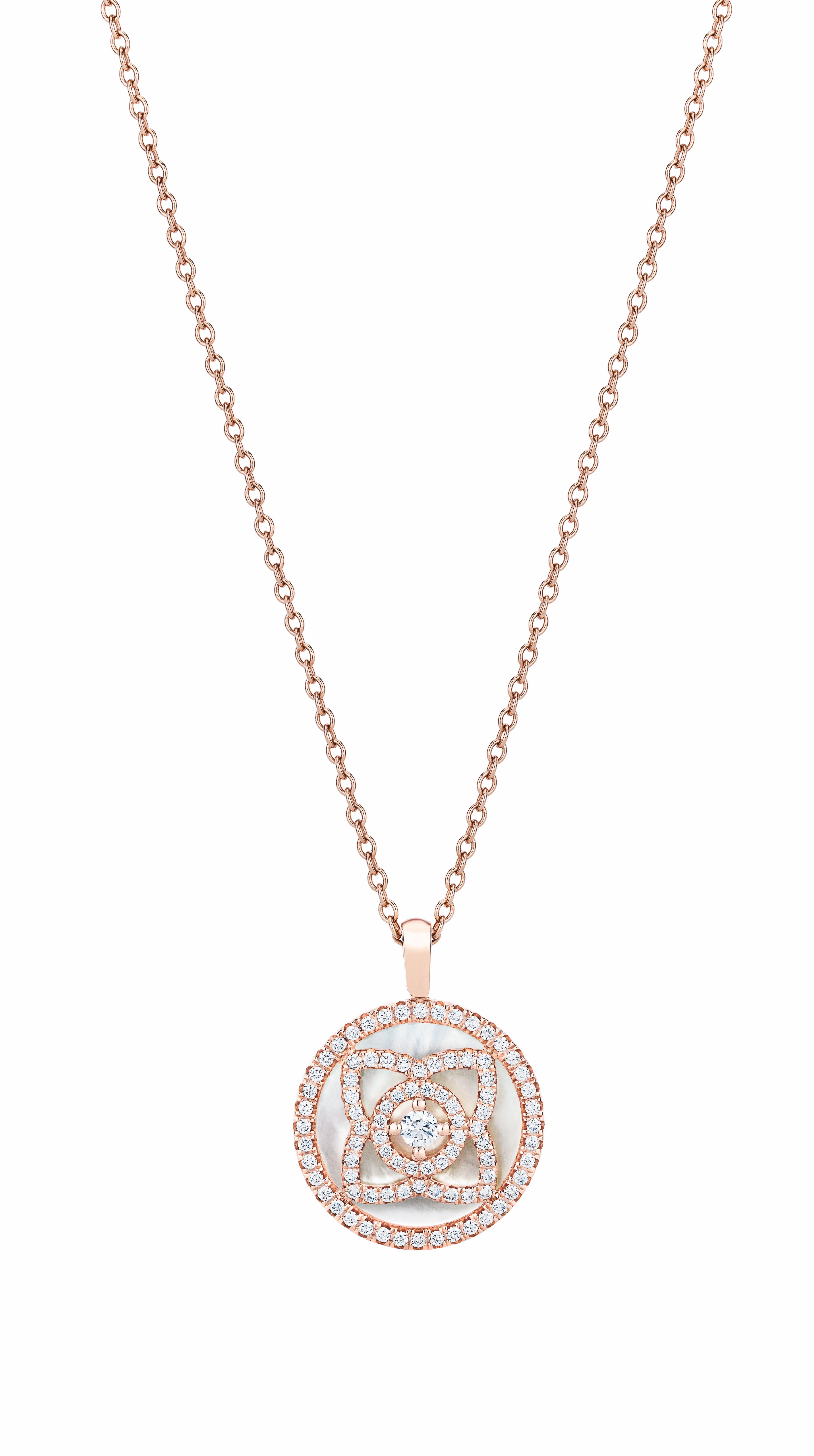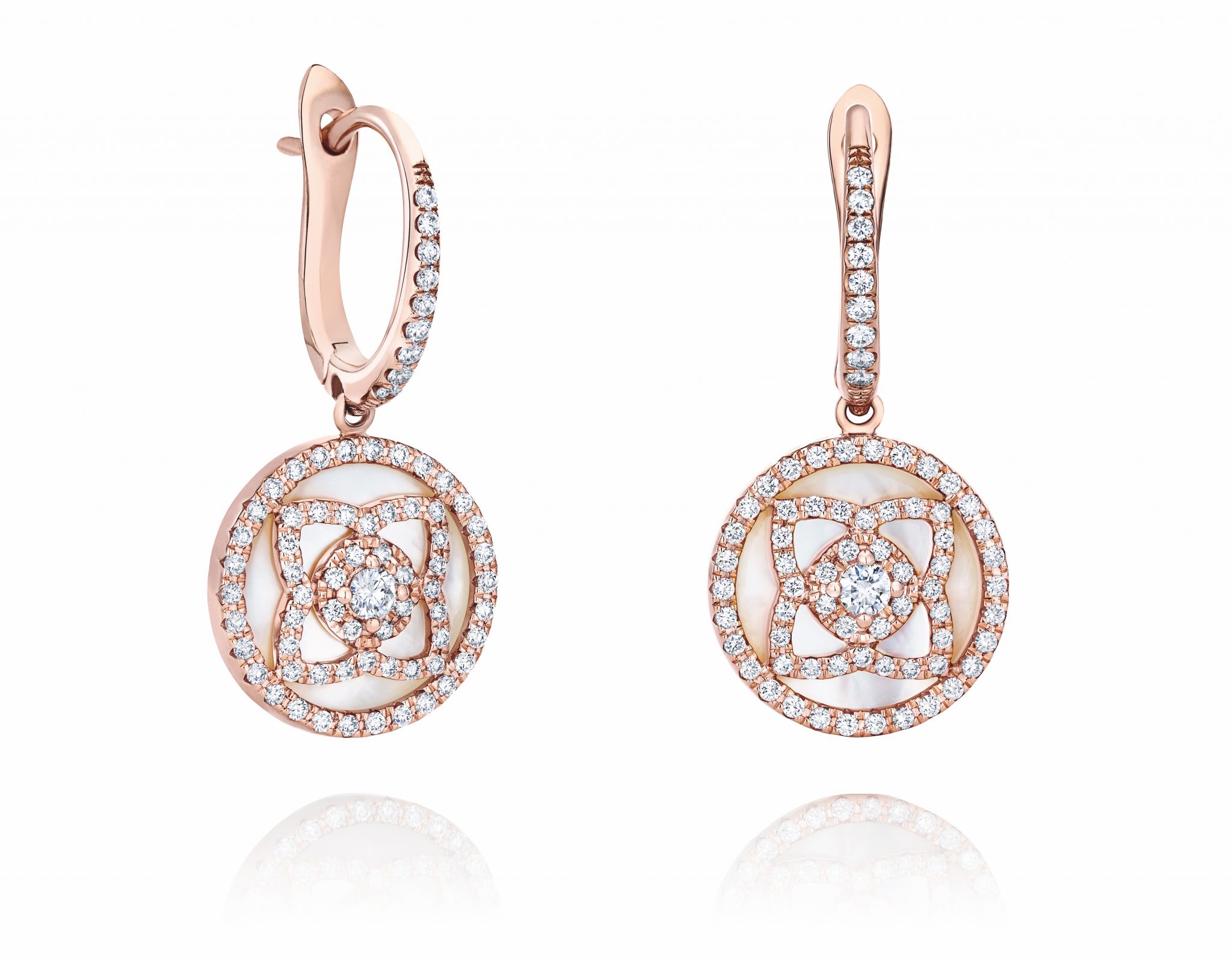 synergie unique de la fleur de lotus et du soleil. Parmi les pièces les plus importantes de cette collection iconique pour De Beers en 2017 : les pendentifs Enchanted Lotus, sertis de nacre et de pétales de diamants micropavés, et les boucles d’oreilles dormeuses Enchanted Lotus en or rose chaleureux