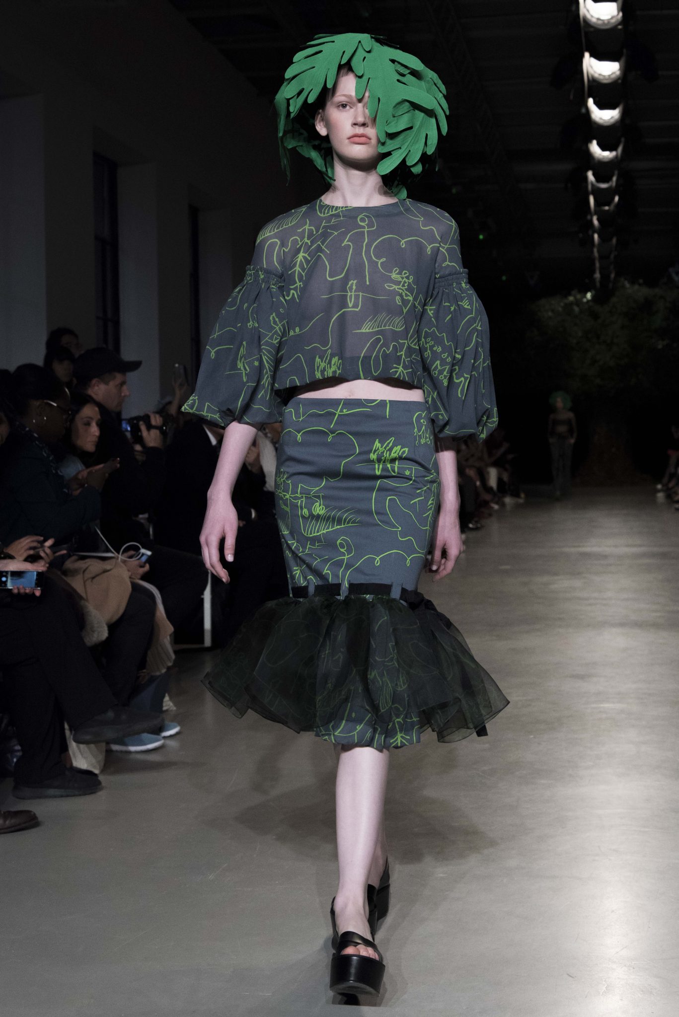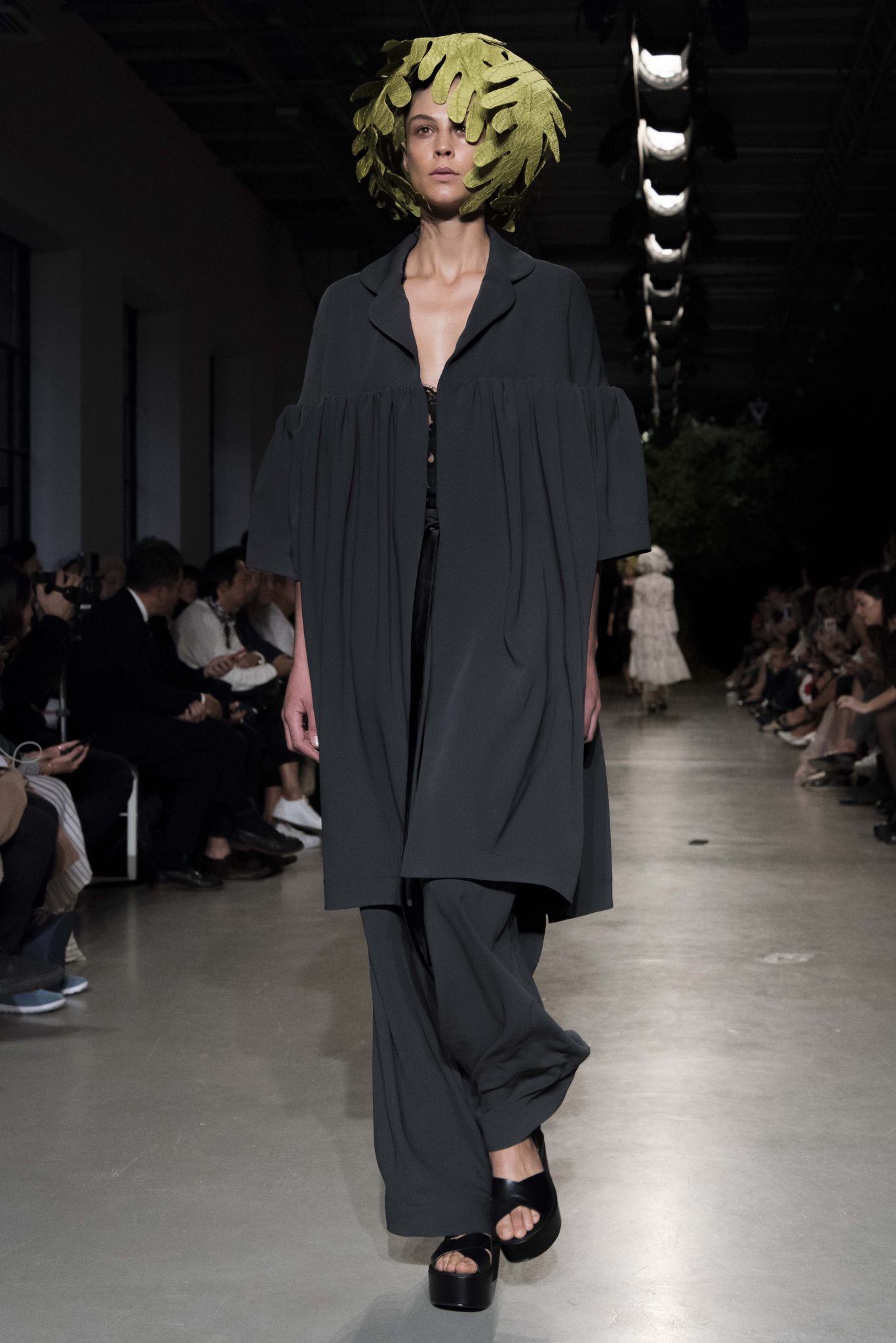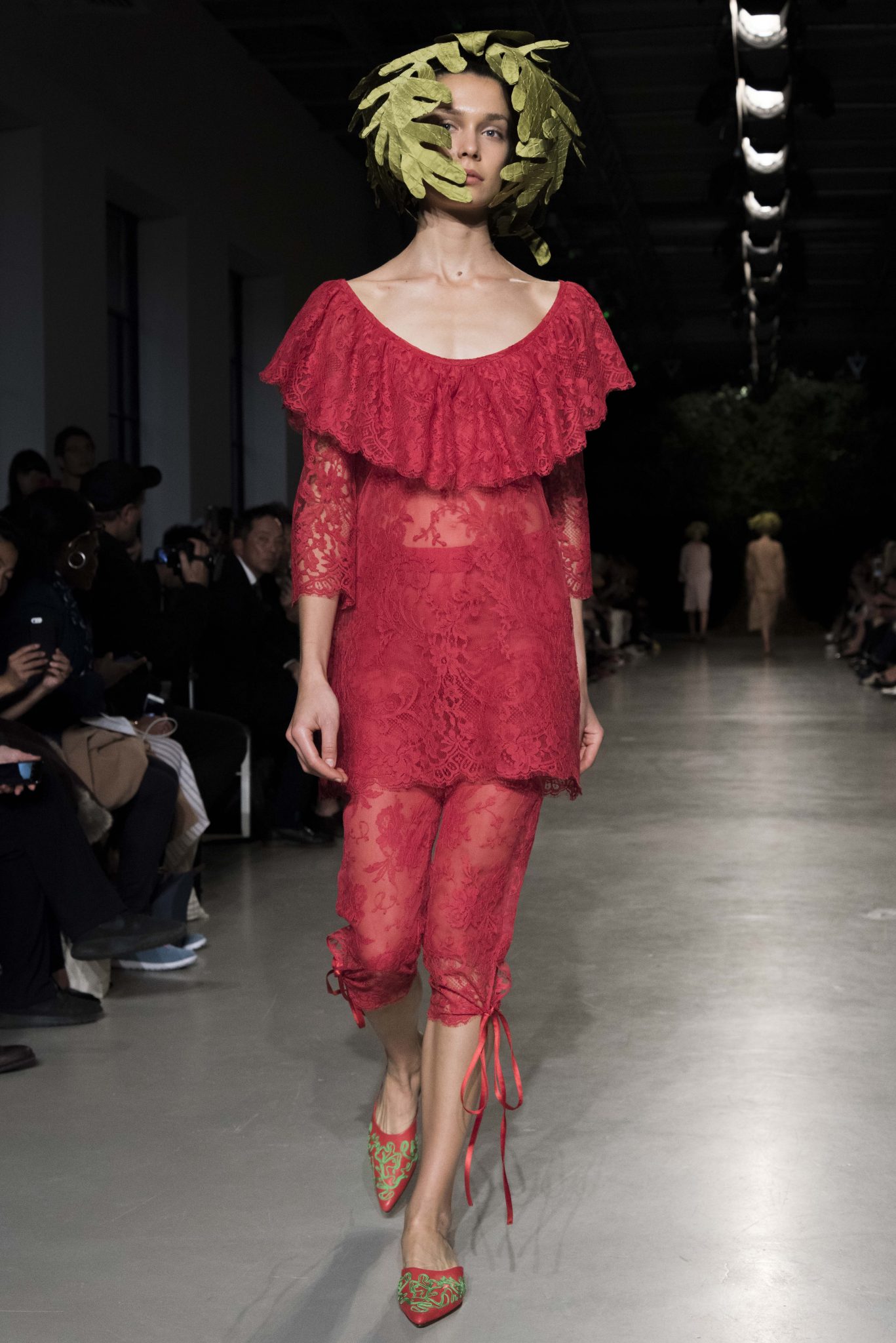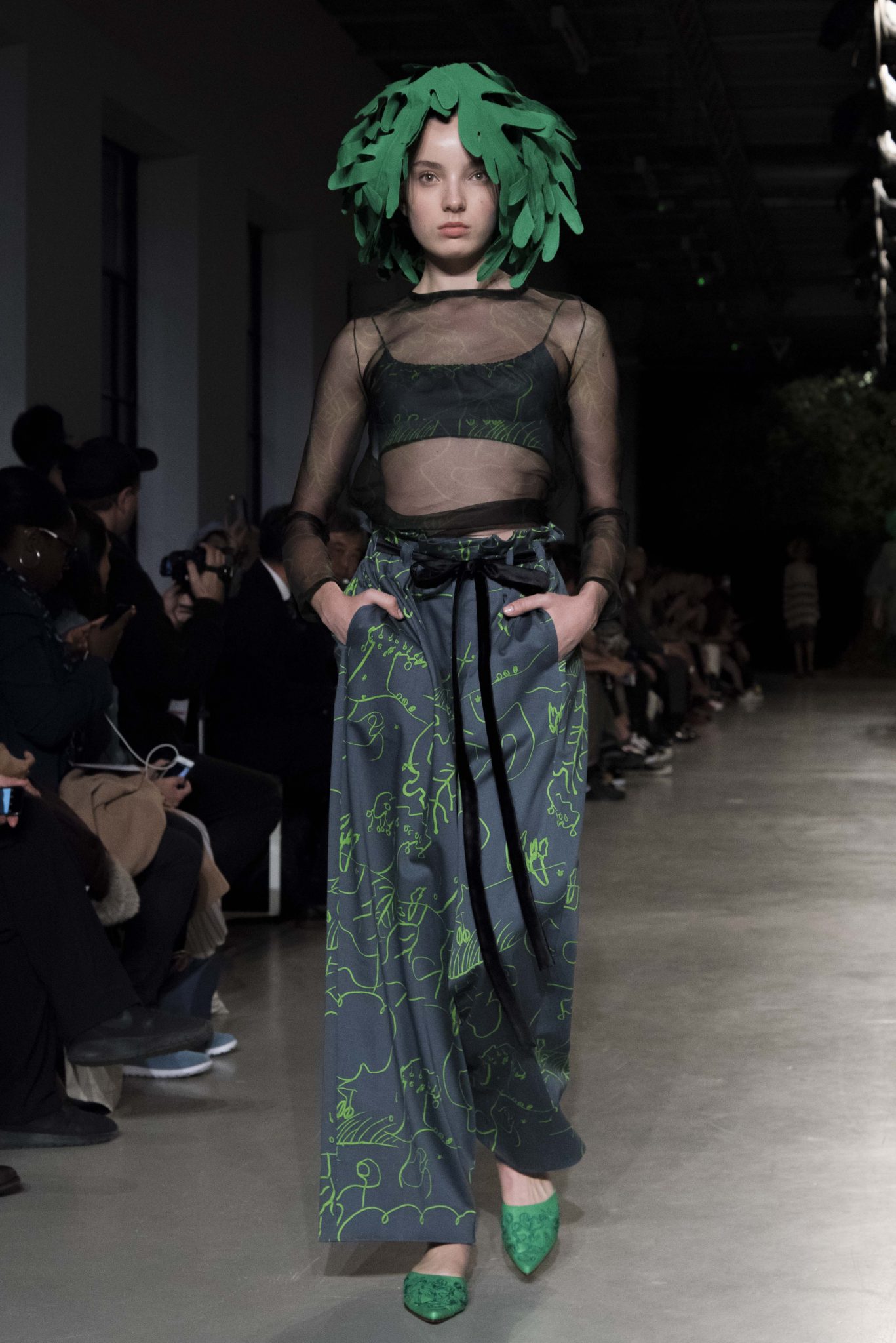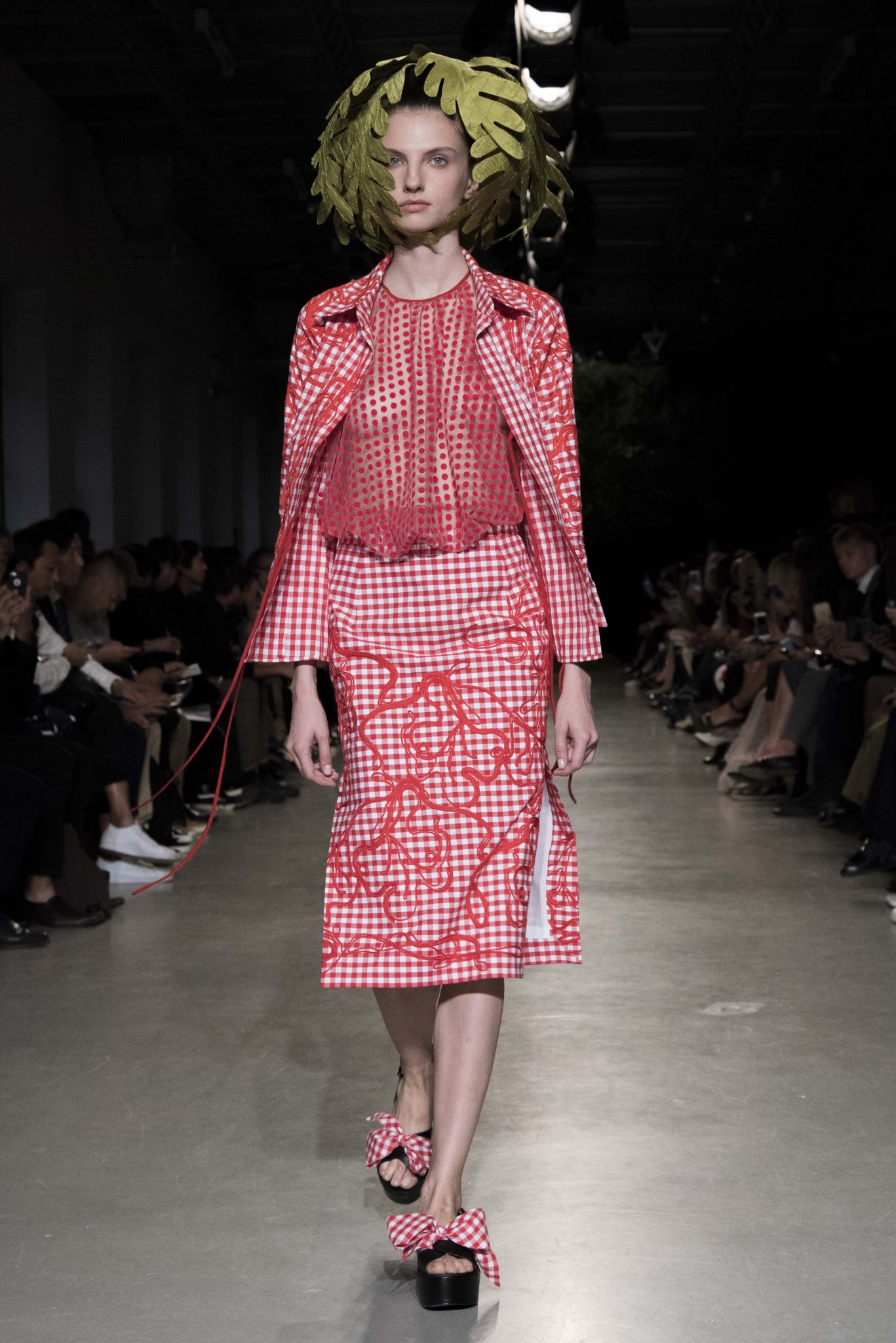 Fil vert de la collection, depuis le carton d’invitation, un arbre magique dessiné naïvement d’une main d’enfant, inspire, hante et envahit de broderies ou d’imprimés la collection. Engagée dans la mode comme dans la vie, Junko Shimada vit au rythme des saisons et s’émerveille du printemps qui vient. Puisant son énergie et sa créativité comme on embrasse un arbre, elle enracine son esprit frondeur et son chic alternatif dans une ode à une nature peuplée d’elfes et d’esprits mystérieux. Sous d’oniriques coiffes de feuilles géantes, les classiques twistent, les basiques jazzent, les robes dansent avec jubilation et les blouses pouffent d’un rire limpide et désinvolte. Dentelles noires, rouges ou chairs encanaillent les combinaisons de mécanos et vestes de jardiniers en crêpe fluide