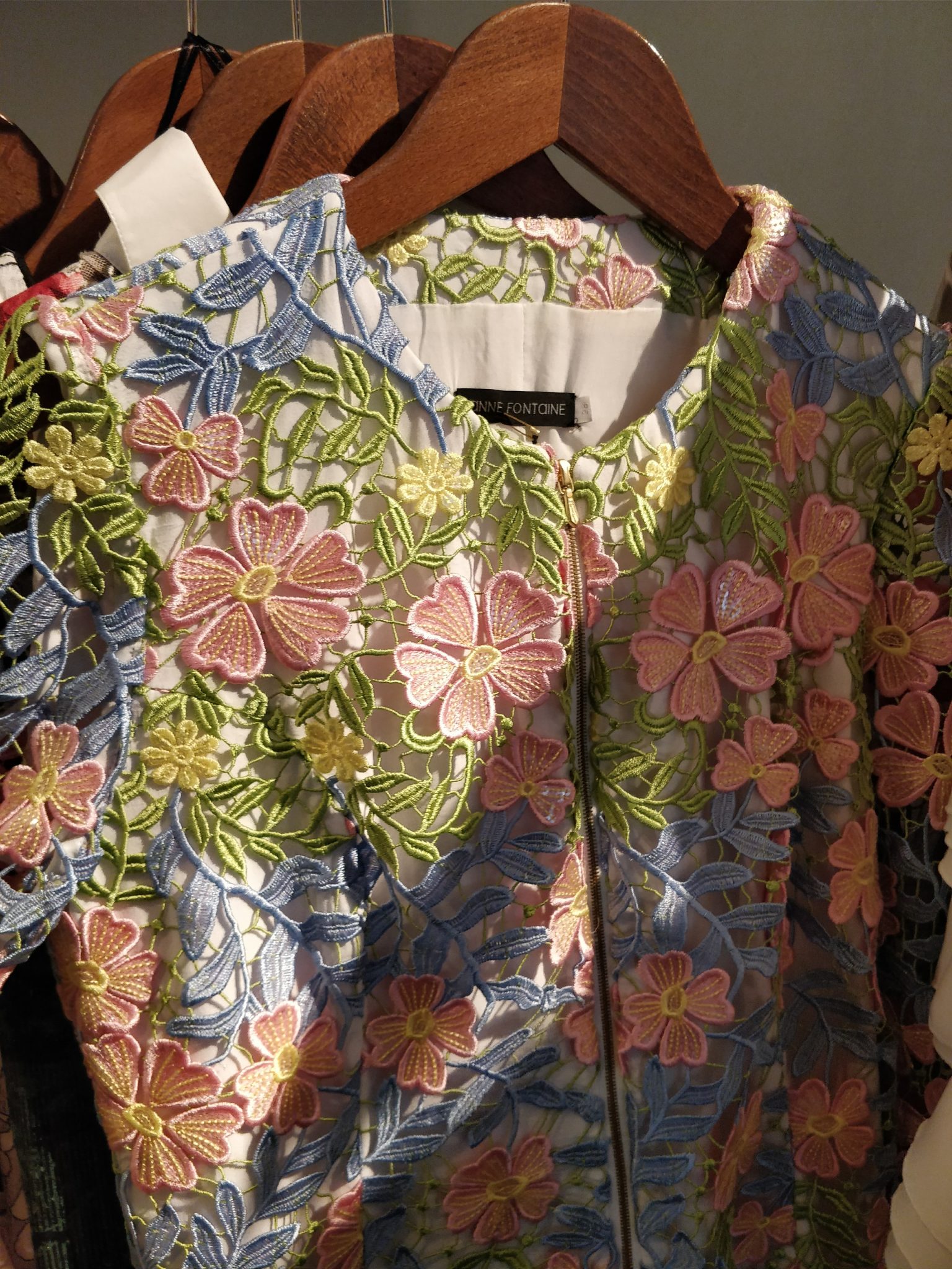 Des petites vestes esprit conquistador, aux jupes longues noires à dentelle, la créatrice nous fait voyager grâce à ses silhouettes fonds noirs aux roses rouges brodées, et ces jacquards aux tons sables légérement brillants Anne Fontaine nous plonge dans son Brasil natif en faisant la part belle aux verts, de l’emeraude au kaki, en passant par des imprimés floraux tropicaux