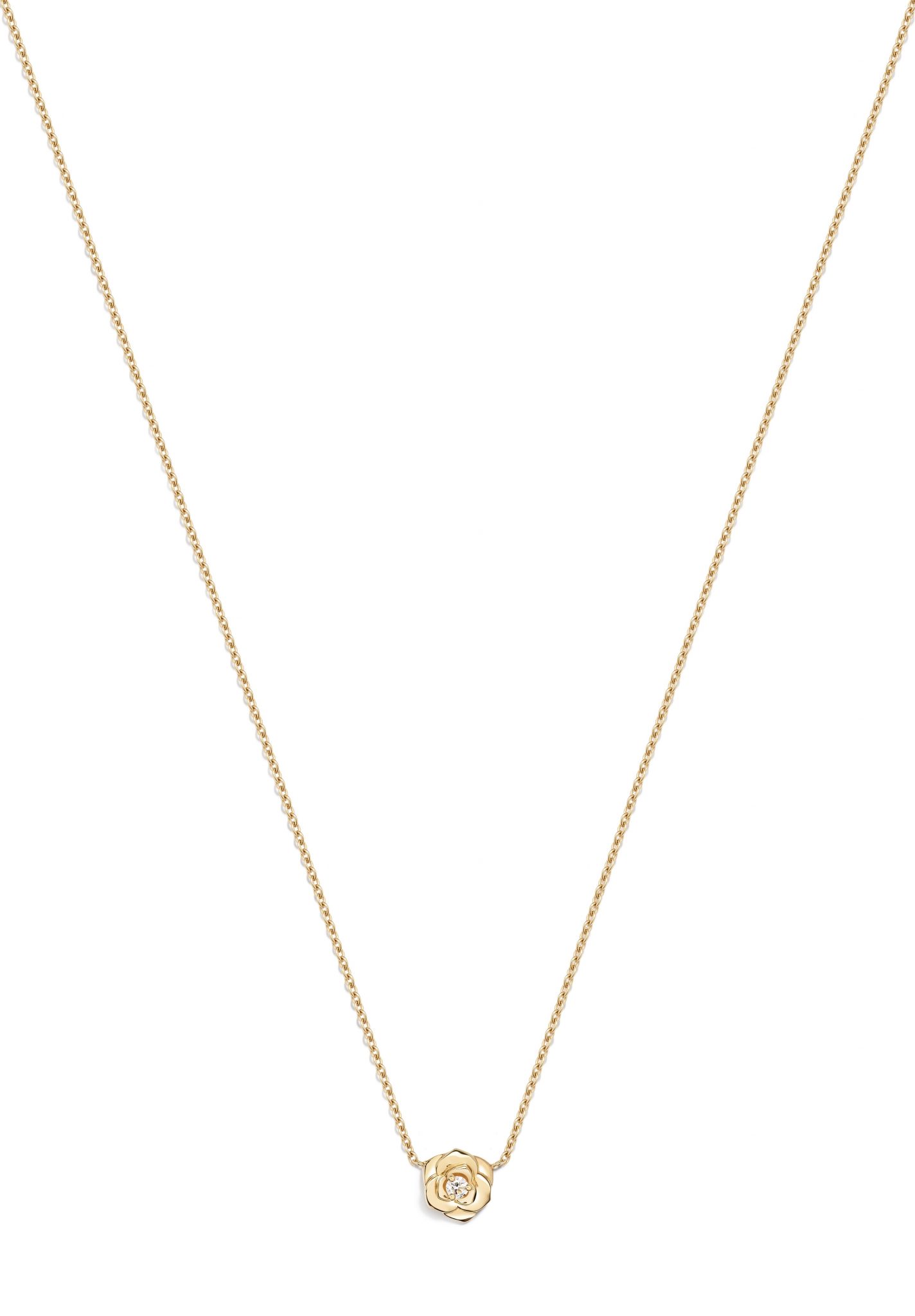 Parée d’or rose, la reine des fleurs ne se fane jamais; elle brille de mille feux. Autour de son cou, une rose généreuse déploie ses pétales pour révéler un diamant scintillant (G33U0960).