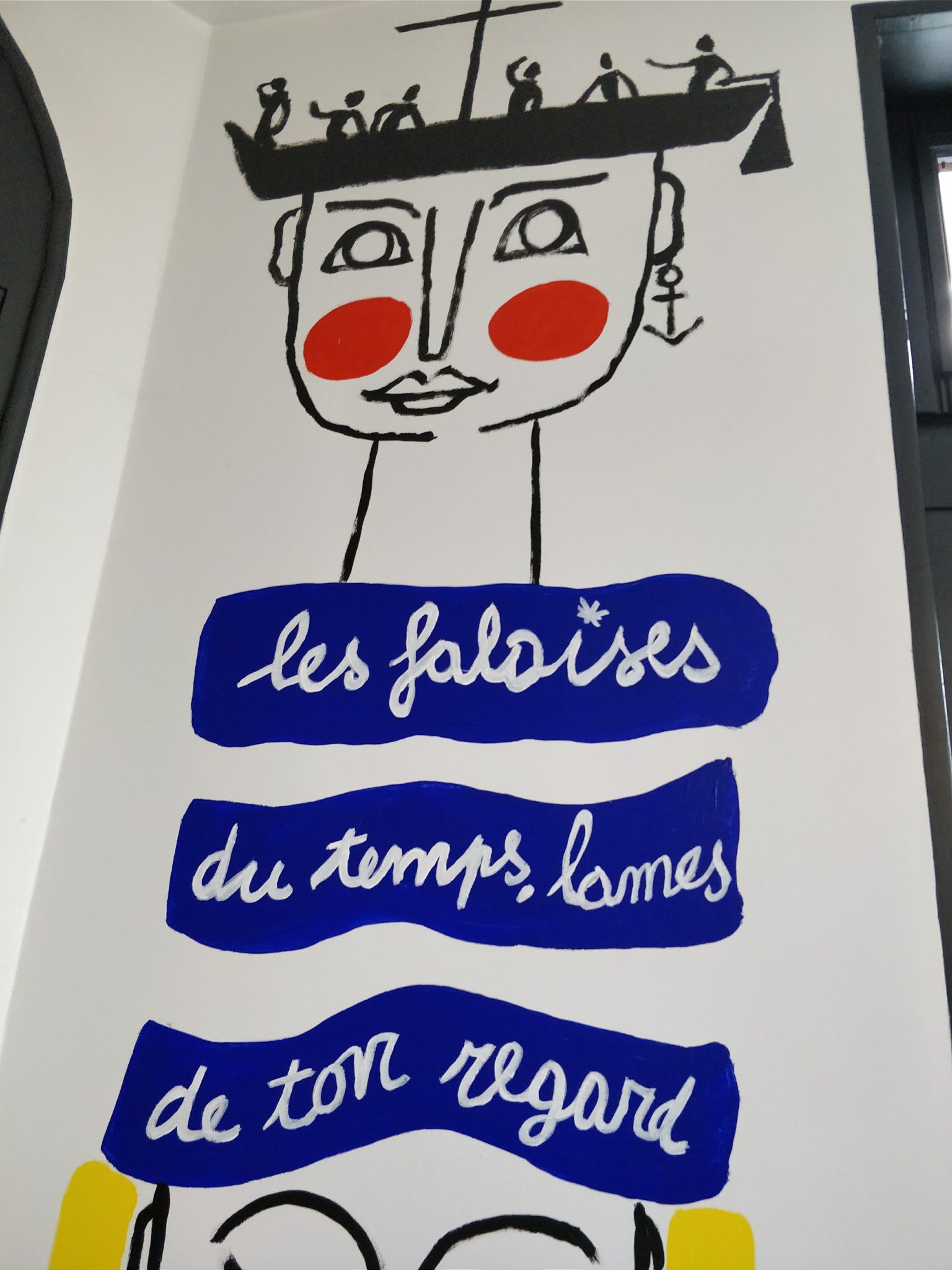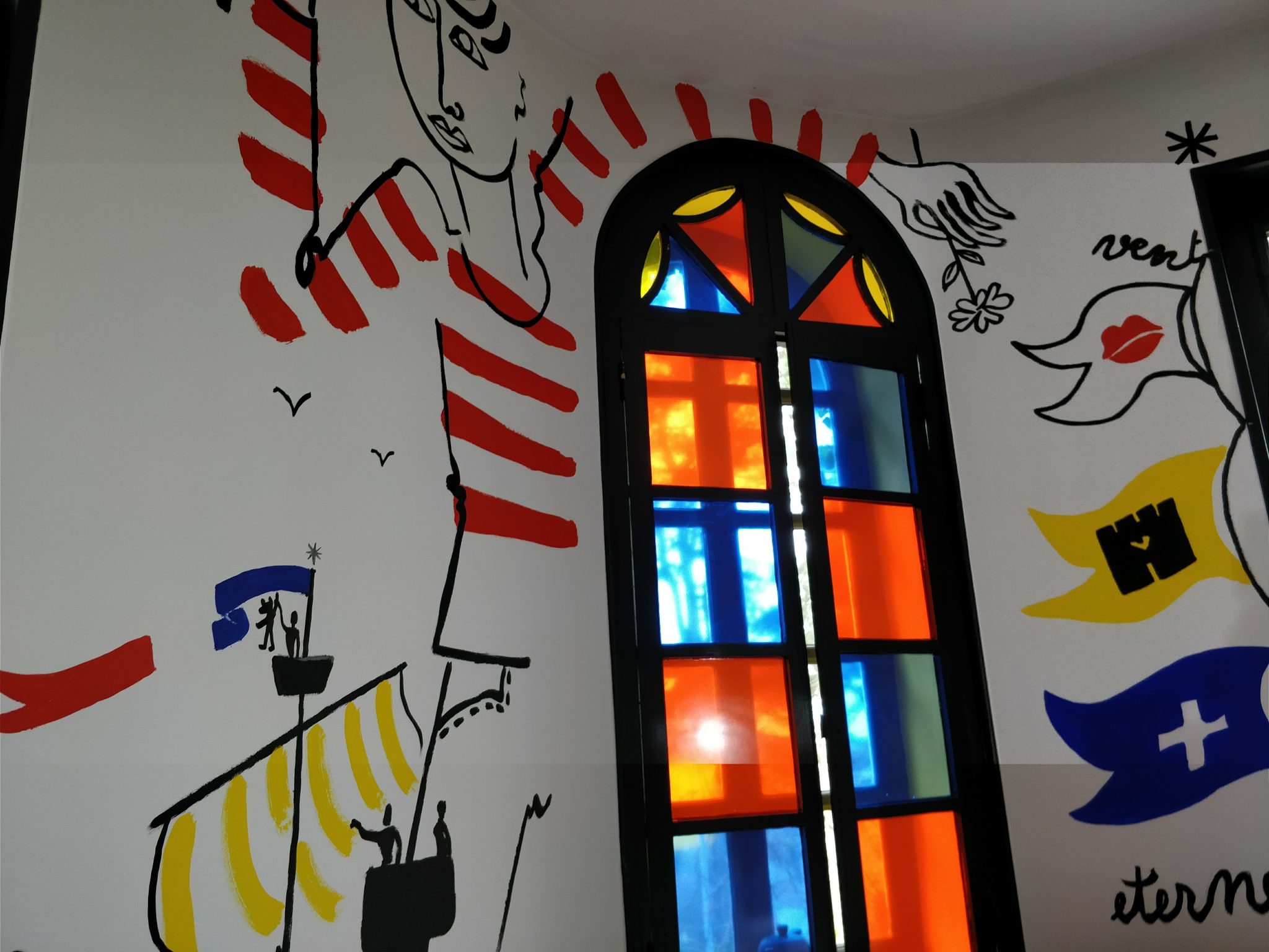 Intitulée « Dans le sillage de deux mains », la fresque reprend la gamme de tons minimalistes de base, rouge, jaune et bleu, chère à Jean-Charles de Castelbajac. Une inspiration graphique puisée dans les souvenirs de l’artiste.