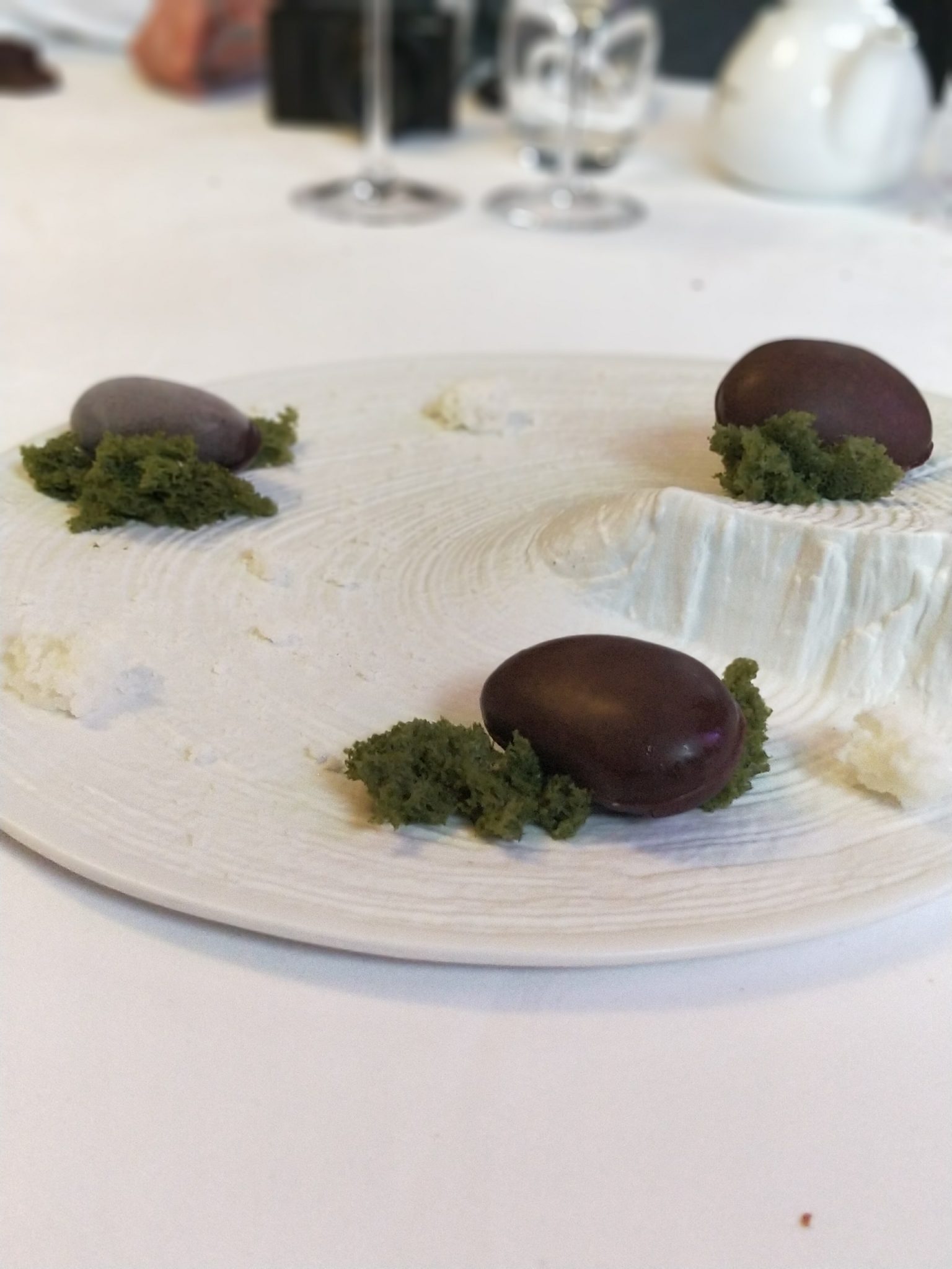 On y retrouve les galets ronds de la plage, les algues et l’écume de la mer, le tout posé sur une assiette blanche qui reproduit l’aplomb de la falaise.